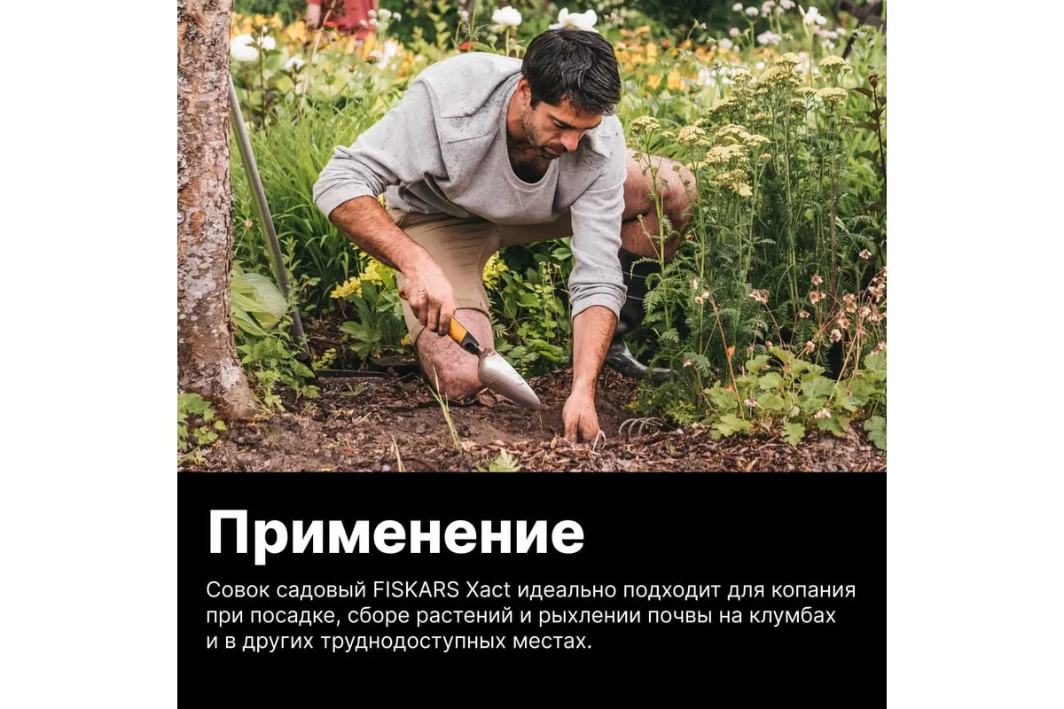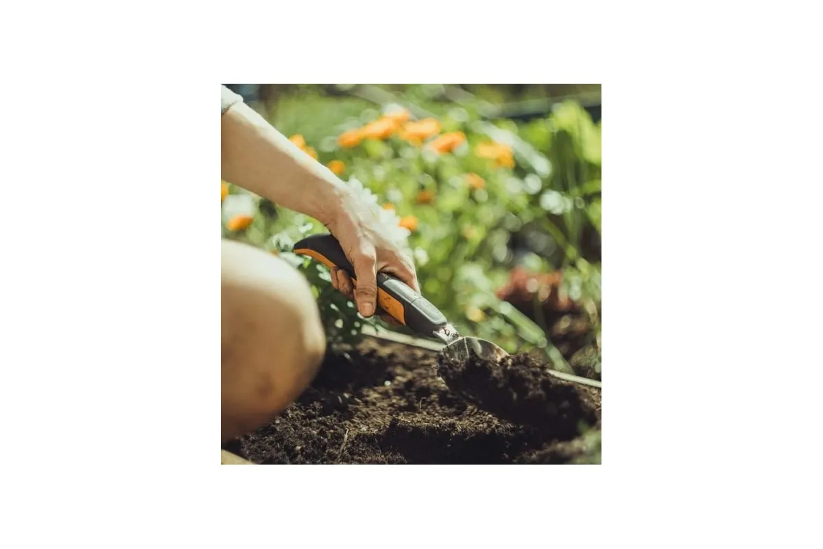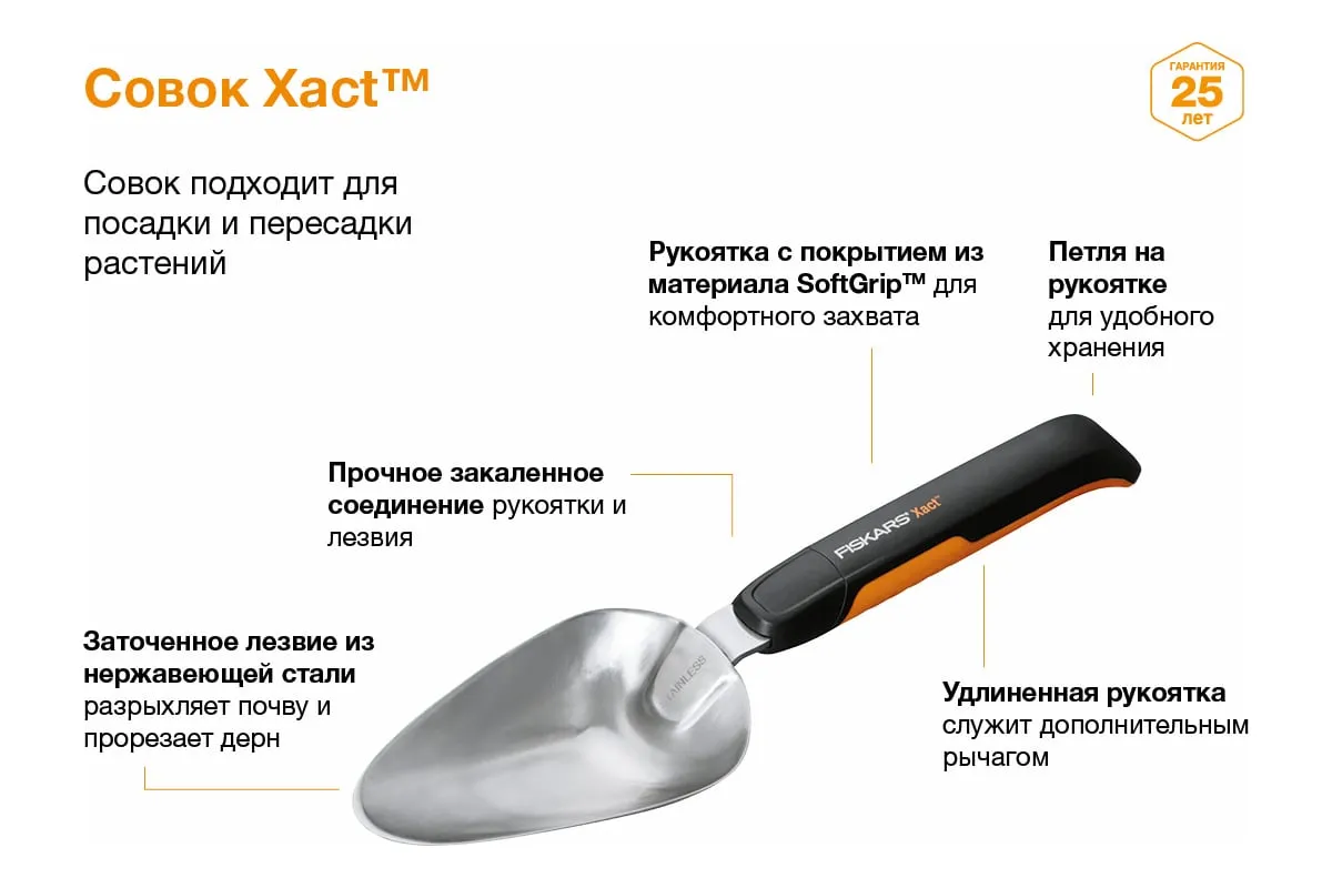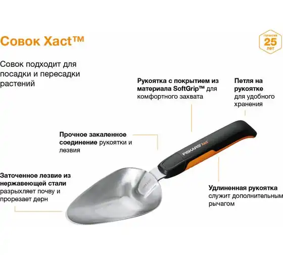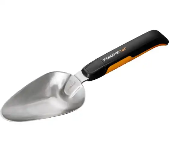 Совок FISKARS Xact 1027043 используется для обработки почвы при посадке и пересадке растений, а также при культивации и уходу. Инструмент имеет заточенное лезвие из нержавеющей стали, поэтому можно справиться с обработкой самой жёсткой почвы.