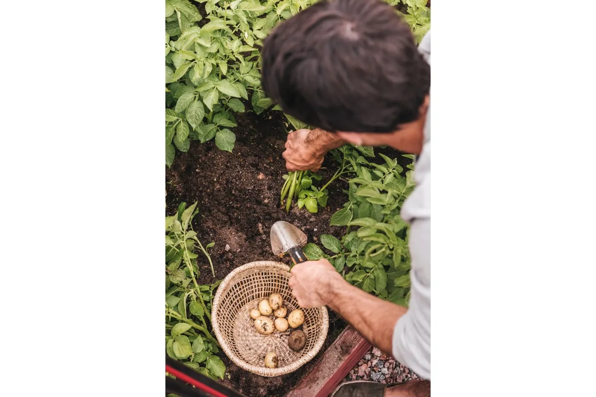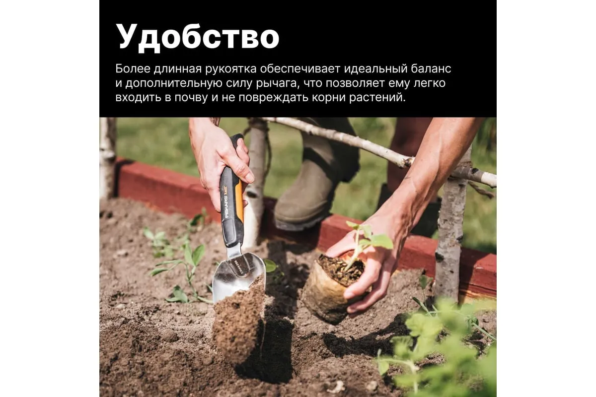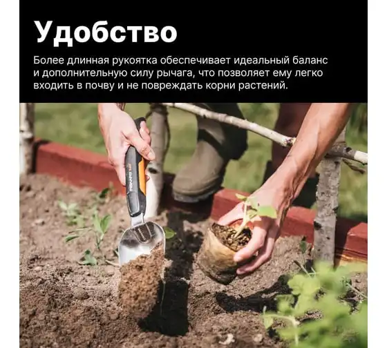 Совок имеет удлиненную рукоятку, что способствует эффективной и комфортной работе в саду.