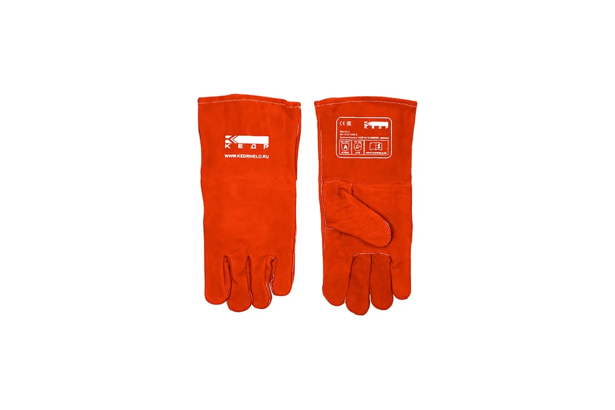 Спилковые краги Кедр КС-12 КЕВЛАР красные 8005387 обладают усиленной жаростойкостью, стойкостью к прорезанию и к открытому пламени (до 25 секунд).