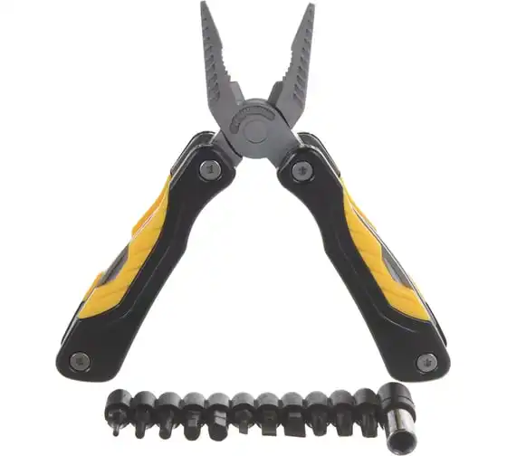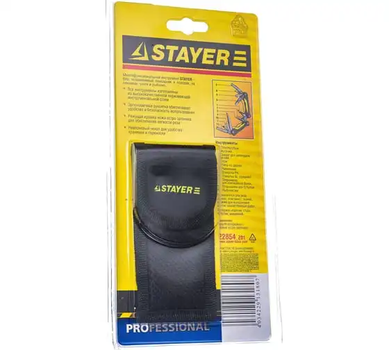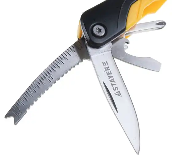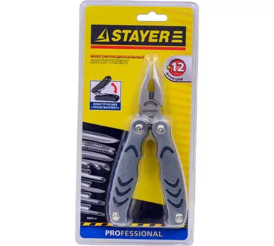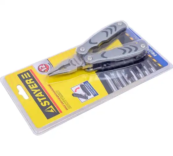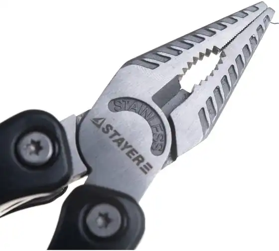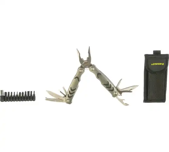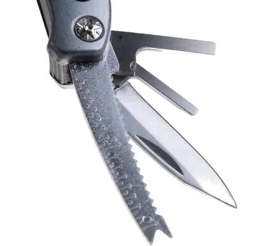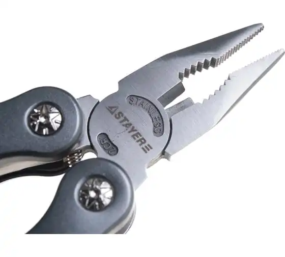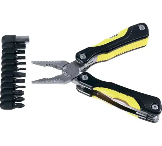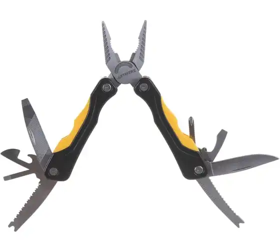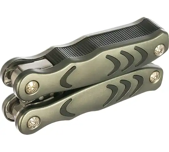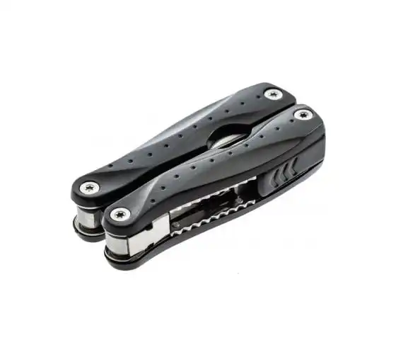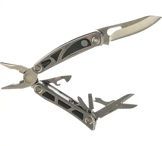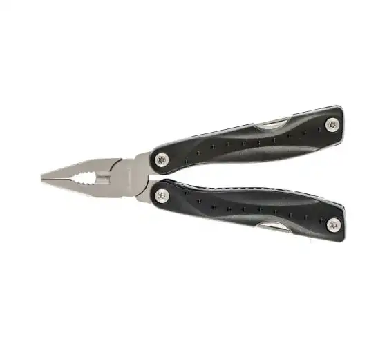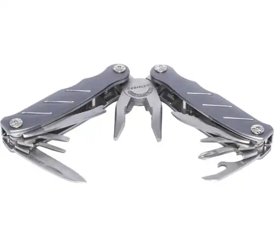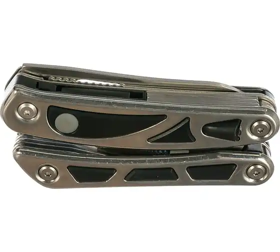 Функции:длинногубцы, захват для удерживания полукруглых предметов, кусачки, две открывалки (для бутылок и банок), пилка для ногтей двусторонняя, пила, нож, кр