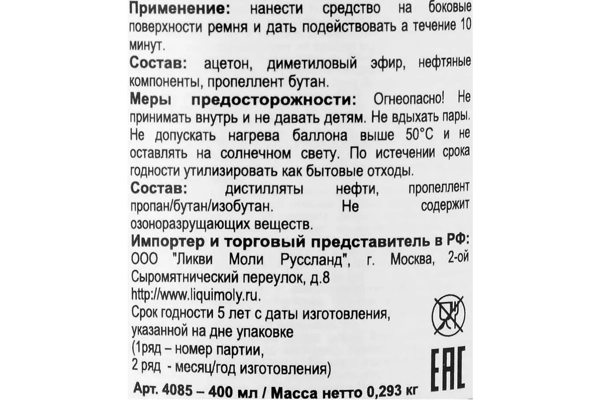 Внимание, спрей запрещается использовать для обработки ремней зубчатого типа, входящих в состав приводного газораспределительного механизма (ГРМ)!