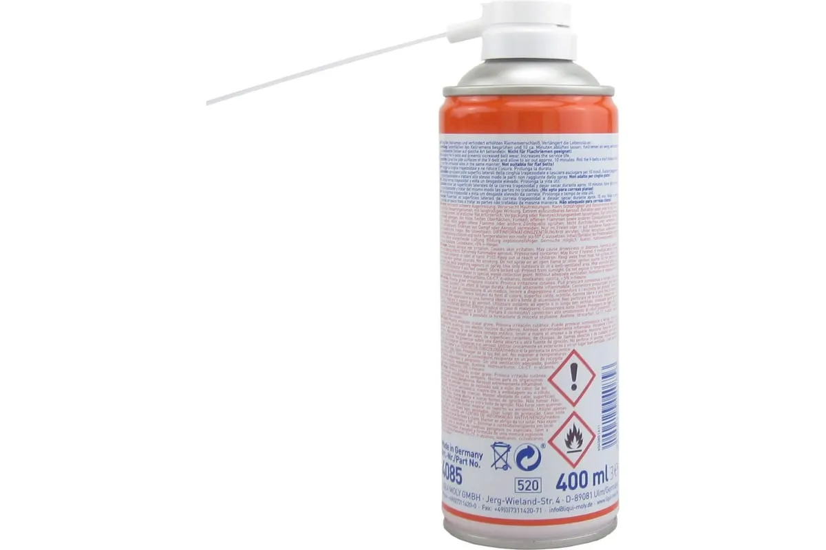 Спрей для клинового ремня, 0.4л LIQUI MOLY Keilriemen-Spray 4085 представляет собой сочетание биологически активных веществ, которые эффективно проникают в поверхность ремня, тем самым предупреждая его пересыхание и растрескивание. Благодаря использованию данного состава, пользователь может быстро и без дорогостоящего демонтажа избавиться от проскальзывания приводных ремней, продлить срок эксплуатации шкивов, а также устранить неприятные шумы, возникающие при работе приводных агрегатов.