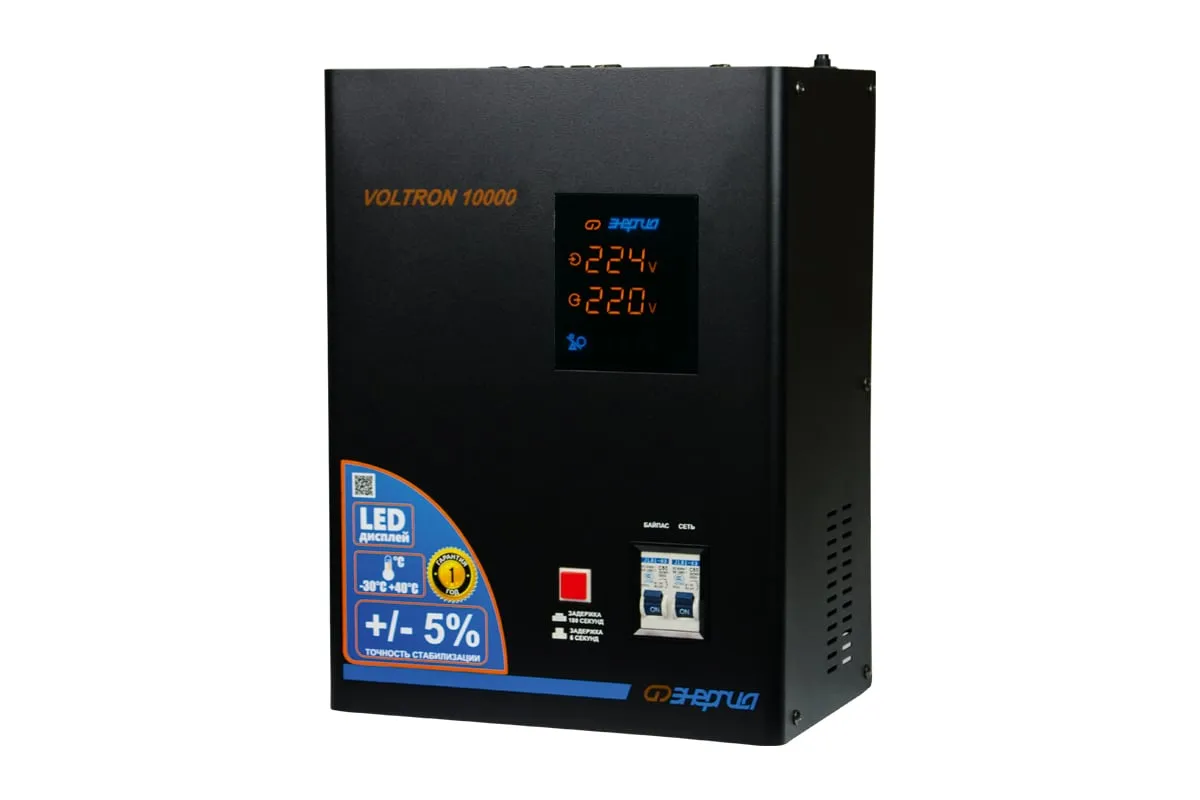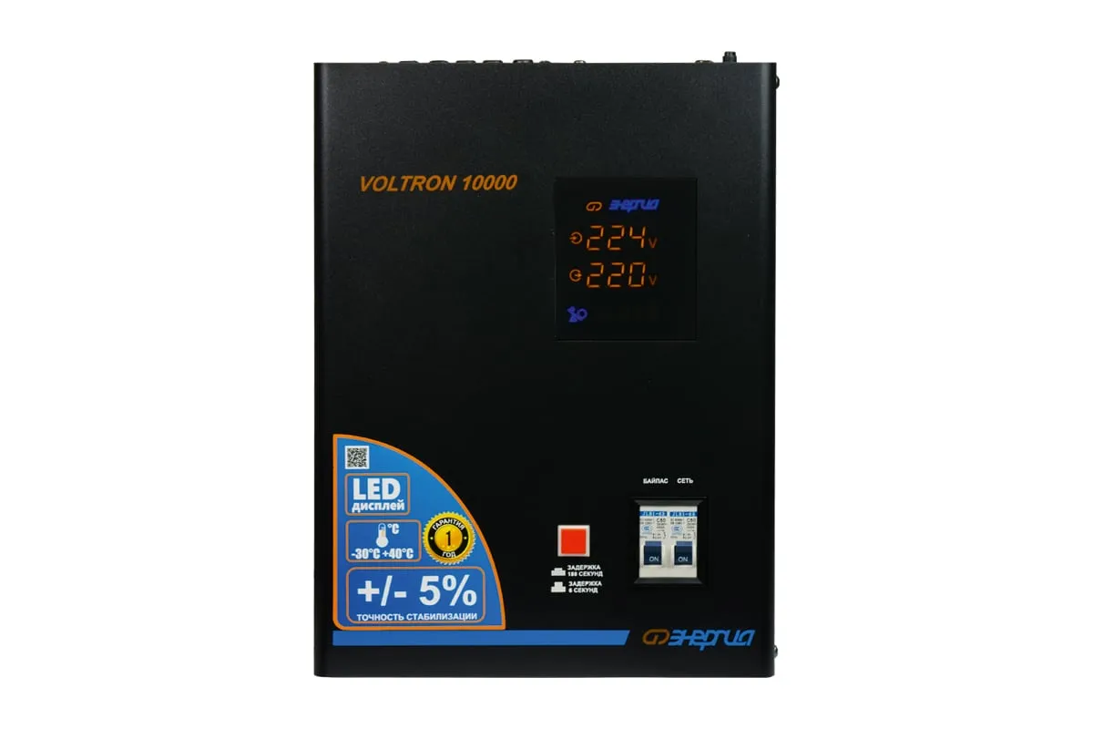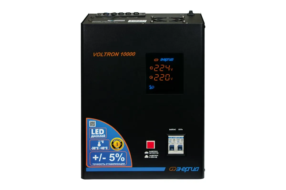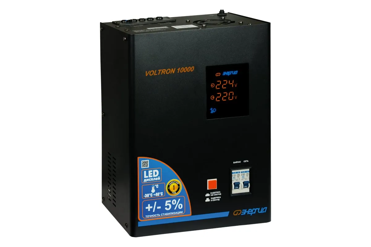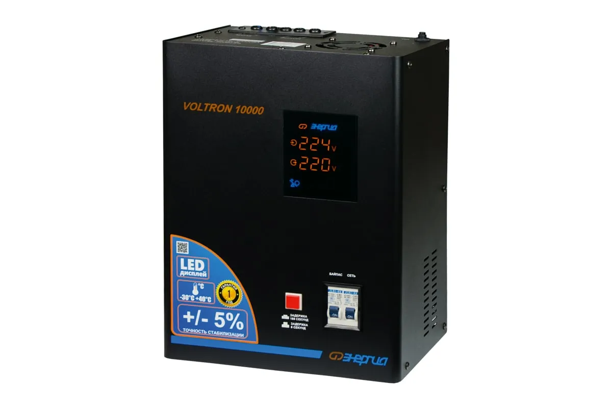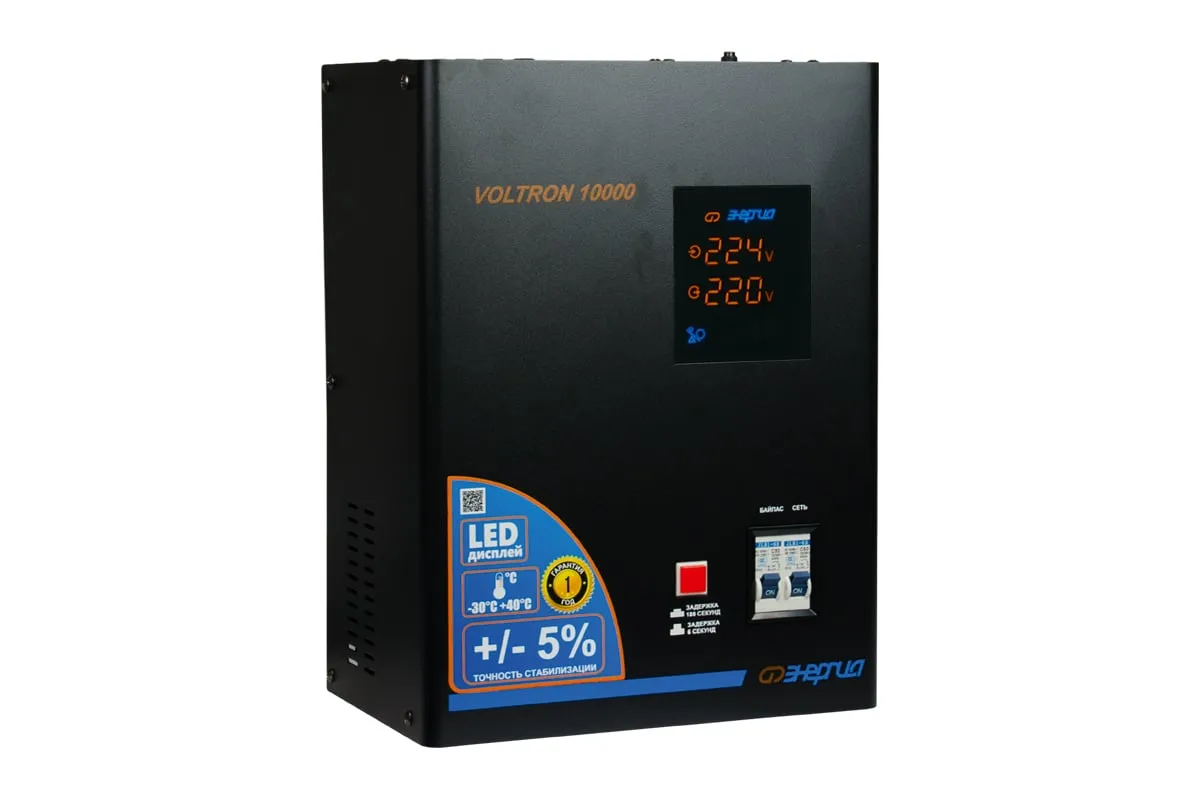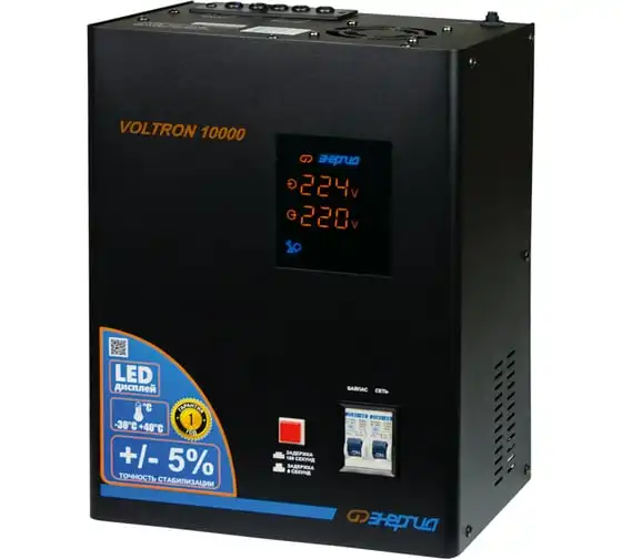 Стабилизатор Энергия VOLTRON - 10 000 Voltron 5% Е0101-0160 - эргономичная и простая в управлении модель для защиты высокочувствительной техники от перепадов напряжения в питающей сети. Прибор отличается высокой точностью стабилизации, погрешность составляет всего 5%. Активно применяется в загородном доме, на даче или офисе. Стабилизатор легко крепится к стене или удобно устанавливается на поверхности. Подключение нагрузки и сети осуществляется при помощи клеммной колодки. Модель отличается простотой применения и не требует специального технического обслуживания.