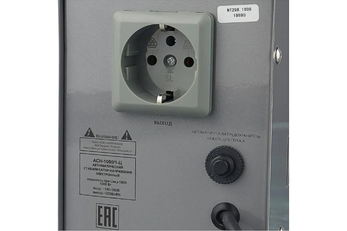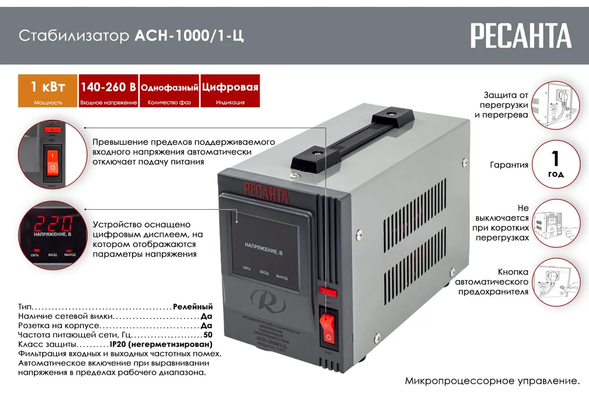 Ресанта АСН-1000/1-Ц снабжен одной розеткой для подключения электроприбора с общей мощностью не более 1000 Вт. Предназначен для эксплуатации внутри помещения при температуре в диапазоне от -10 до +40 градусов. Класс защиты устройства IP20.