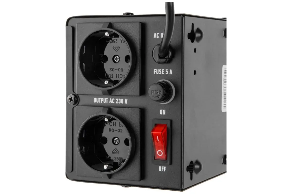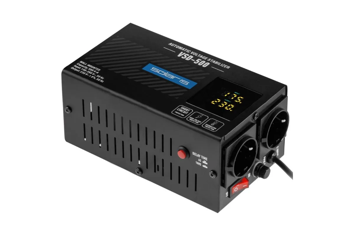 Стабилизатор напряжения SOLARIS VSD-500 (SL4510-1) представляет собой надежное устройство, предназначенное для защиты электрических приборов от колебаний напряжения. С максимальной выходной мощностью 500 В*А, он идеально подходит для использования в домашних условиях и малых офисах. Диапазон входных напряжений от 140 до 260 В. КПД стабилизатора при токе нагрузки 80% составляет не менее 98%, а номинальный ток плавкого предохранителя – 8 А. Устройство гарантирует стабильное выходное напряжение в пределах 230 В ± 8%. Электронное управление обеспечивает высокую точность стабилизации выходного напряжения. Пассивная система охлаждения у модели пассивная, для долговечной и тихой работы. 2 розетки двумя для подключения нескольких приборов одновременно. Имеются цифровые индикаторы входного и выходного напряжений. Защита от перегрева, перегрузки, недо- и перенапряжения. Задержка запуска с возможностью выбора времени: 6 секунд или 180 секунд. Это позволяет избежать резких скачков напряжения при включении, что особенно важно для чувствительных устройств. В комплект поставки входит монтажная схема для разметки на стене, что упрощает установку и обеспечивает надежное крепление устройства. Рабочая температура устройства варьируется от 0 до +40°C, а относительная влажность может достигать 80%, что делает его универсальным решением для различных условий эксплуатации. Размеры и вес стабилизатора делают его достаточно компактным и легким для установки на стене или в любом удобном месте.