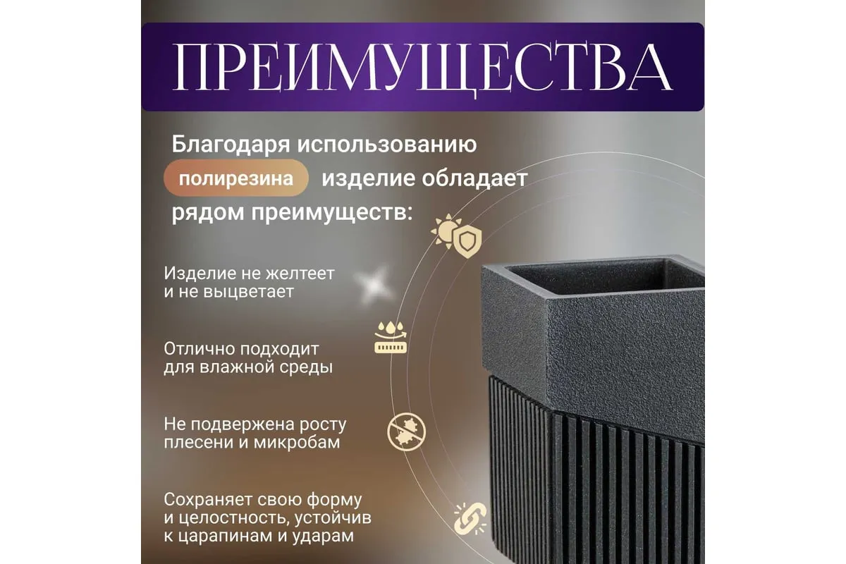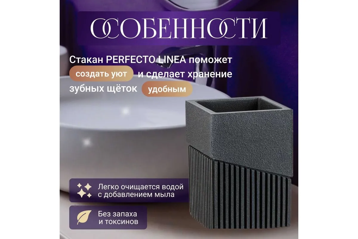 Стакан PERFECTO LINEA Element черный 35-618303 обладает необычным дизайном, созданным с помощью композитного материала: полирезина под натуральный камень. Благодаря такой структуре изделие имеет низкую теплопроводность, приятное на ощупь, а также устойчиво к влаге и повышенным температурам.
