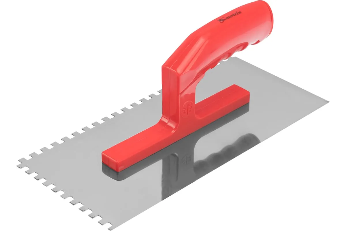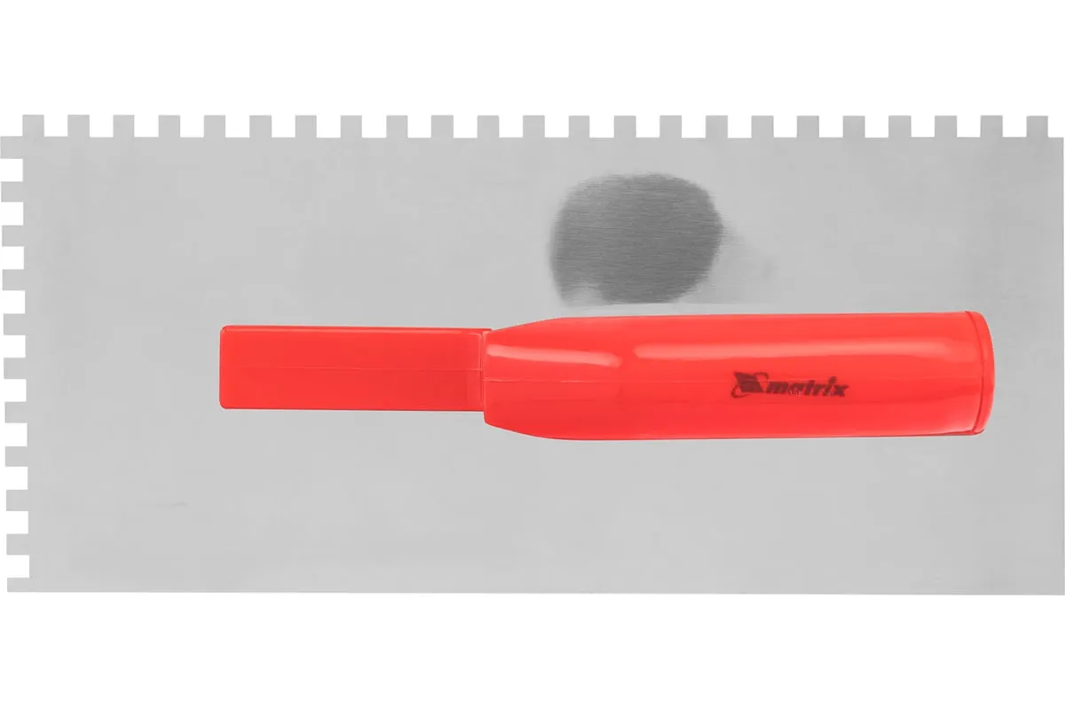Стальная гладилка Matrix 86775 размером 280 x 130 мм, с зеркальной полировкой и пластмассовой ручкой, предназначена для равномерного распределения штукатурных растворов и клеевых составов по поверхности. Используется во время проведения отделочных работ.