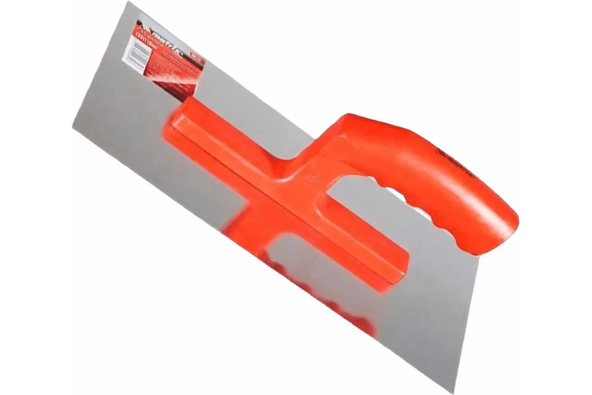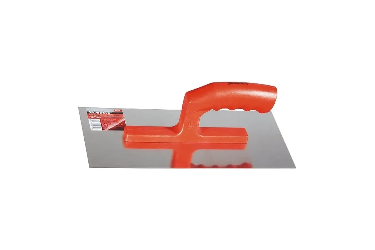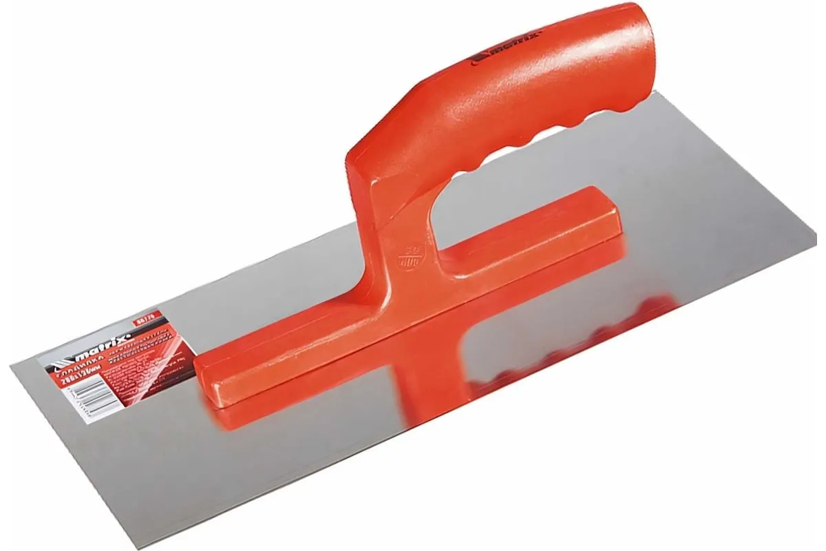 Стальная гладилка Matrix 86774 размером 280 x 130 мм, с зеркальной полировкой и пластмассовой ручкой, предназначена для равномерного распределения штукатурных растворов и клеевых составов по поверхности. Используется во время проведения отделочных работ.