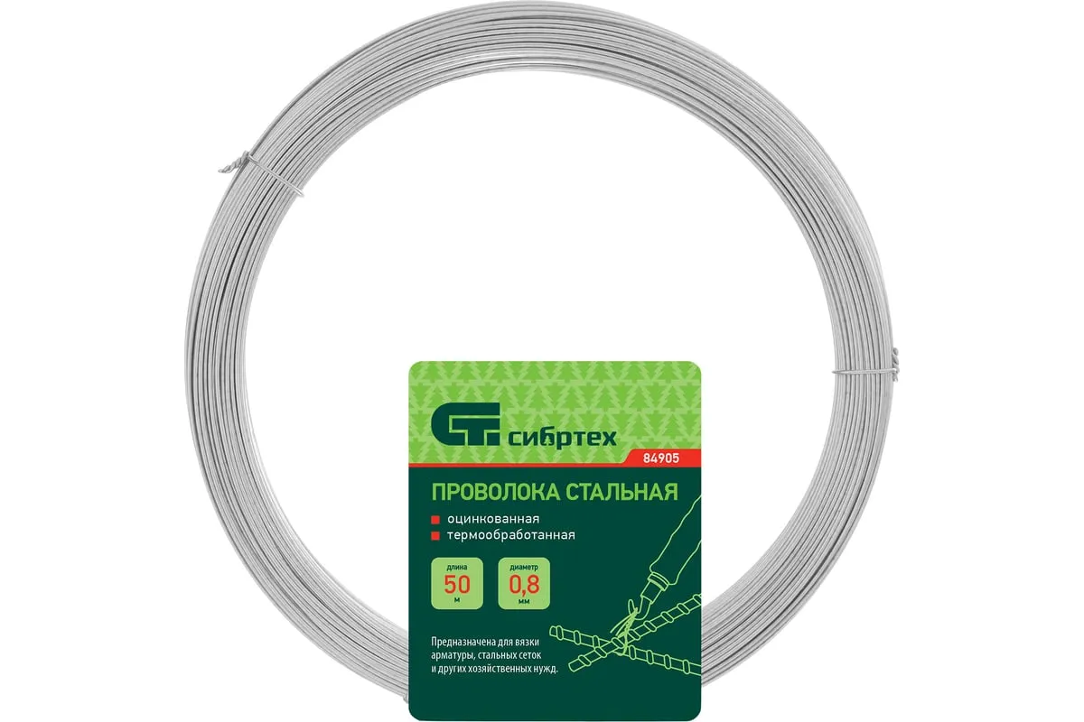 Стальная проволока Сибртех 84905 диаметром 0,8 мм и длиной 50 м, оцинкованная и термообработанная, пригодится в хозяйстве для несложных строительных работ. Применяется для армирования конструкций, обвязки сеток и фиксации различных предметов.