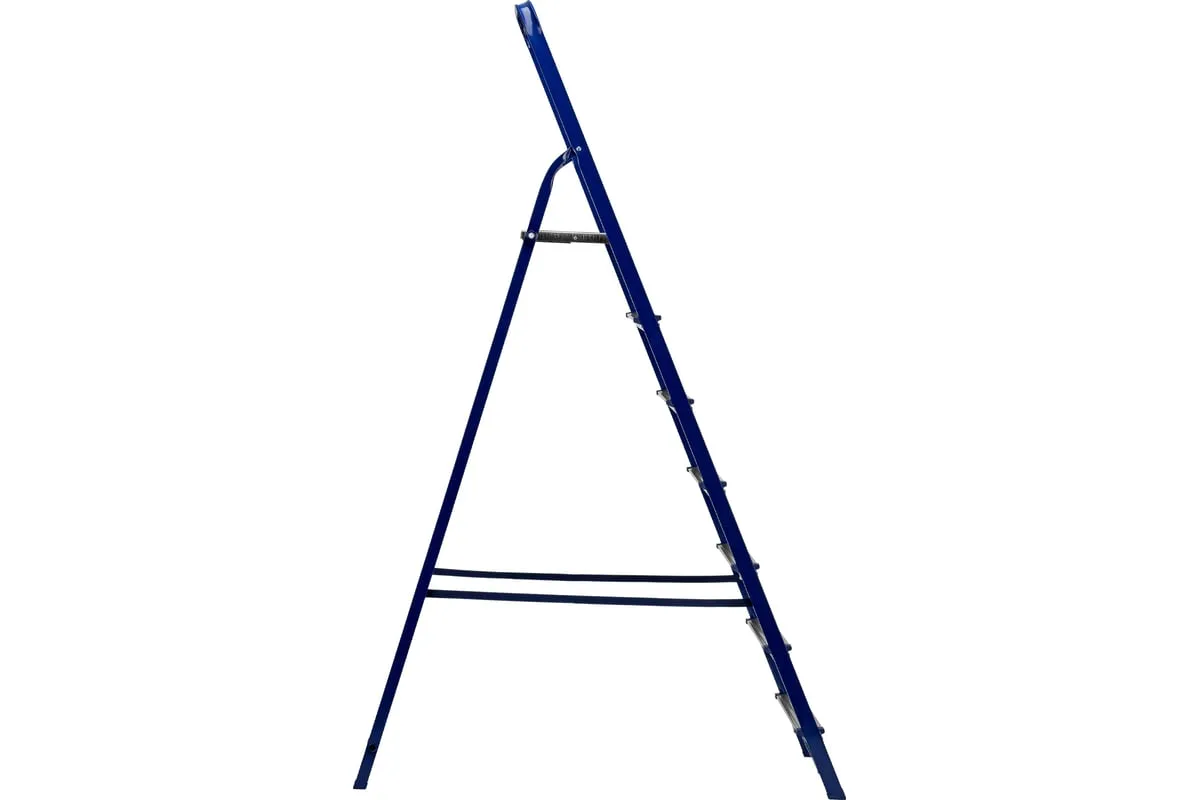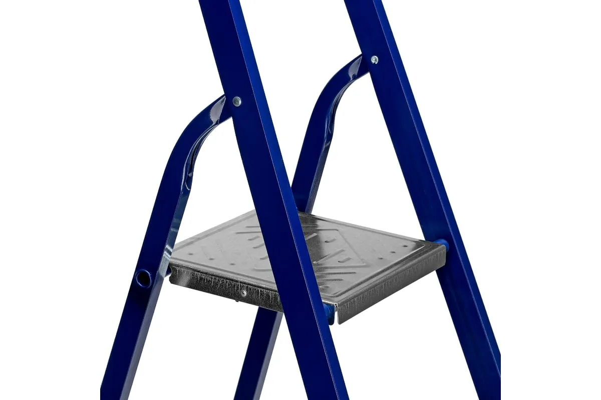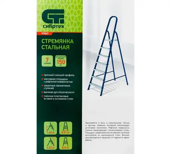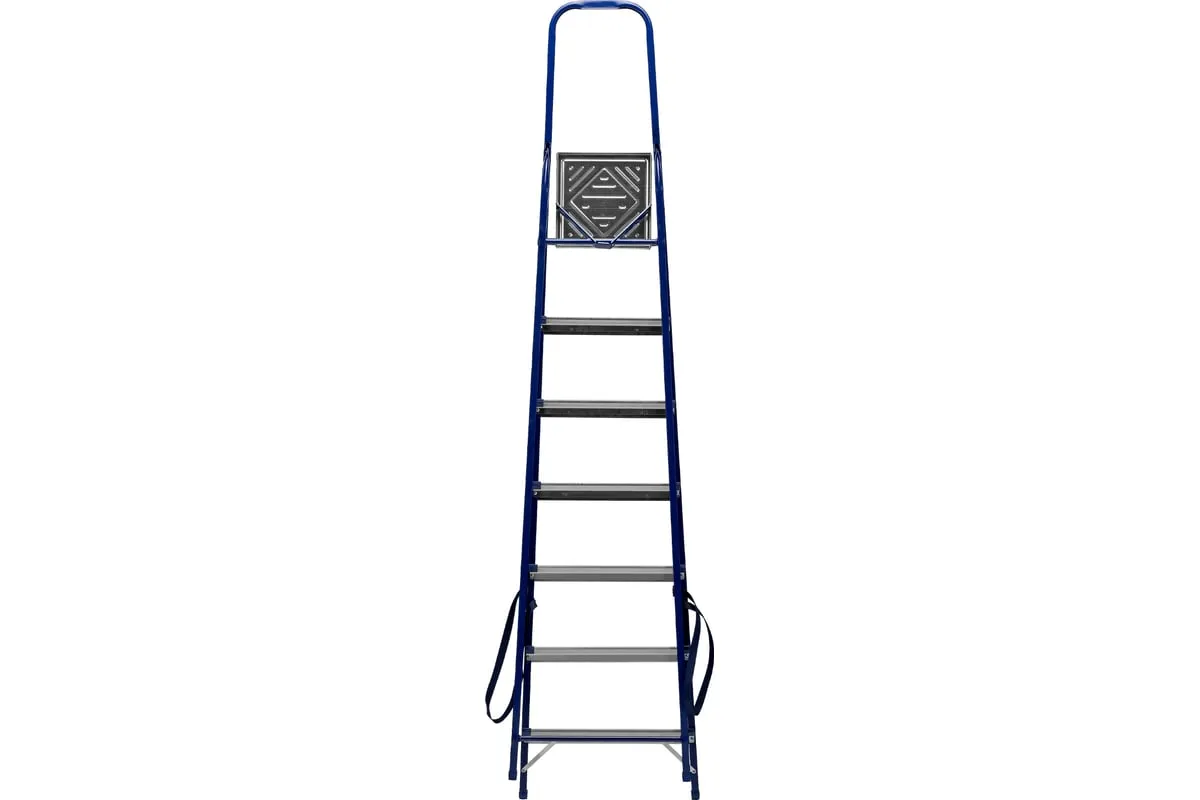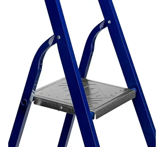 Стремянка имеет специальную дугу для безопасности при работе на большой высоте. Изготовлена из прочного стального профиля. Покрашена эмалью для защиты от внешних воздействий. Нескользящие наконечникми на опорах гарантируют устойчивость на любой поверхности.