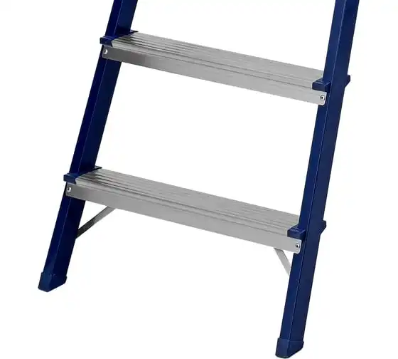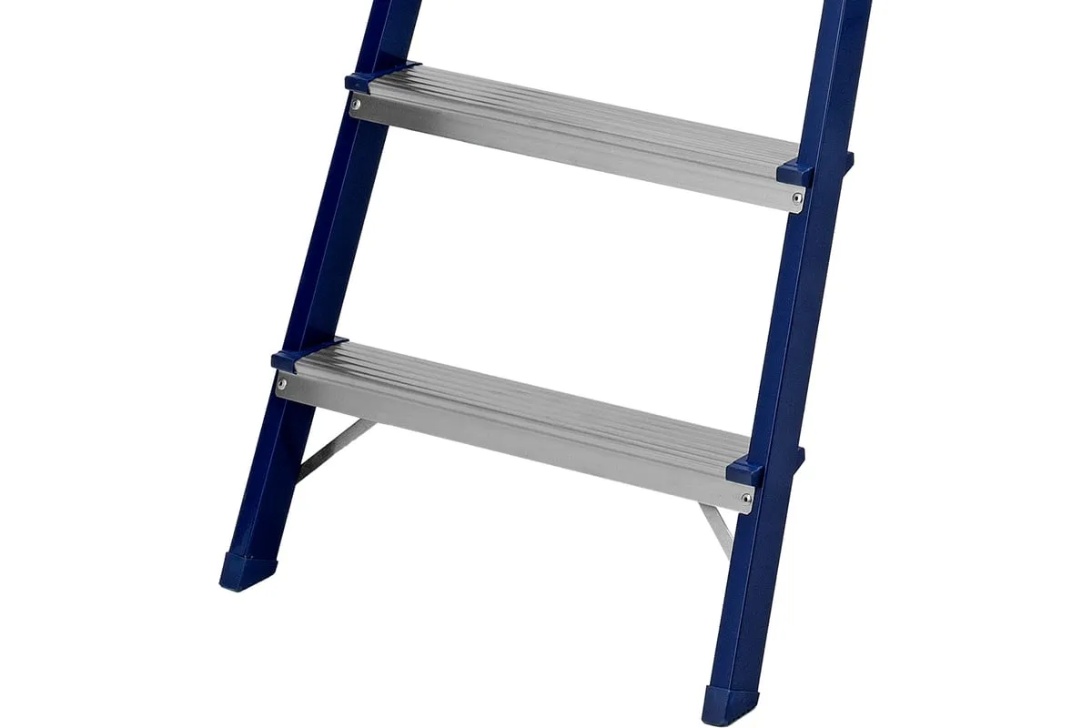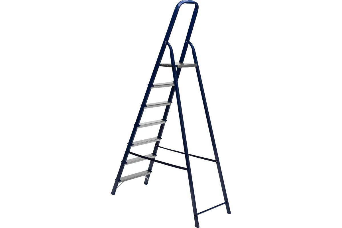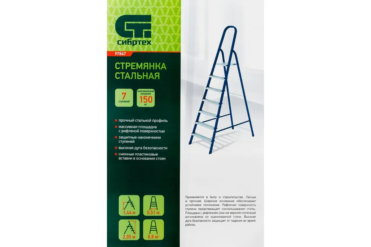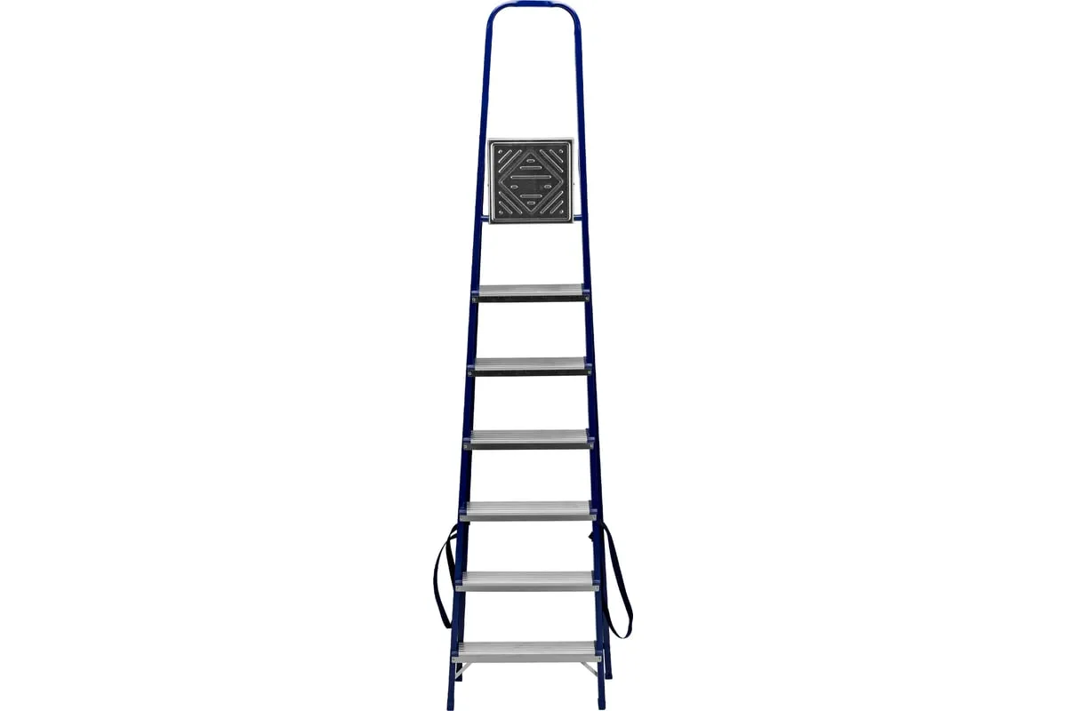 Стремянка имеет специальную дугу для безопасности при работе на большой высоте. Изготовлена из прочного стального профиля. Покрашена эмалью для защиты от внешних воздействий. Нескользящие наконечникми на опорах гарантируют устойчивость на любой поверхности.
