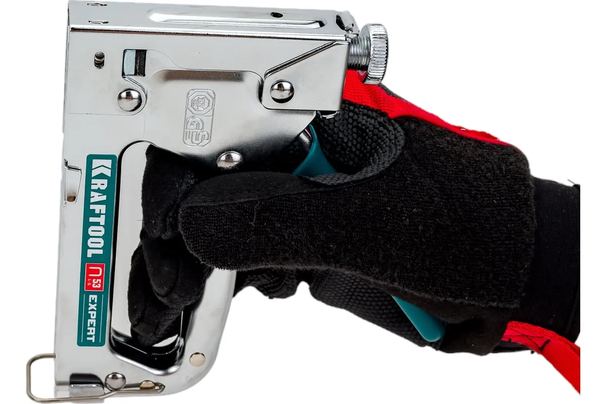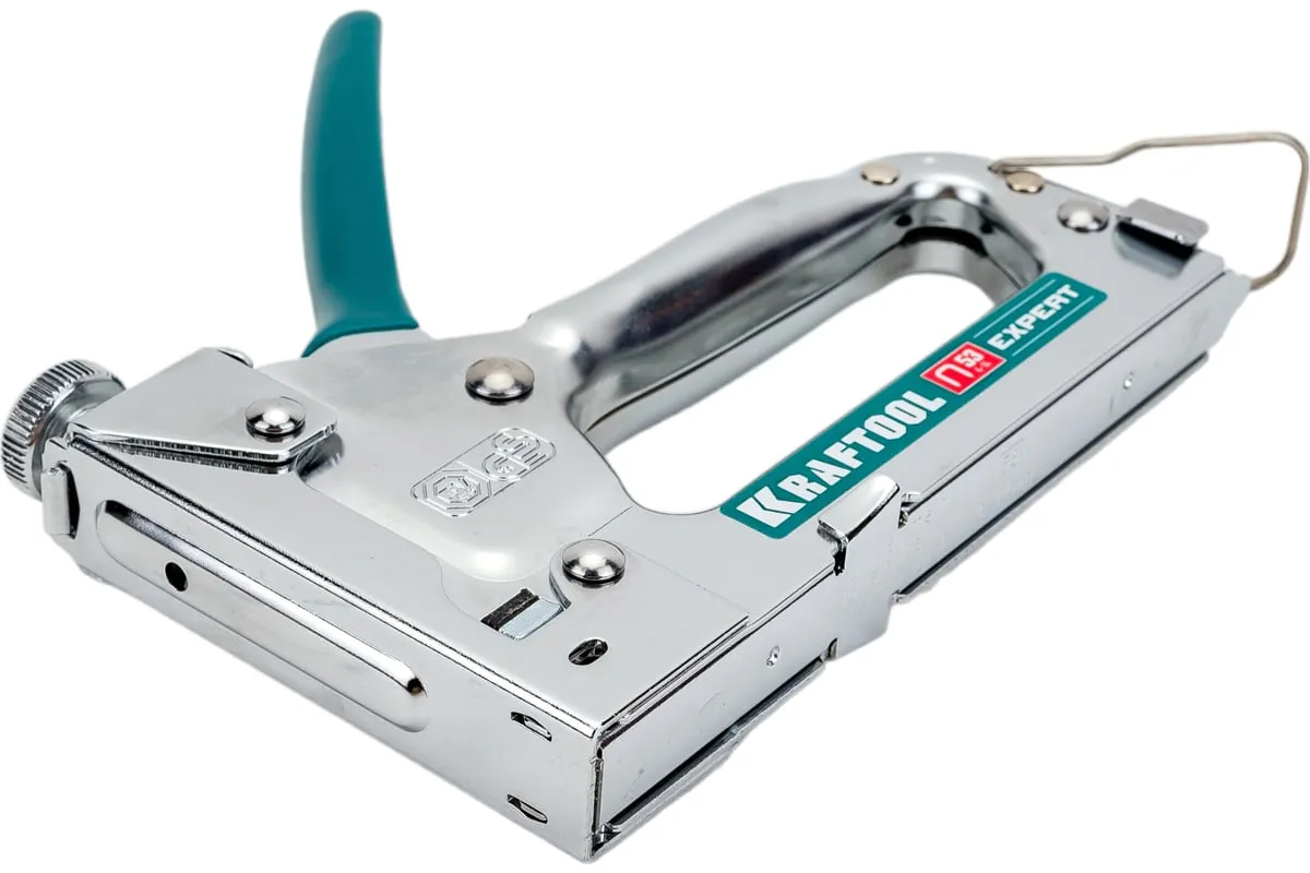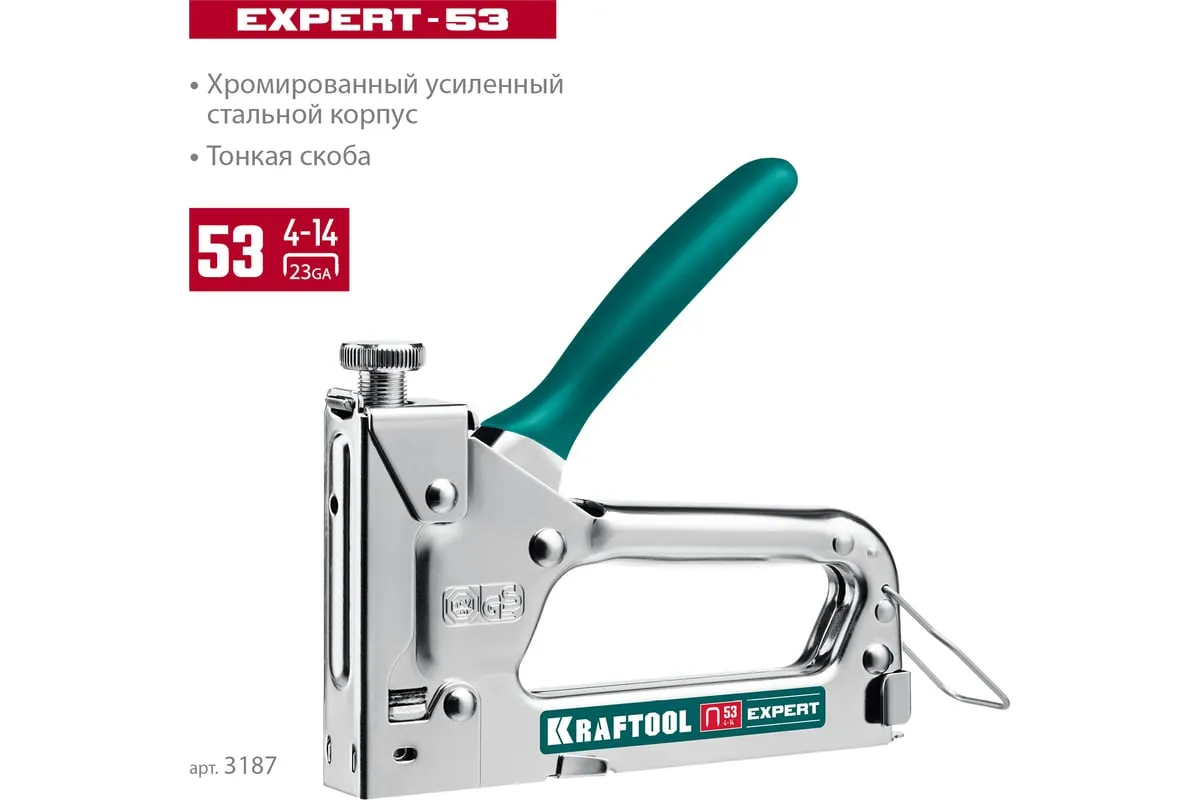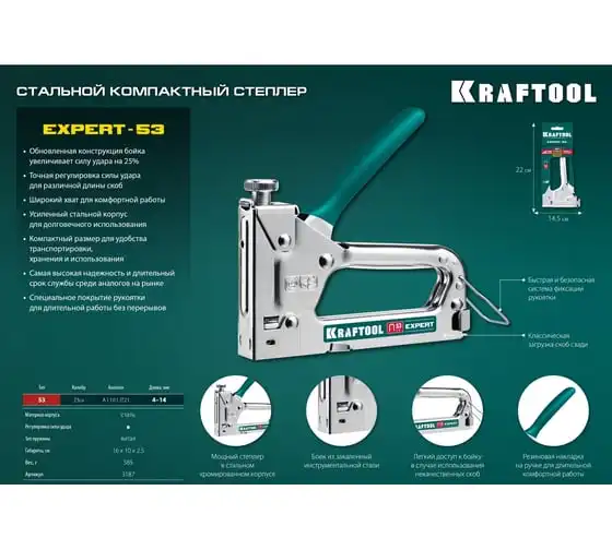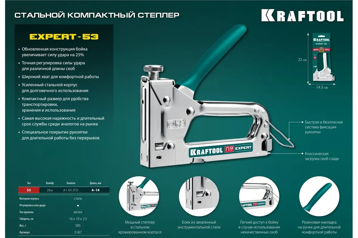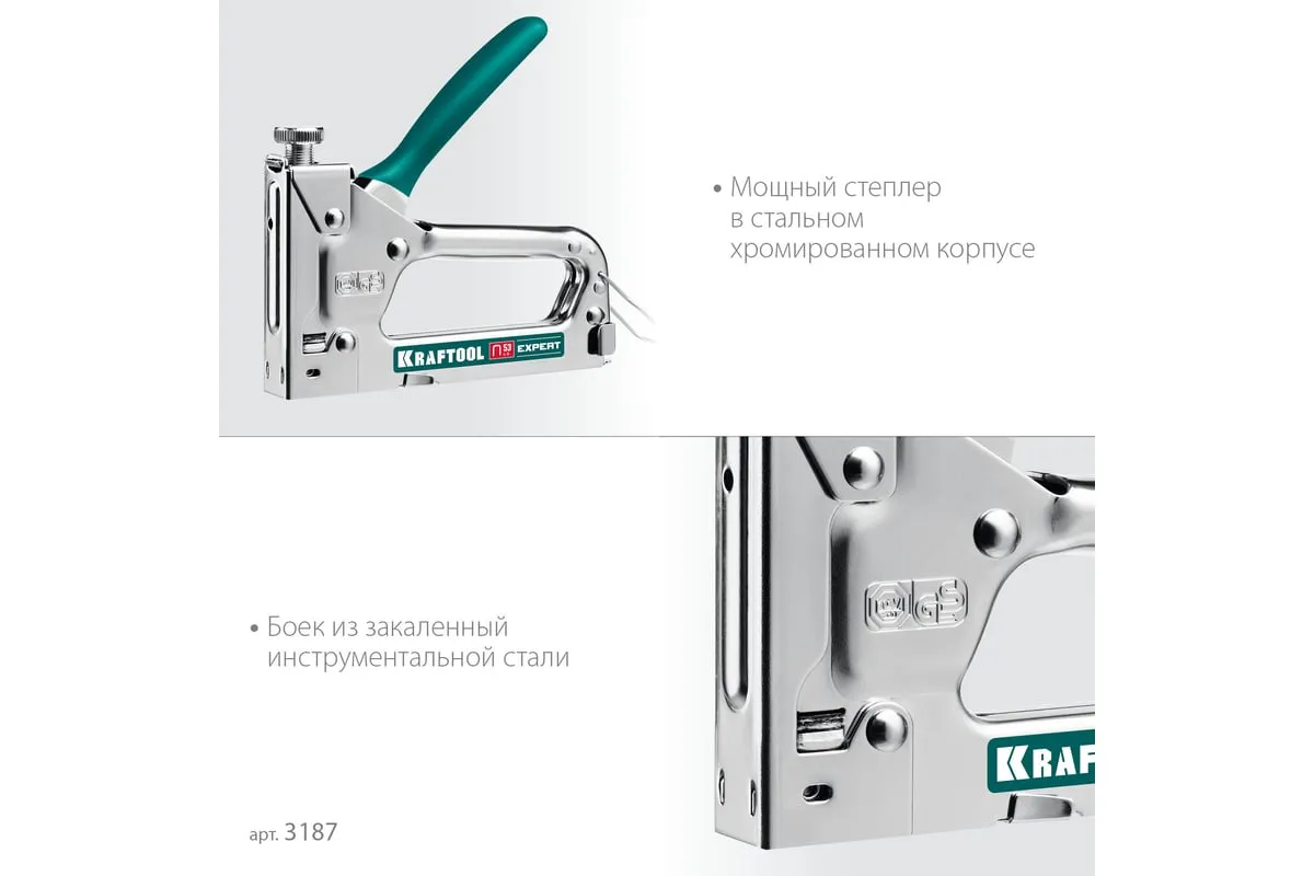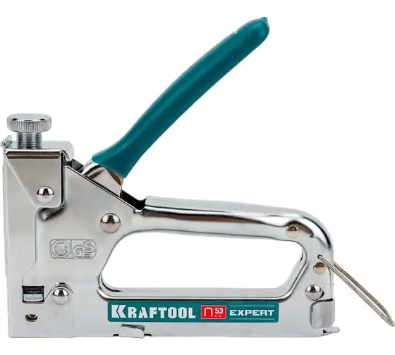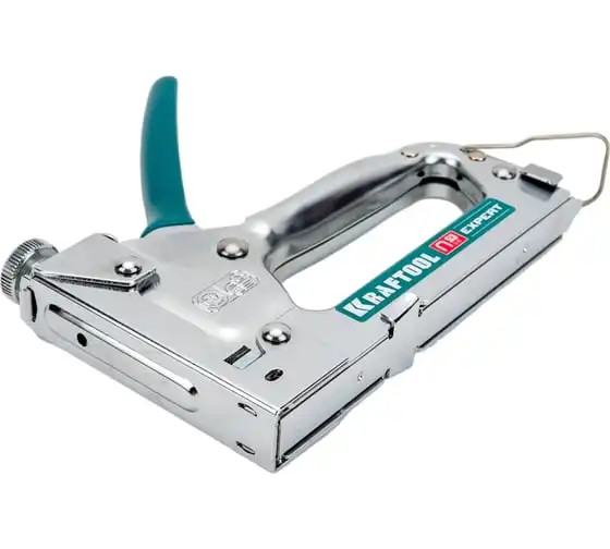 Стальной cтеплер KRAFTOOL Expert-53 тип 53 3187_z01 применяется для крепления тканных материалов(ткани, обивки, холста) и материалов не несущих высоких нагрузок к поверхности из дерева, ДВП, пластика и т.п. Тонкая проволока не повреждает волокна материалов. Степлер можно отрегулировать в зависимости от используемых материалов. Инструмент выполнен из прочной стали, дополнительно есть мягкая противоскользящая прокладка. Скобы 53 (A|3|11)