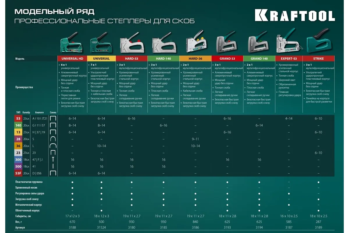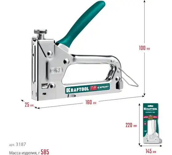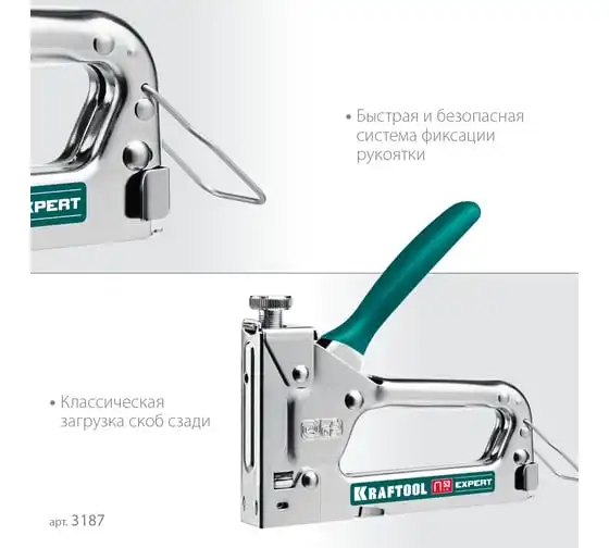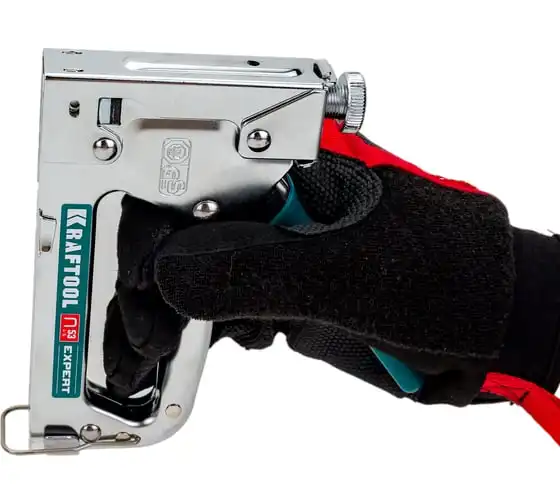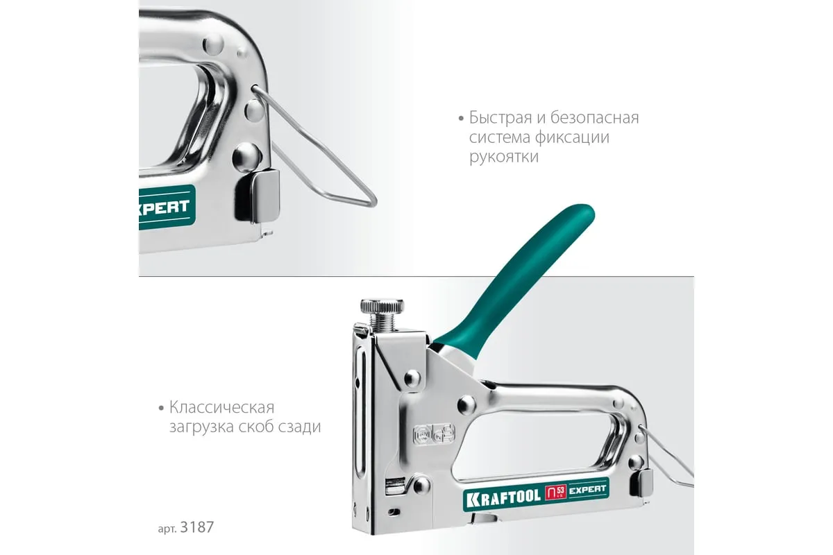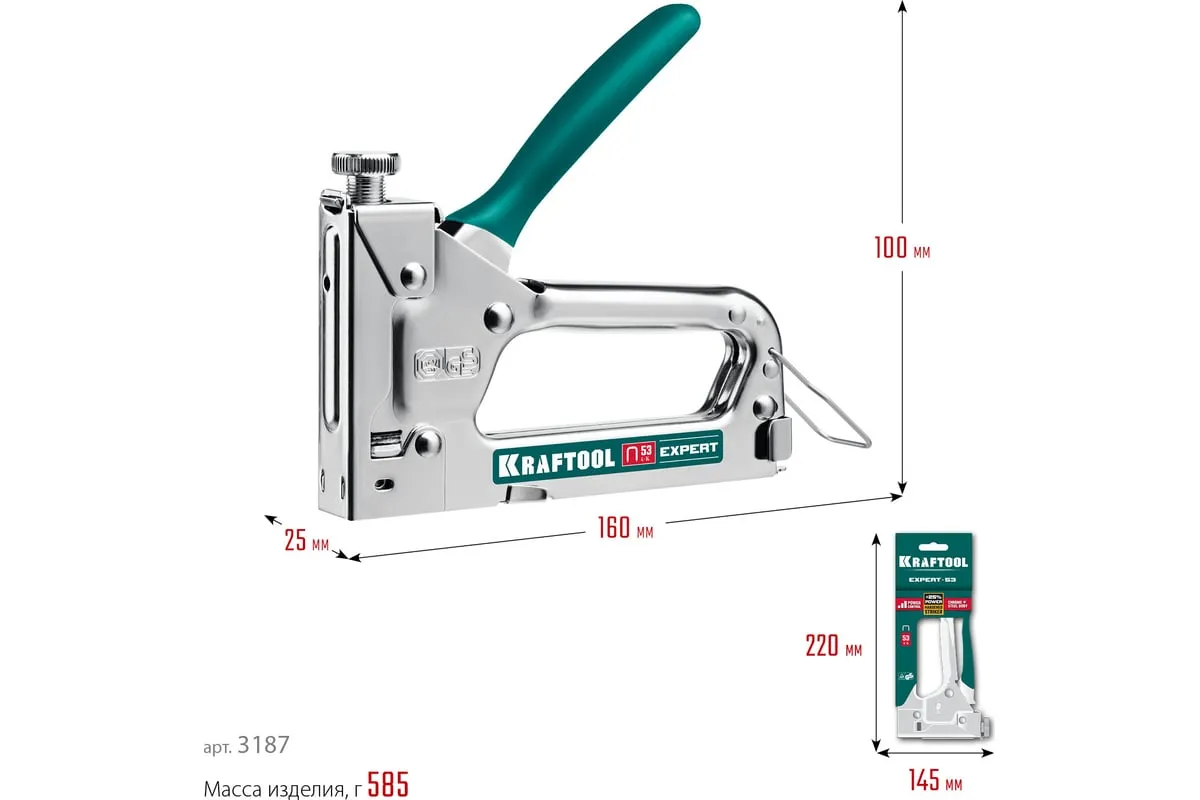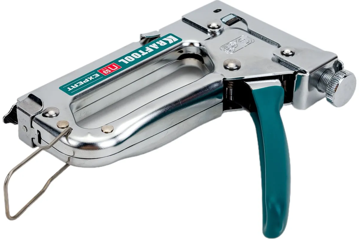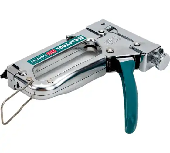 Стальной cтеплер KRAFTOOL Expert-53 тип 53 3187_z01 применяется для крепления тканных материалов(ткани, обивки, холста) и материалов не несущих высоких нагрузок к поверхности из дерева, ДВП, пластика и т.п. Тонкая проволока не повреждает волокна материалов. Степлер можно отрегулировать в зависимости от используемых материалов. Инструмент выполнен из прочной стали, дополнительно есть мягкая противоскользящая прокладка. Скобы 53 (A|3|11)