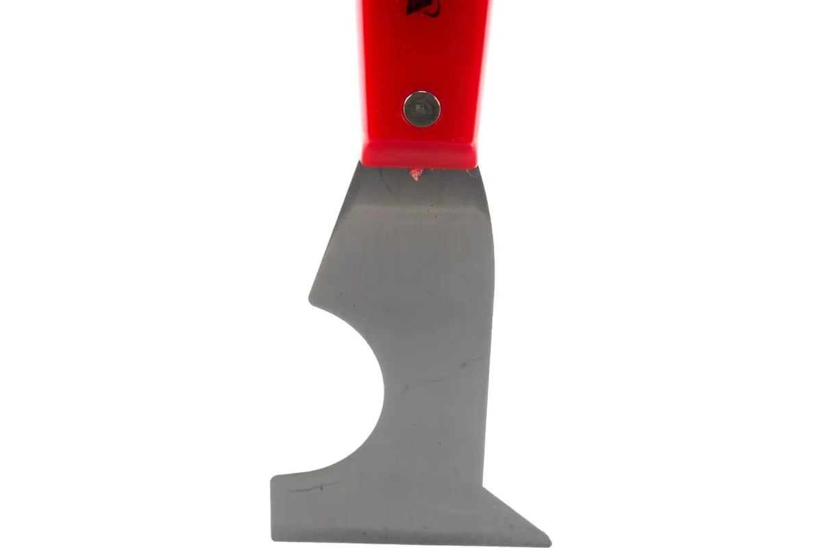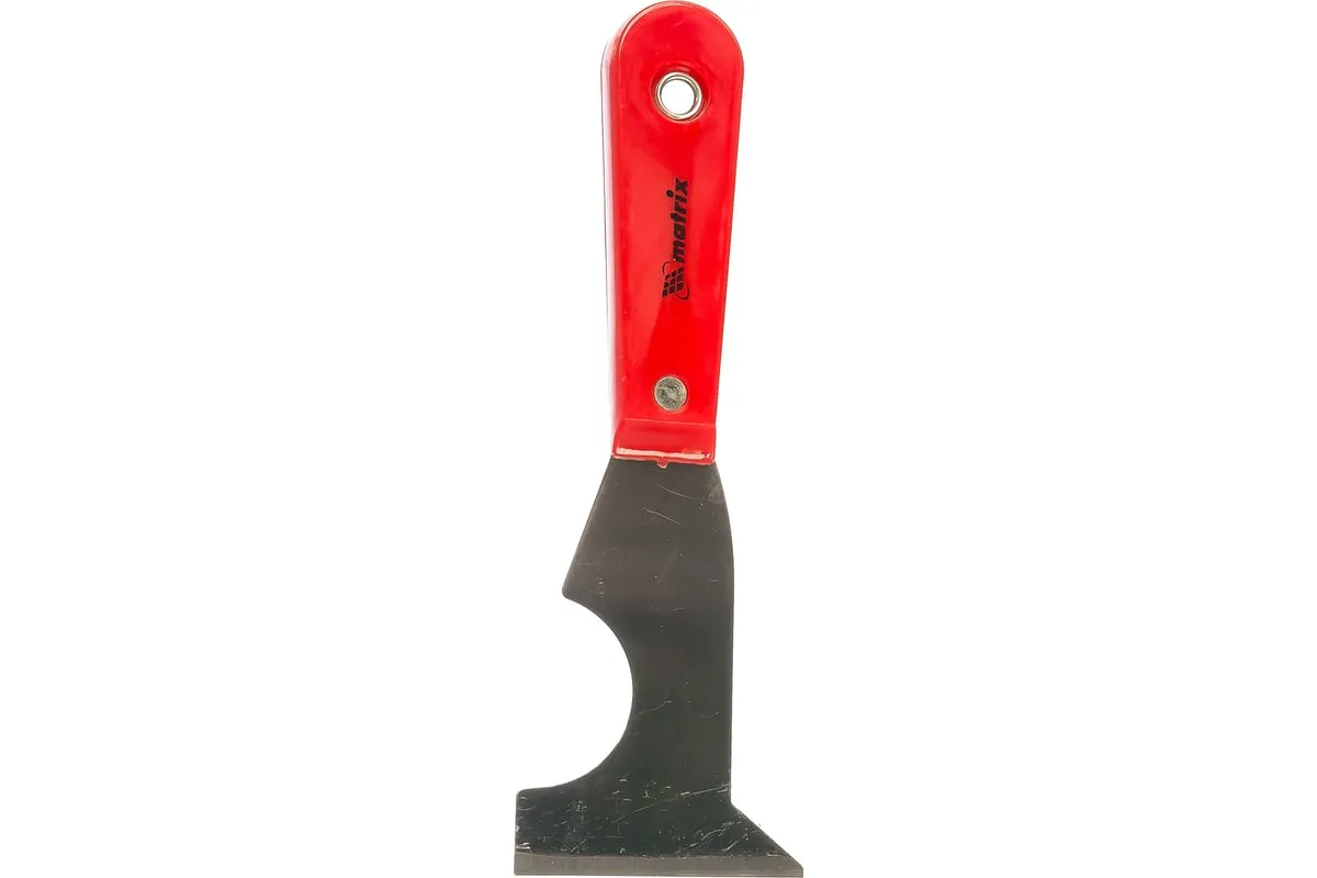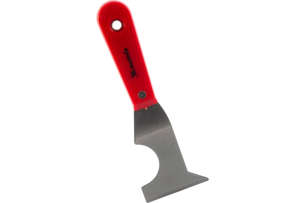 Стальной шпатель-скребок Matrix 85299 с пластмассовой ручкой имеет лезвие сложной конфигурации и является многофункциональным инструментом. Используется для удаления старых обоев, клея, излишков краски с валиков, снятия тонкого слоя ржавчины с металлических поверхностей, зачистки труб и т. д.