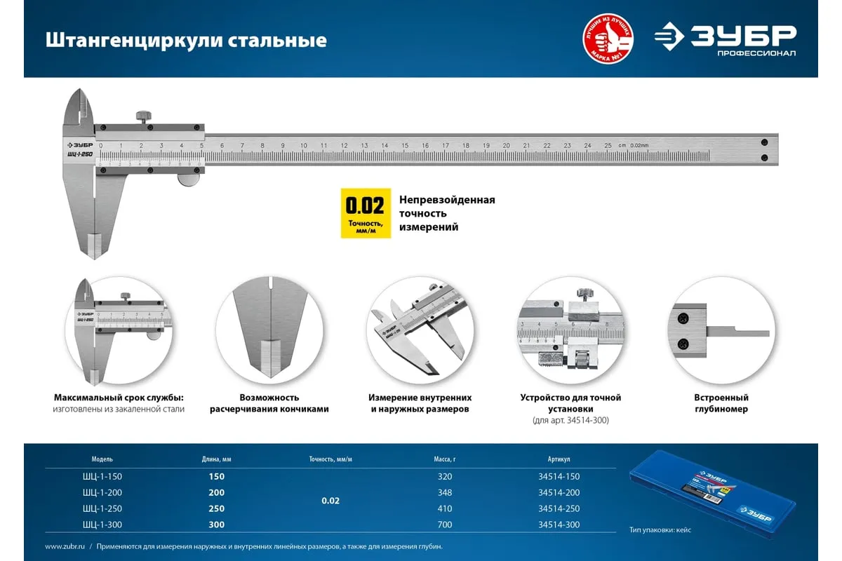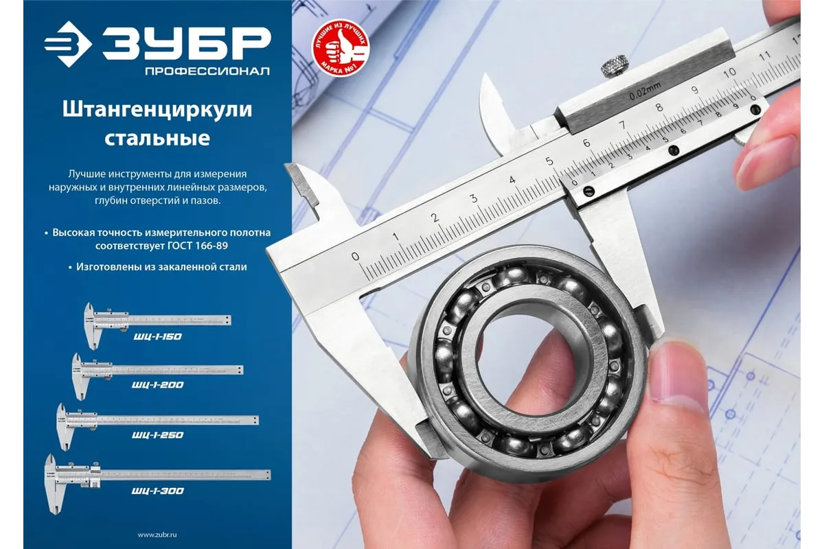 Стальной штангенциркуль ЗУБР ШЦ-1-150 150 мм 34514-150 изготовлен в соответствии с ГОСТ 166-89, обеспечивает высокую точность измерений и имеет длительный срок службы.