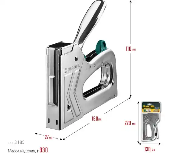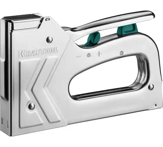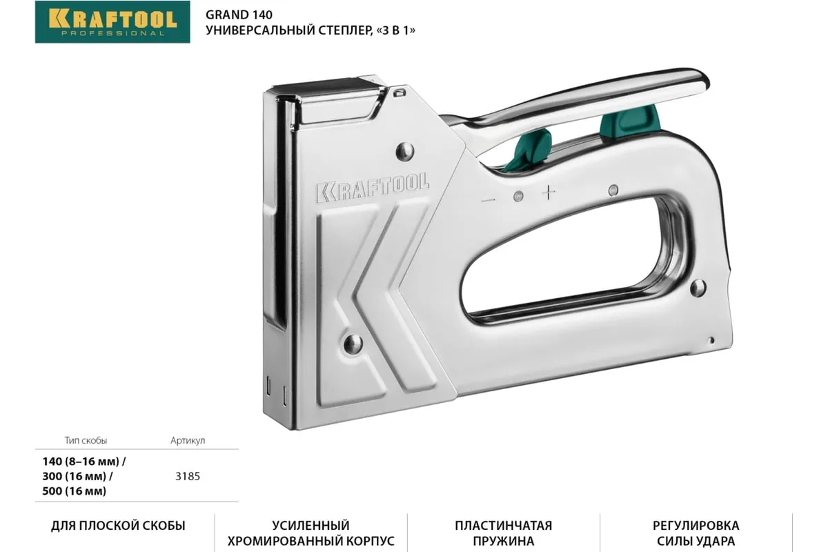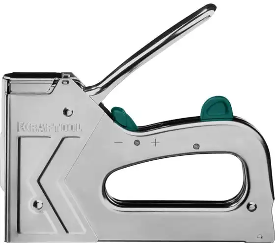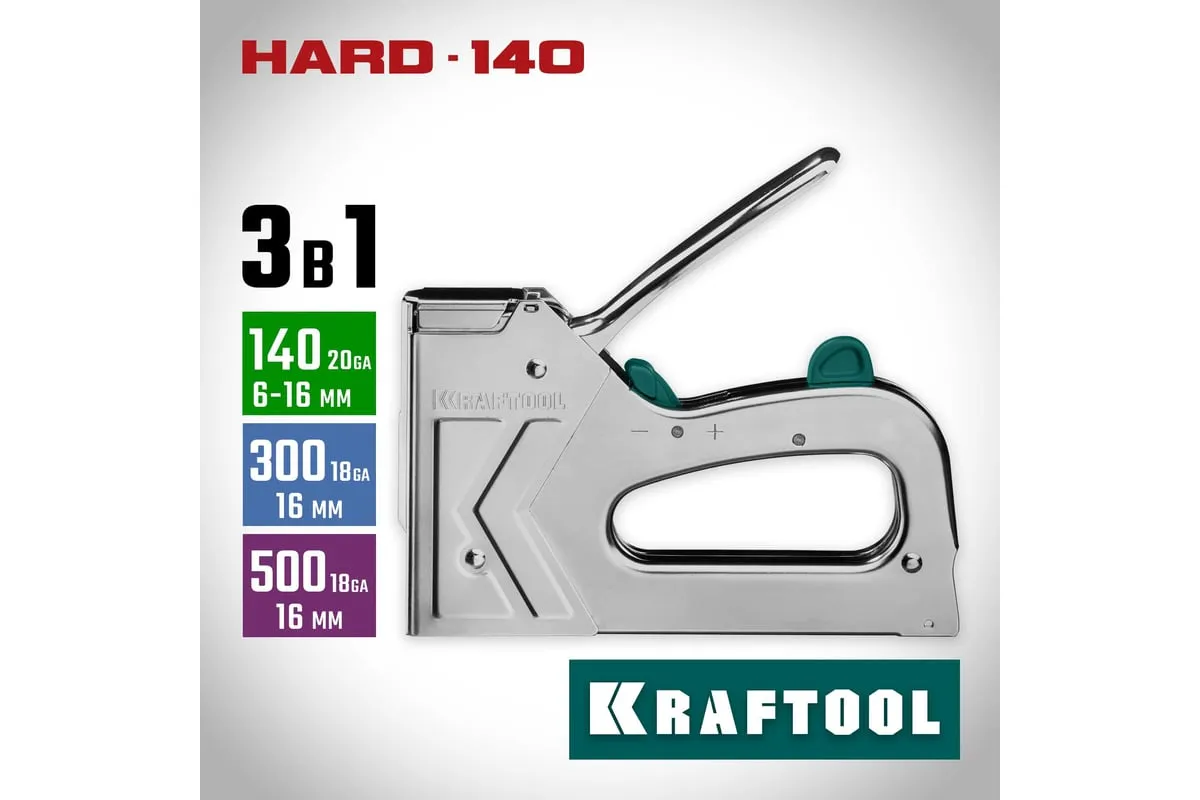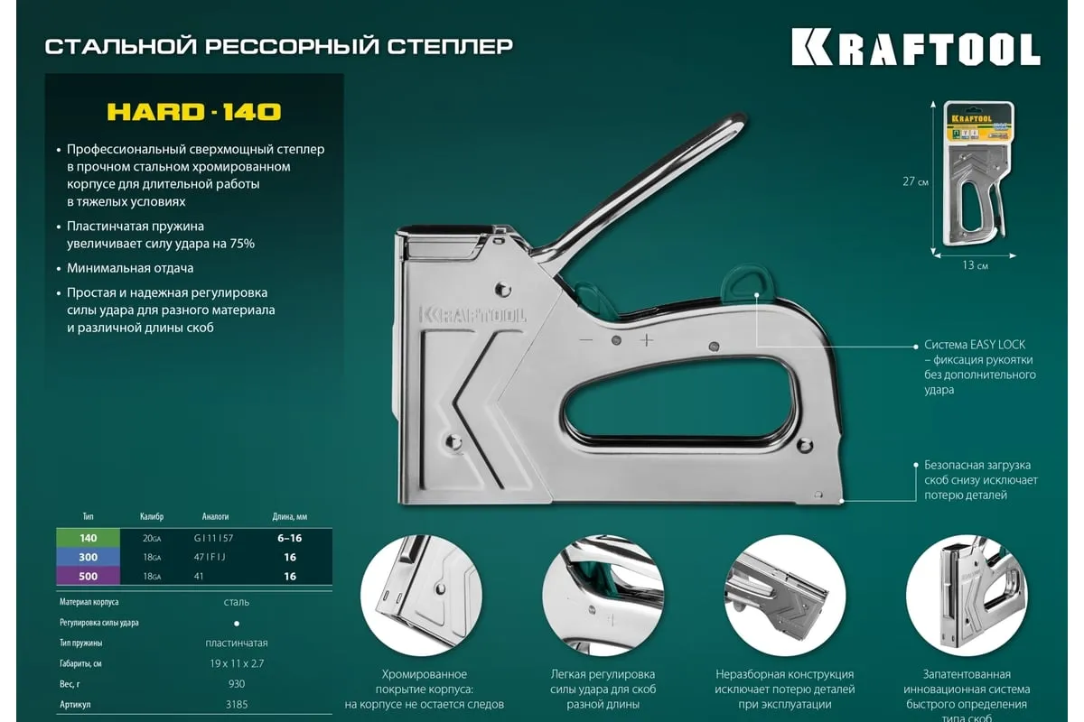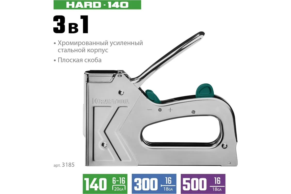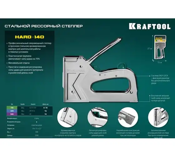 Степлер стальной тип 140, 300, 500, KRAFTOOL HARD-140, 3185 - профессиональный мощный стальной степлер с ударным механизмом рессорного типа, увеличенная мощность, удар без отдачи. PowerControl двухпозиционная регулировка силы удара. FastLoad ускоренная загрузка скоб снизу. QuickLock быстрая система фиксации рукоятки. Стальной хромированный корпус. Применяемые типы скоб: 140 (G/11/57) - для крепления нетканых материалов, плёнок, уплотнителей, бумаги и картона к поверхности из дерева, пластика, двп и т.д. Широкая спинка скобы не прорезает прикреплённый материал. 300 (E|J|8|47) - прочное скрепления заготовок из дерева, пластика, двп и т.п. между собой. 500 (41) – незаметное скрепление заготовок из дерева, пластика, двп и т.п. между собой.