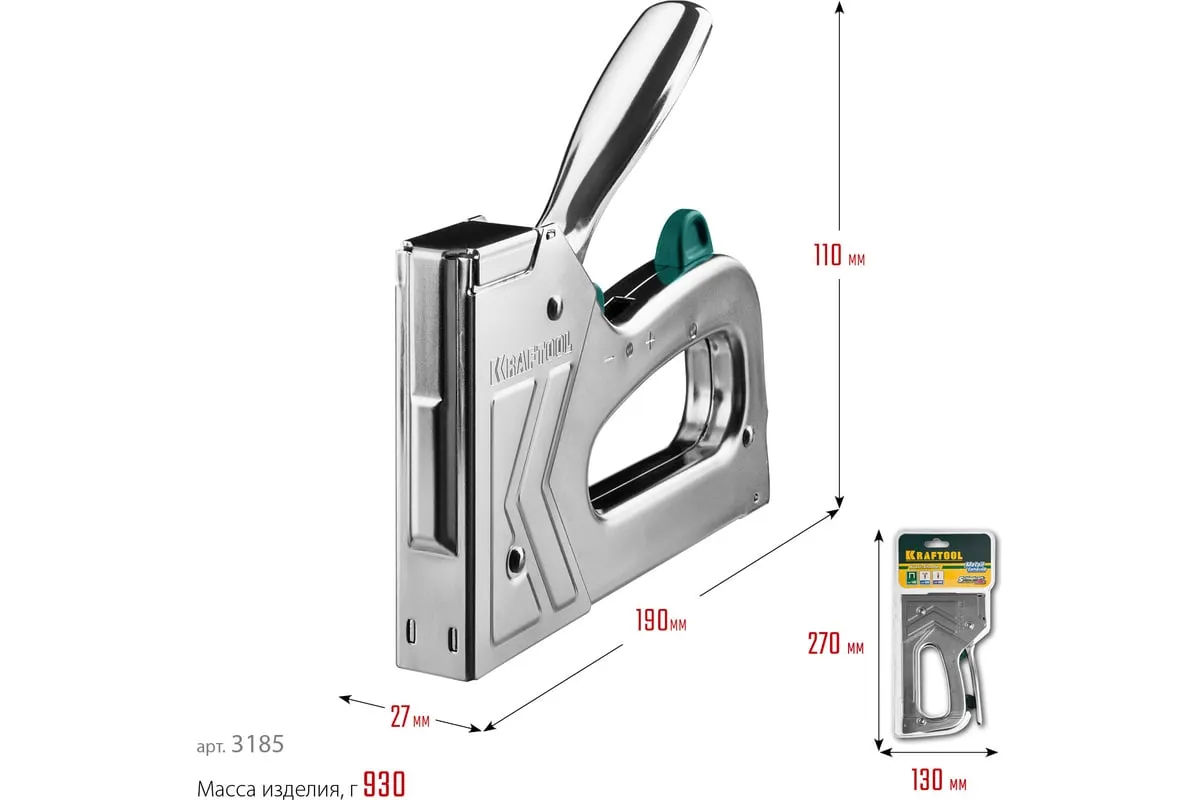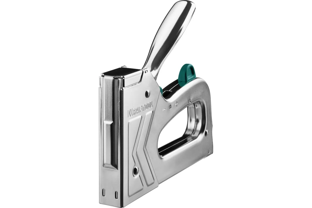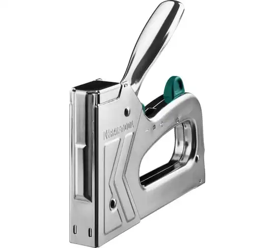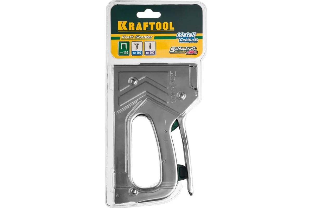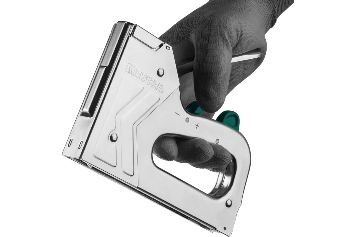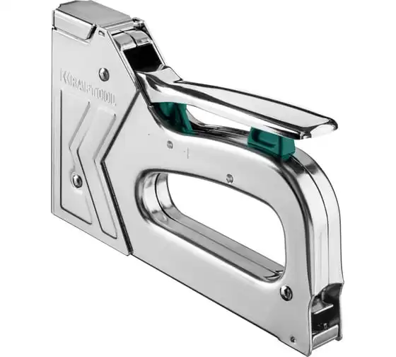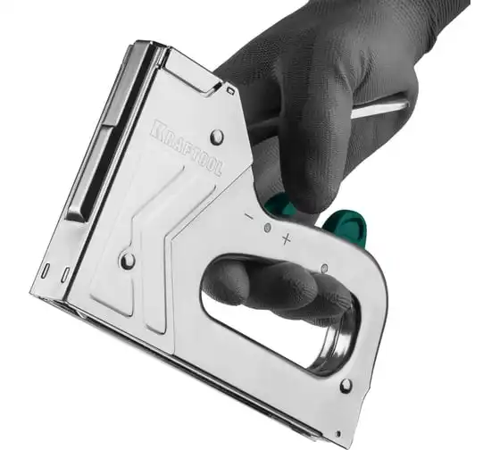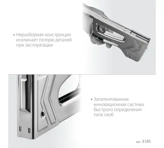 Степлер стальной тип 140, 300, 500, KRAFTOOL HARD-140, 3185 - профессиональный мощный стальной степлер с ударным механизмом рессорного типа, увеличенная мощность, удар без отдачи. PowerControl двухпозиционная регулировка силы удара. FastLoad ускоренная загрузка скоб снизу. QuickLock быстрая система фиксации рукоятки. Стальной хромированный корпус. Применяемые типы скоб: 140 (G/11/57) - для крепления нетканых материалов, плёнок, уплотнителей, бумаги и картона к поверхности из дерева, пластика, двп и т.д. Широкая спинка скобы не прорезает прикреплённый материал. 300 (E|J|8|47) - прочное скрепления заготовок из дерева, пластика, двп и т.п. между собой. 500 (41) – незаметное скрепление заготовок из дерева, пластика, двп и т.п. между собой.
