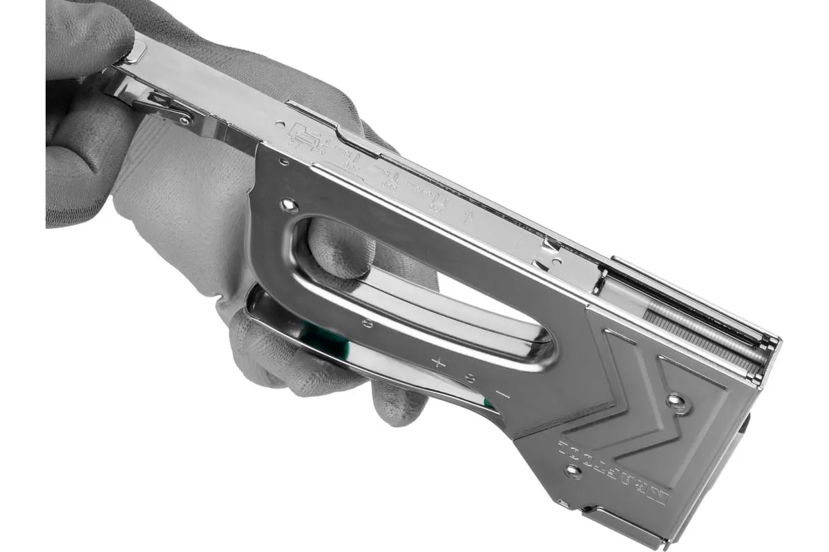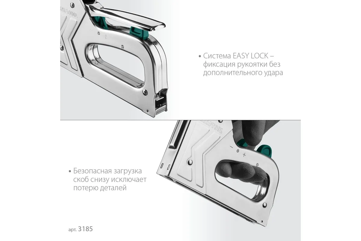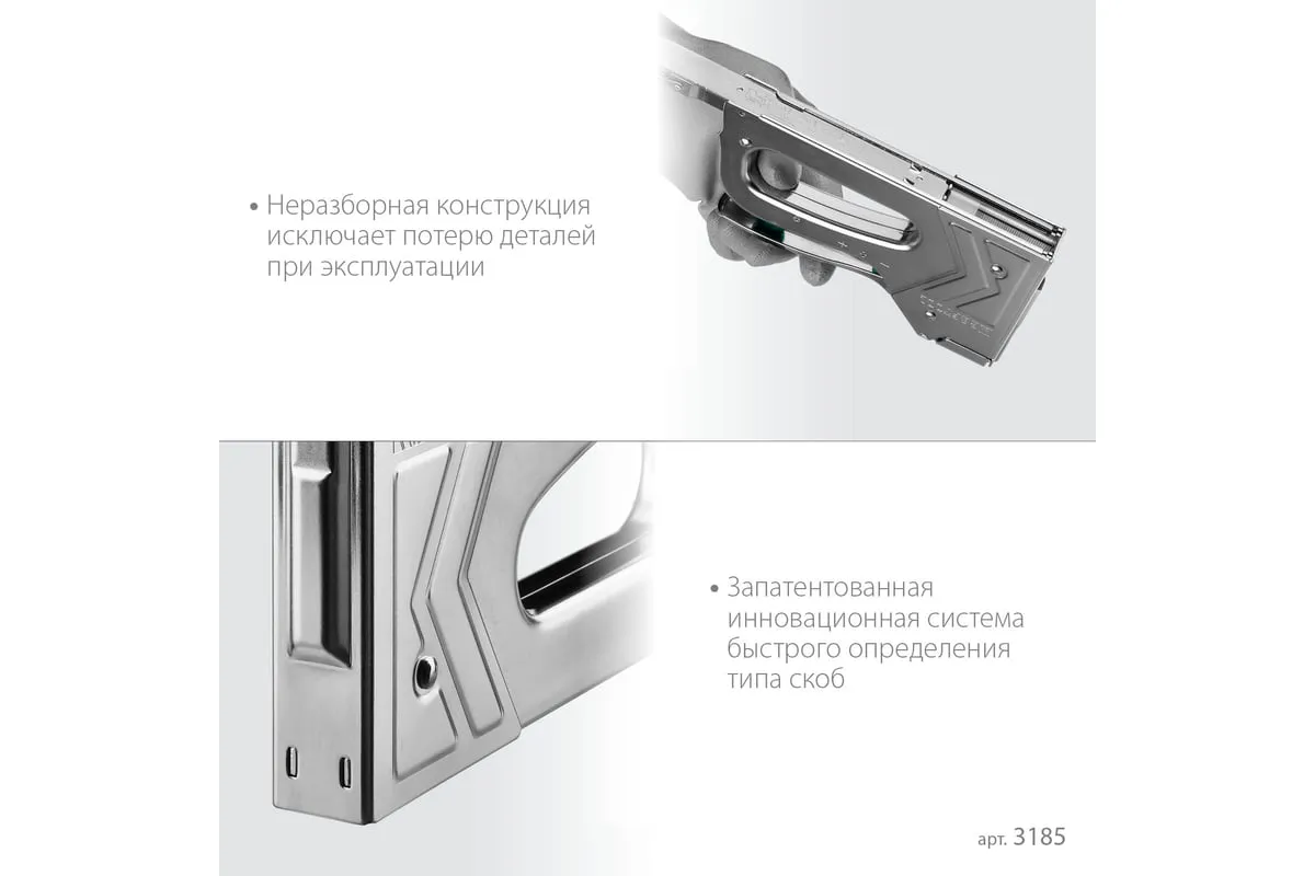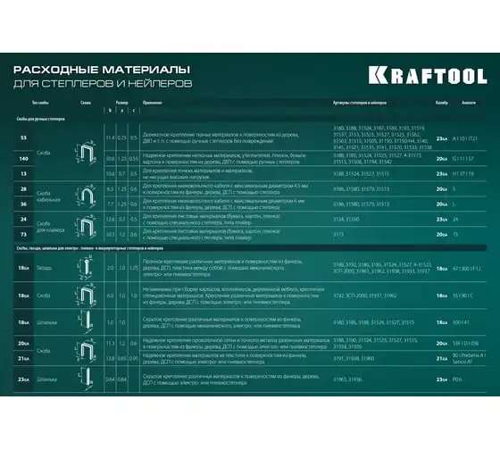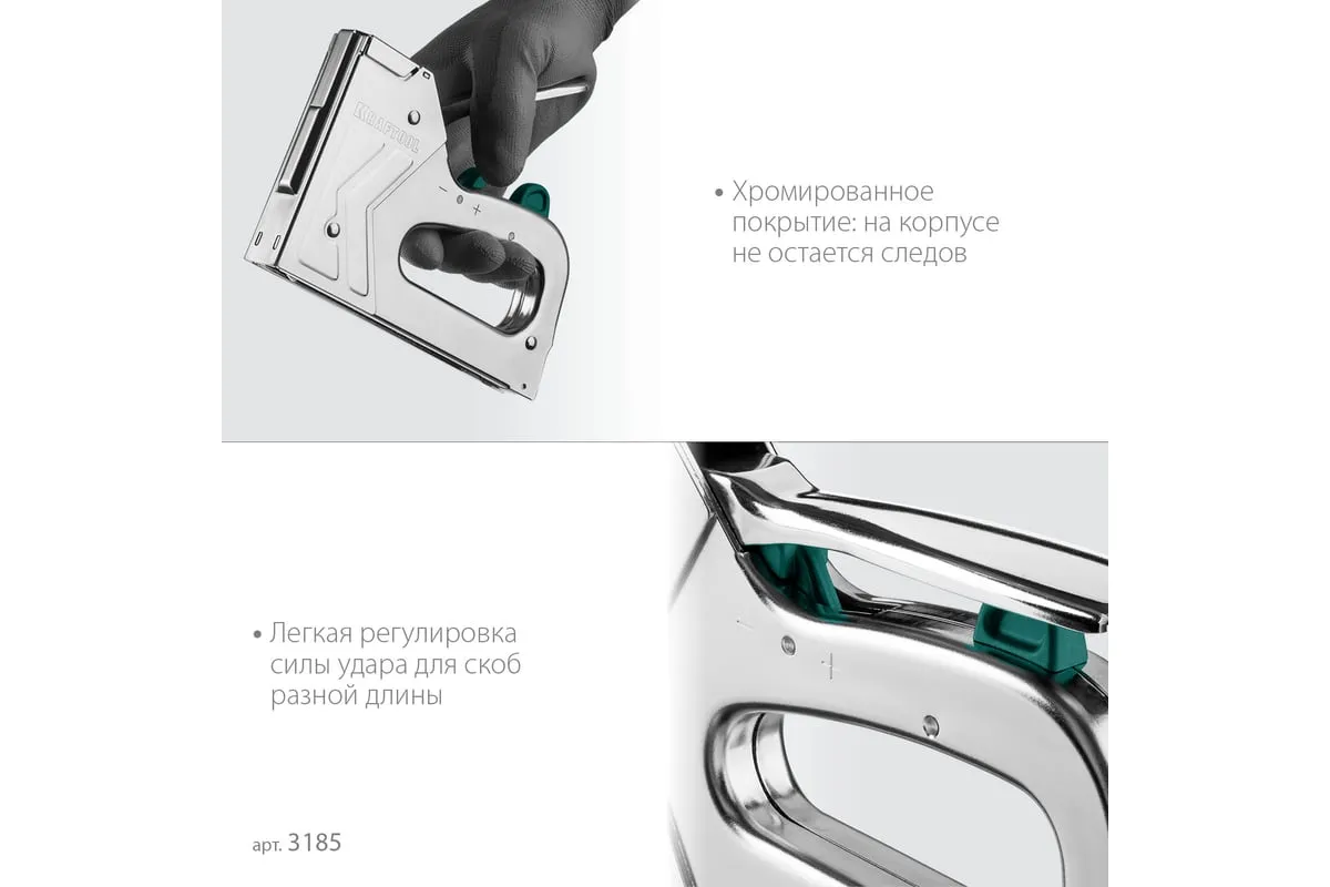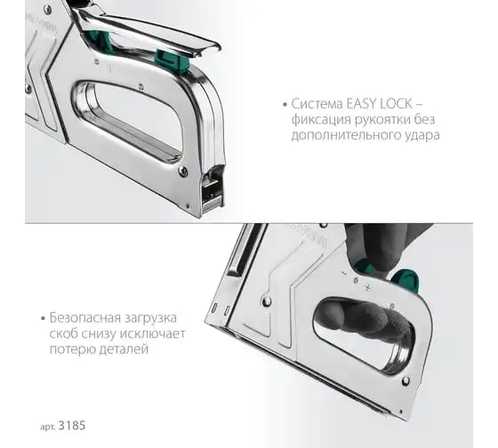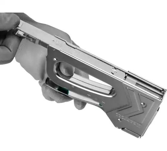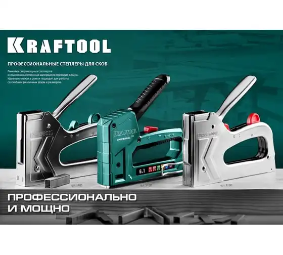 Степлер стальной тип 140, 300, 500, KRAFTOOL HARD-140, 3185 - профессиональный мощный стальной степлер с ударным механизмом рессорного типа, увеличенная мощность, удар без отдачи. PowerControl двухпозиционная регулировка силы удара. FastLoad ускоренная загрузка скоб снизу. QuickLock быстрая система фиксации рукоятки. Стальной хромированный корпус. Применяемые типы скоб: 140 (G/11/57) - для крепления нетканых материалов, плёнок, уплотнителей, бумаги и картона к поверхности из дерева, пластика, двп и т.д. Широкая спинка скобы не прорезает прикреплённый материал. 300 (E|J|8|47) - прочное скрепления заготовок из дерева, пластика, двп и т.п. между собой. 500 (41) – незаметное скрепление заготовок из дерева, пластика, двп и т.п. между собой.