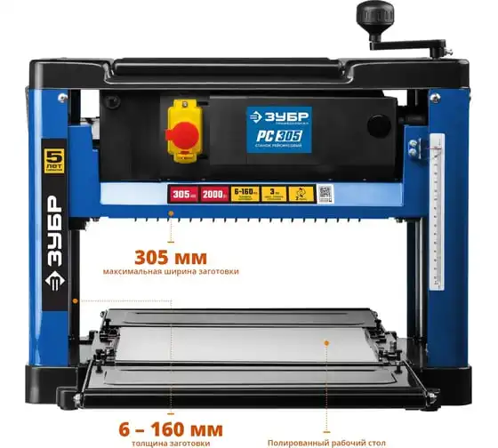 Рейсмусовый станок Зубр ширина строгания 305мм, толщина заготовки до 160 мм, 2 ножа, 8000 б/мин, 2000Вт, 6м/мин РС-305