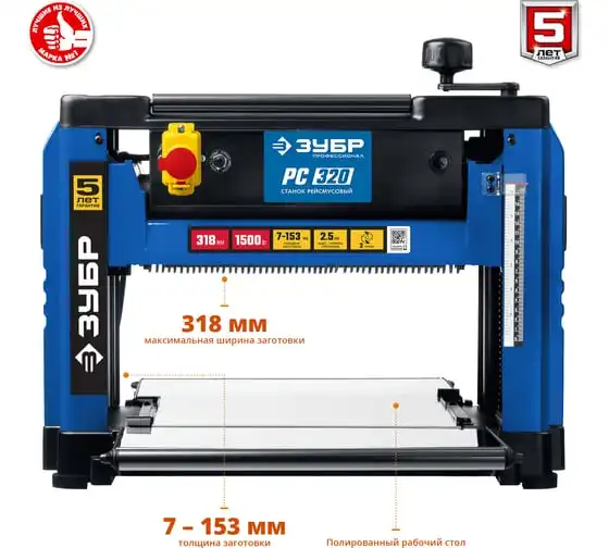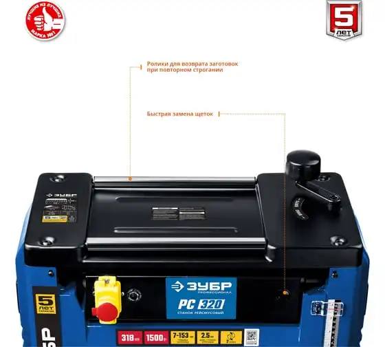 Рейсмусовый станок Зубр ширина строгания 318 мм, толщина заготовки до 153 мм, 2 ножа, РС-320