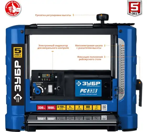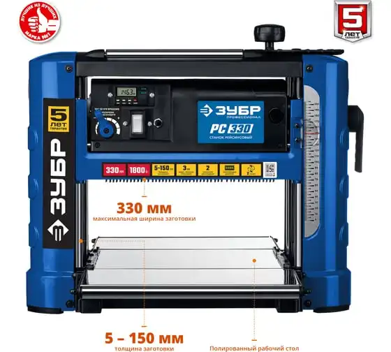 Рейсмусовый станок Зубр ширина строгания 330 мм, толщина заготовки до 150 мм, 2 ножа, РС-330
