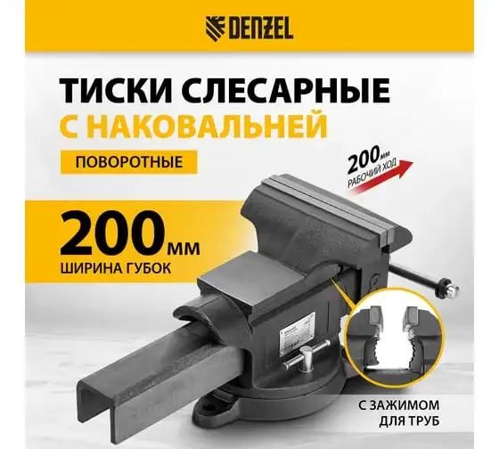 Тиски слесарные BVH-200, 200 мм, поворотные, стальная направляющая, с наковальней // Denzel 18686