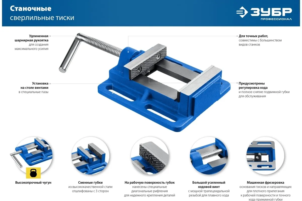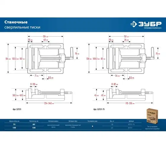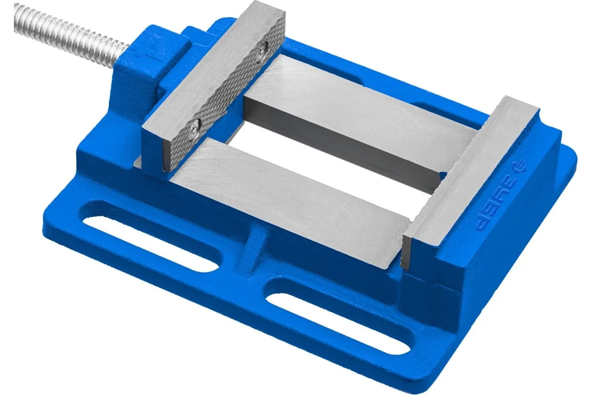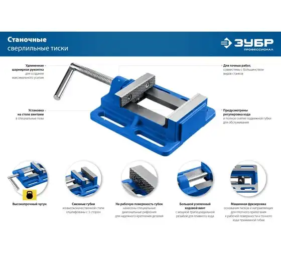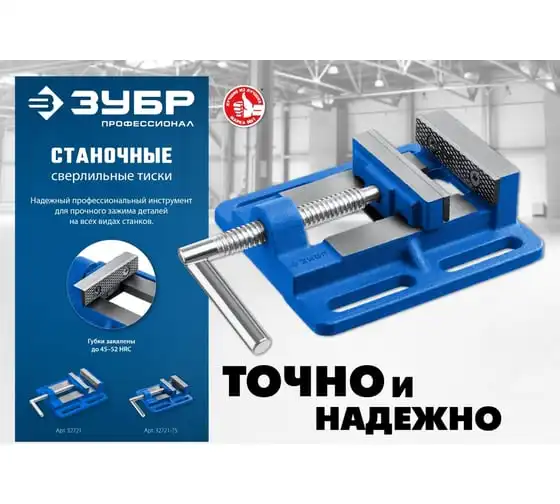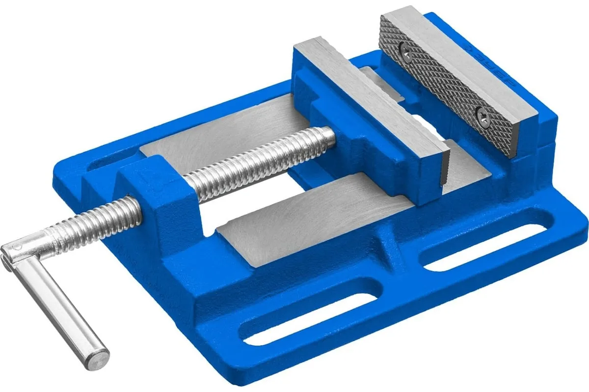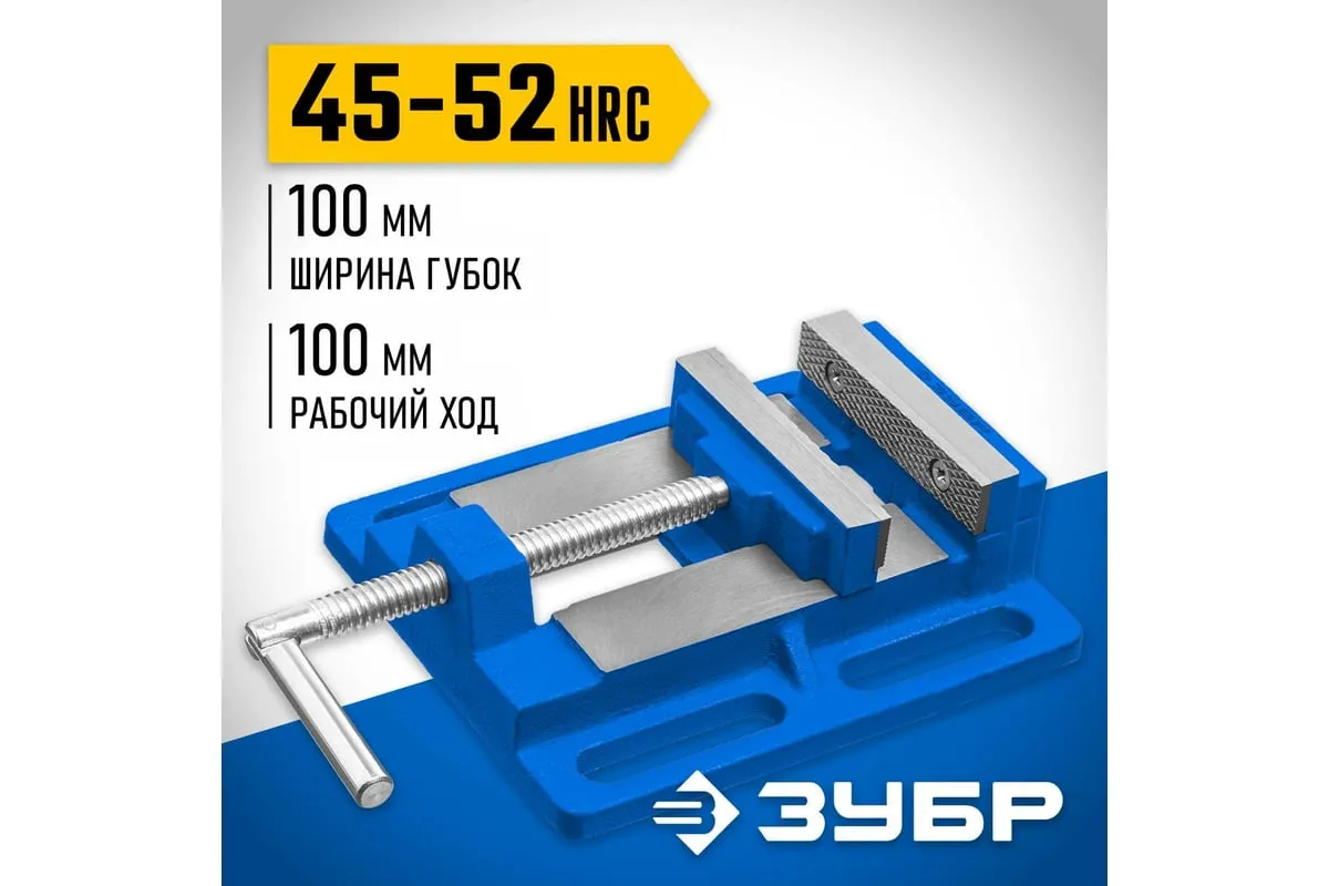 Станочные сверлильные тиски ЗУБР 100 мм 32721 предназначены для надежного закрепления заготовки размером не более 100 мм при её обработке на станках различного типа. В корпусе предусмотрены отверстия для крепления к станкам - сверлильным, фрезерным, шлифовальным. Это небольшая по габаритам и весу - всего 3.32 кг, но очень прочная конструкция из серого чугуна марки CЧ-20, выдерживает большие нагрузки. Сменные губки изготовлены из высококачественной стали, закалённой до 45-52 HRC и отшлифованы.