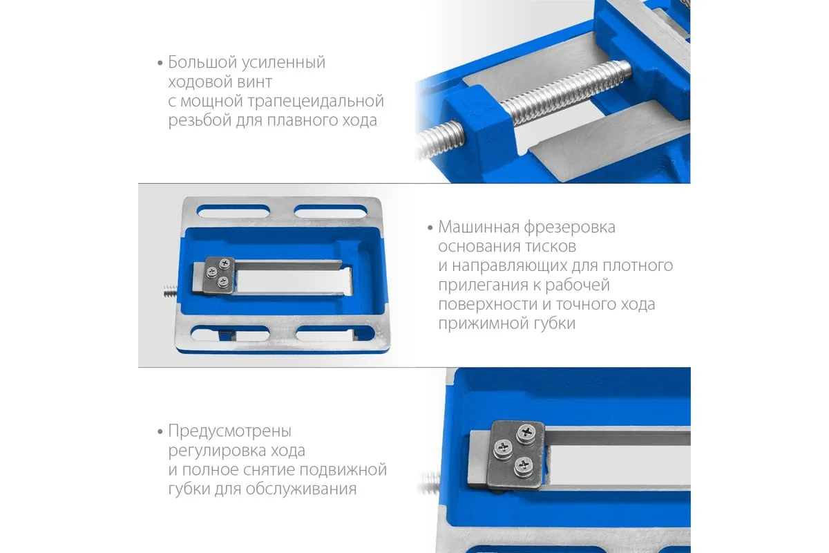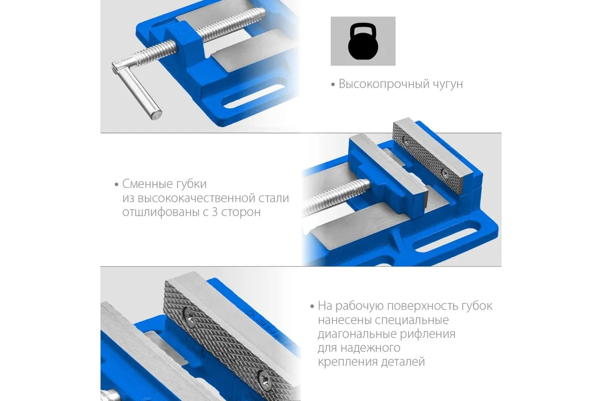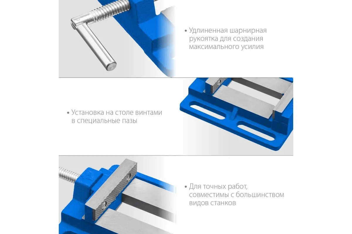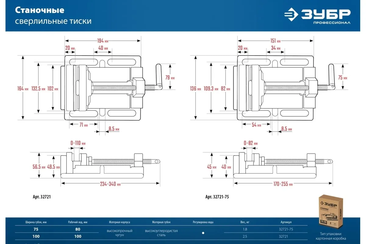 Станочные сверлильные тиски ЗУБР 100 мм 32721 предназначены для надежного закрепления заготовки размером не более 100 мм при её обработке на станках различного типа. В корпусе предусмотрены отверстия для крепления к станкам - сверлильным, фрезерным, шлифовальным. Это небольшая по габаритам и весу - всего 3.32 кг, но очень прочная конструкция из серого чугуна марки CЧ-20, выдерживает большие нагрузки. Сменные губки изготовлены из высококачественной стали, закалённой до 45-52 HRC и отшлифованы.