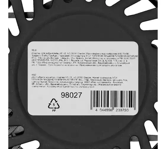 Стартер Denzel 98027 — пусковой механизм для виброплит Denzel VC-12 и VC-30W. Обеспечивает быстрый запуск двигателя. Предназначен для замены вышедшего из строя узла.