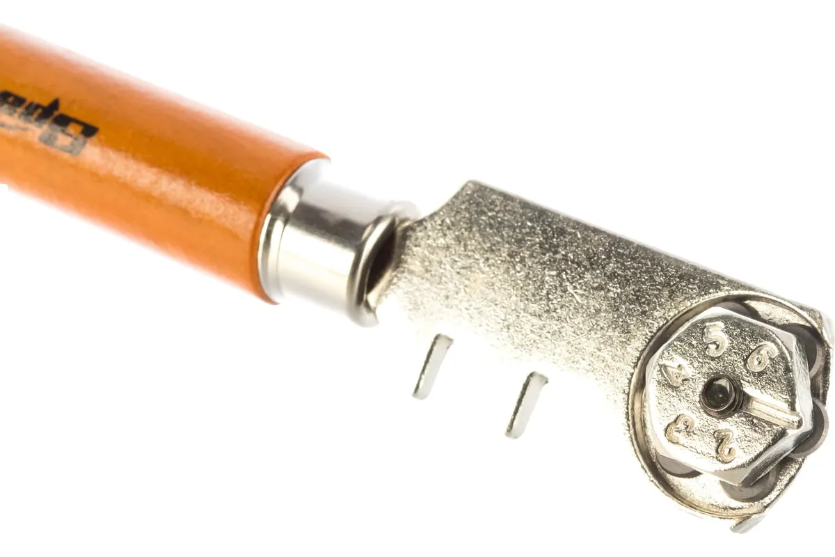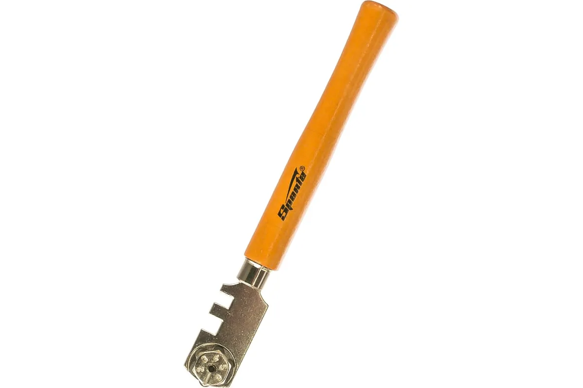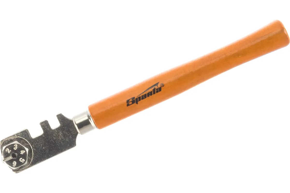Шестироликовый стеклорез SPARTA 872235 способен резать стекло различной толщины. Шесть режущих элементов изготовлены из твердого сплава ВК-8. Для удобной работы инструмент оборудован эргономичной рукояткой из лакированной древесины.