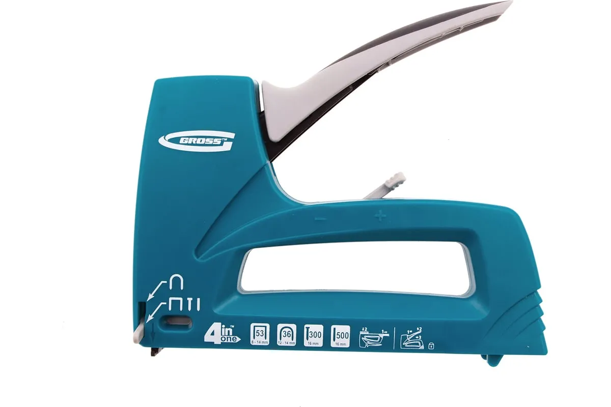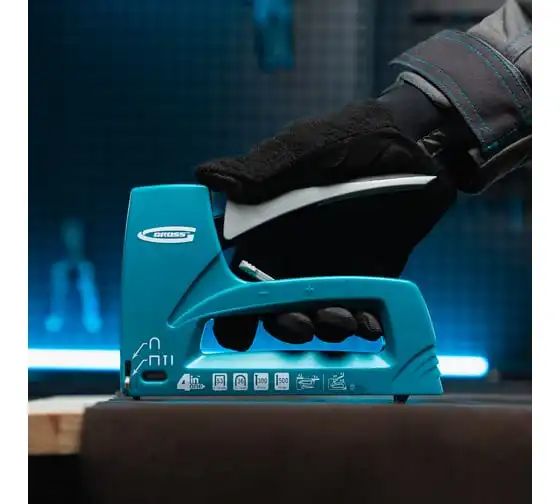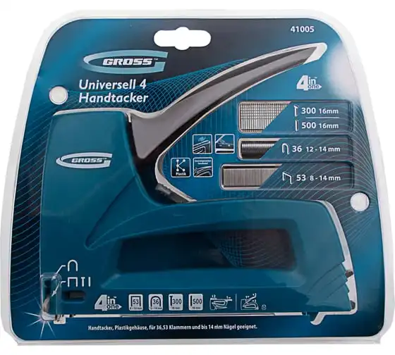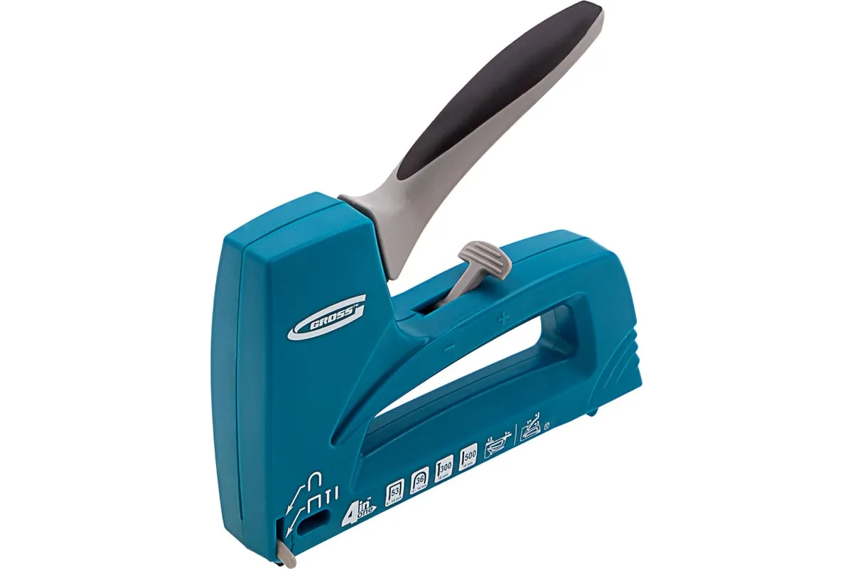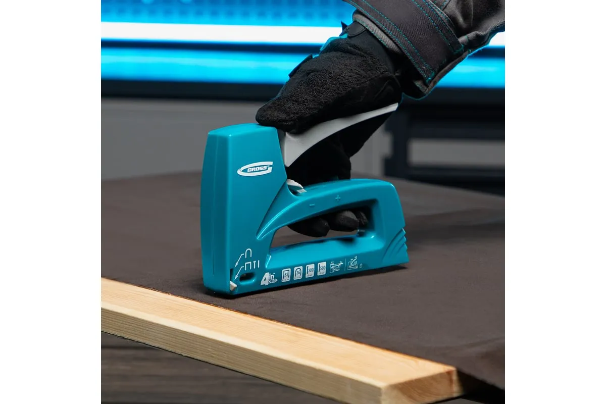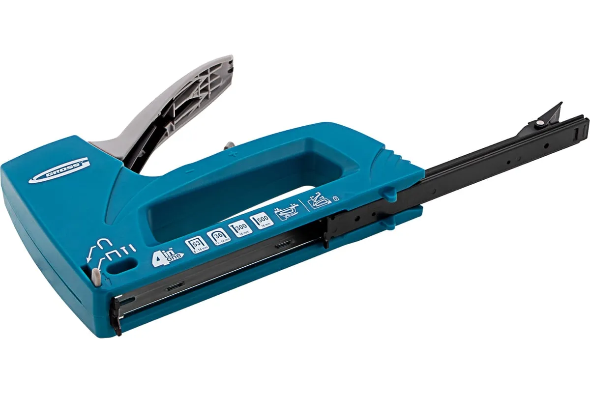 Пластиковый мебельный степлер Gross Universell 4 41005, 4-функциональный, — универсальный инструмент, совместимый со скобами типа 53 размером 8-14 м, 36 размером 12-14 мм, гвоздями типа 300 и штифтами типа 500 размером 16 мм. Предназначен для скрепления с деревянным основанием фанеры, картона, ДСП, ДВП, оргалита, пленки, утеплителя и других листовых материалов. Его используют для обивки мягкой мебели, сборки шкафов, монтажа низковольтных проводов, выполнения багетных и других крепежных работ.