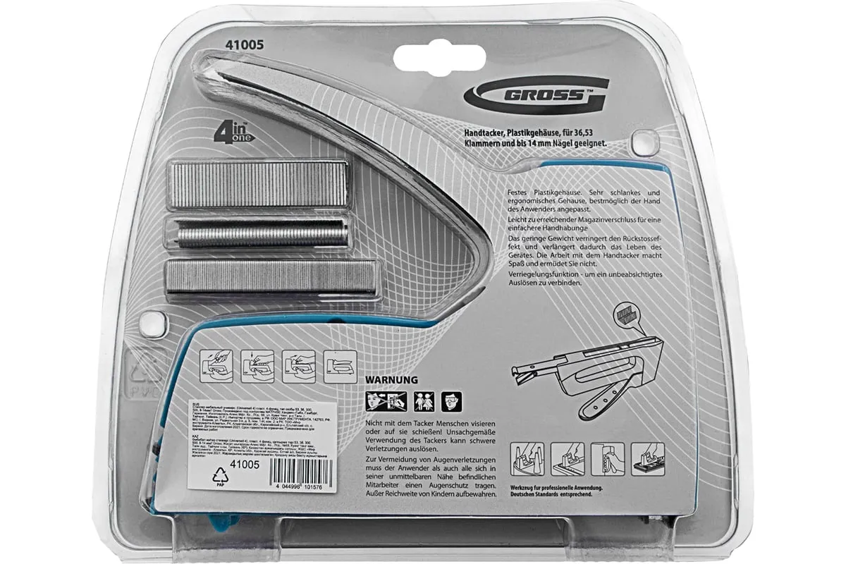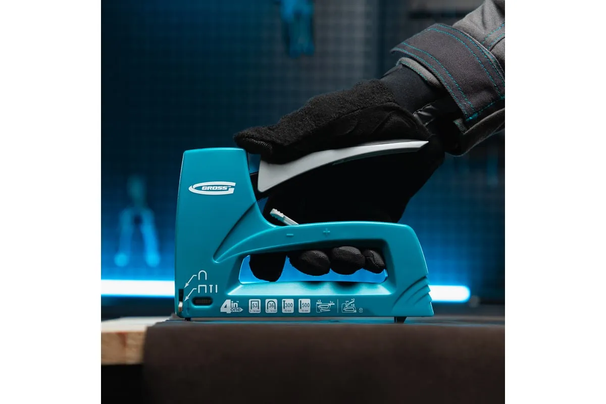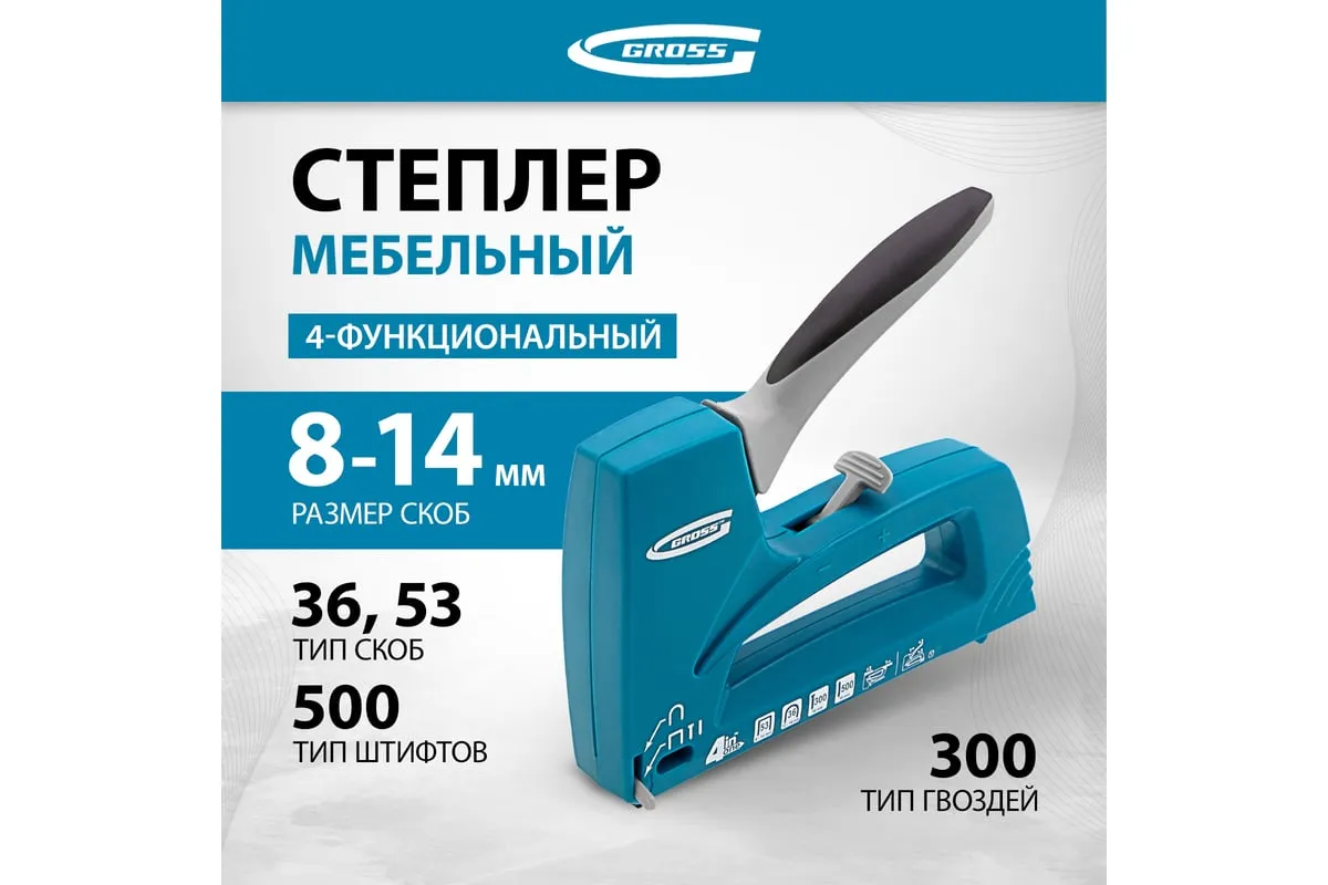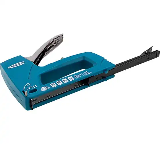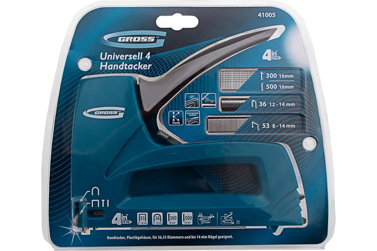 Пластиковый мебельный степлер Gross Universell 4 41005, 4-функциональный, — универсальный инструмент, совместимый со скобами типа 53 размером 8-14 м, 36 размером 12-14 мм, гвоздями типа 300 и штифтами типа 500 размером 16 мм. Предназначен для скрепления с деревянным основанием фанеры, картона, ДСП, ДВП, оргалита, пленки, утеплителя и других листовых материалов. Его используют для обивки мягкой мебели, сборки шкафов, монтажа низковольтных проводов, выполнения багетных и других крепежных работ.