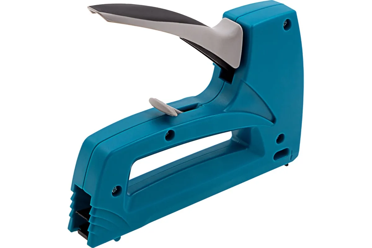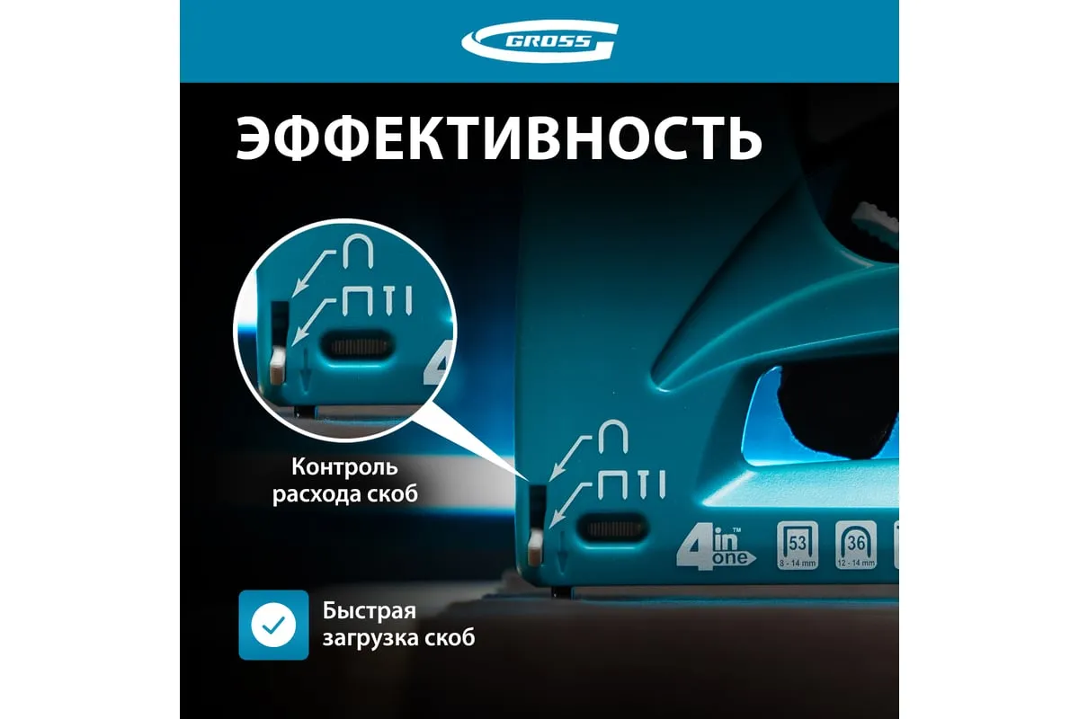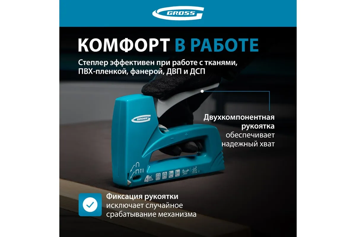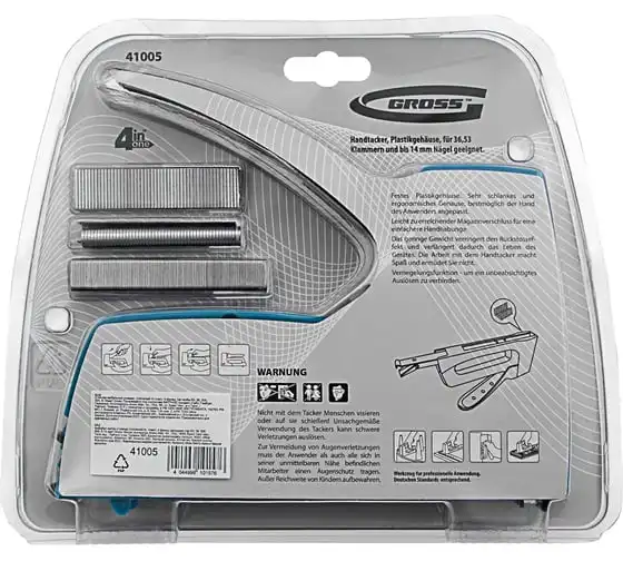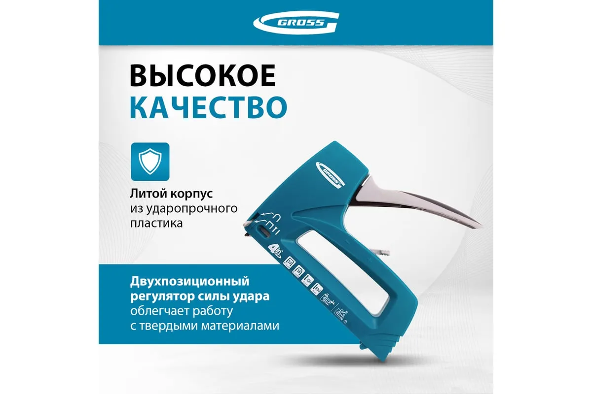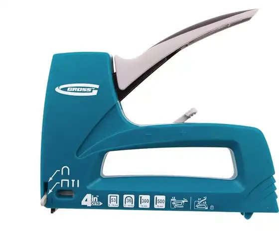 Пластиковый мебельный степлер Gross Universell 4 41005, 4-функциональный, — универсальный инструмент, совместимый со скобами типа 53 размером 8-14 м, 36 размером 12-14 мм, гвоздями типа 300 и штифтами типа 500 размером 16 мм. Предназначен для скрепления с деревянным основанием фанеры, картона, ДСП, ДВП, оргалита, пленки, утеплителя и других листовых материалов. Его используют для обивки мягкой мебели, сборки шкафов, монтажа низковольтных проводов, выполнения багетных и других крепежных работ.