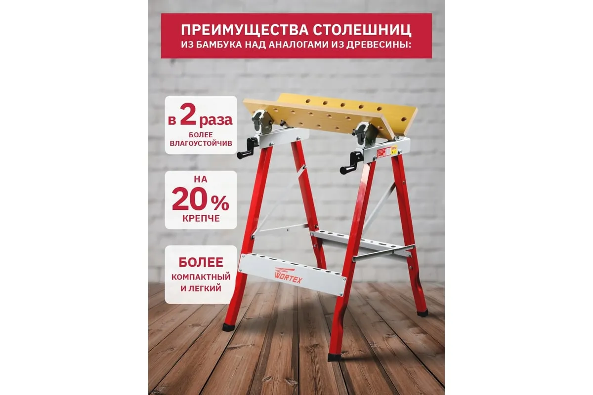 Прочная бамбуковая столешница обладает необходимой жесткостью и упругостью, обеспечивая надежную поддержку для самых разнообразных типов работ. Атмосферостойкое покрытие металлических частей увеличивает срок службы. Станок имеет надежную металлическую конструкцию, выдерживающую равномерную нагрузку в 100 кг.