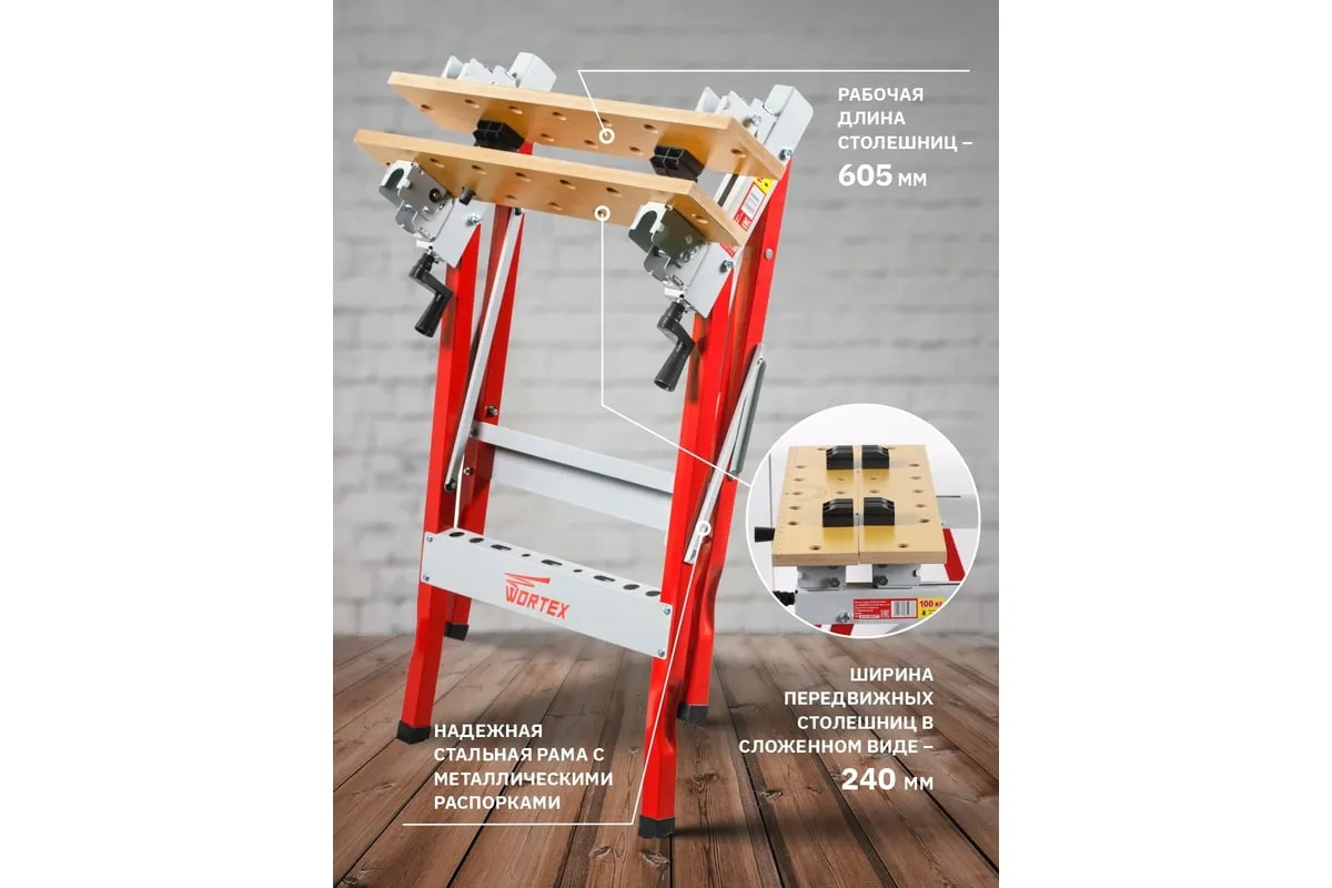 Верстак легко хранить и перевозить, благодаря складной конструкции. Также предусмотрены отверстия в столешнице для надежной фиксации заготовок. Возможно использовать для закрепления инструмента.