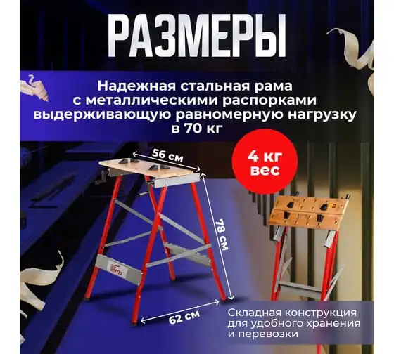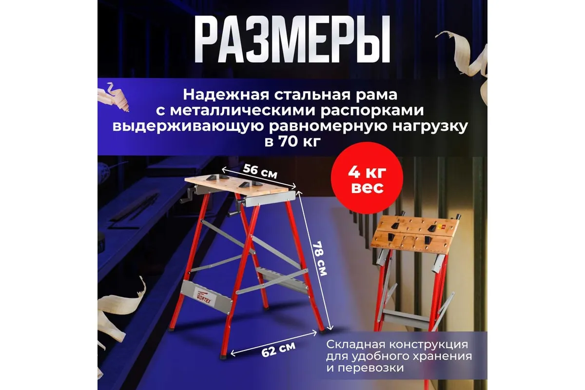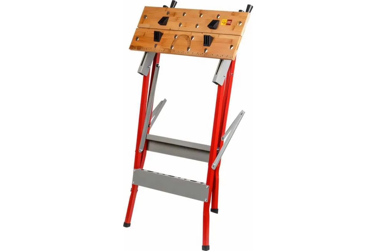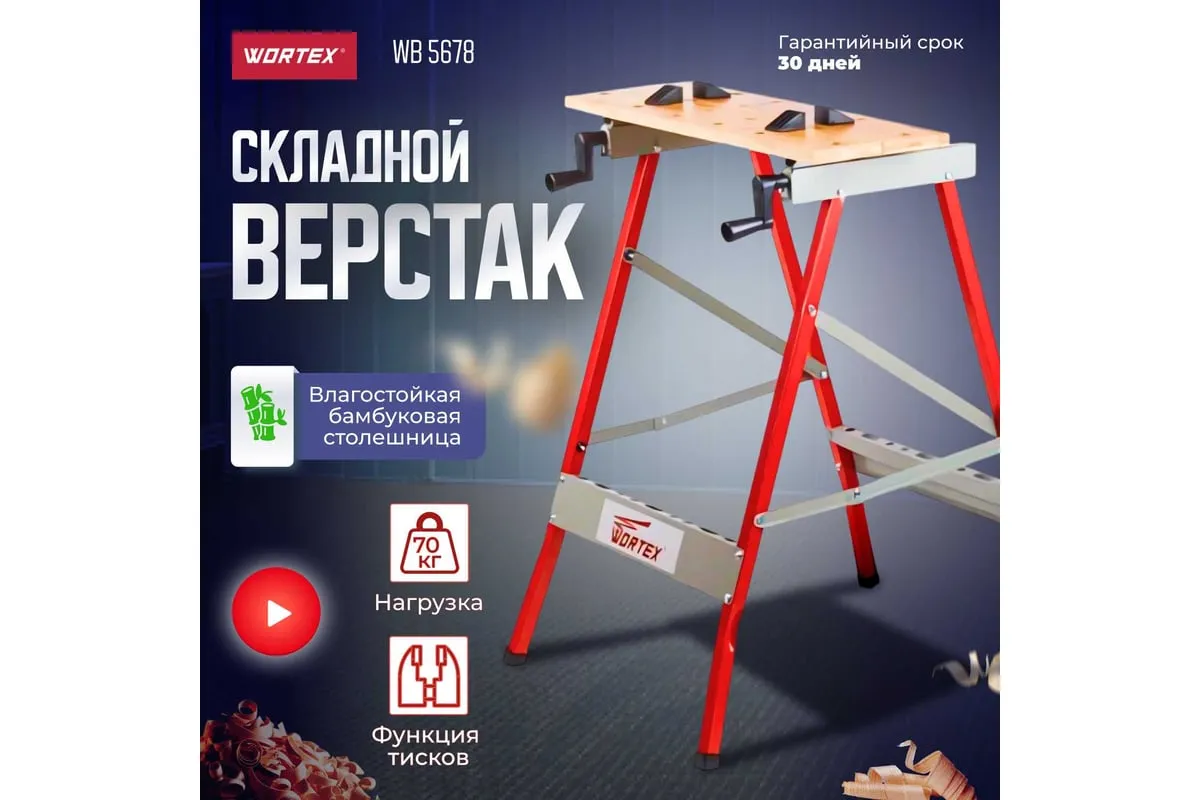 Столярный верстак WORTEX WB 5678 0329003 представляет собой многофункциональное устройство для облегчения обработки различных заготовок. Прочная бамбуковая столешница обладает необходимой жесткостью и упругостью, обеспечивая надежную поддержку для самых разнообразных типов работ. Атмосферостойкое покрытие металлических частей. В верстаке имеется функция тисков. Верстак легко хранить и перевозить, благодаря складной конструкции. Предусмотрены отверстия в столешнице для надежной фиксации заготовок. Возможно использовать для закрепления инструмента. Имеет надежную металлическую конструкцию выдерживающую равномерную нагрузку в 70 кг.
