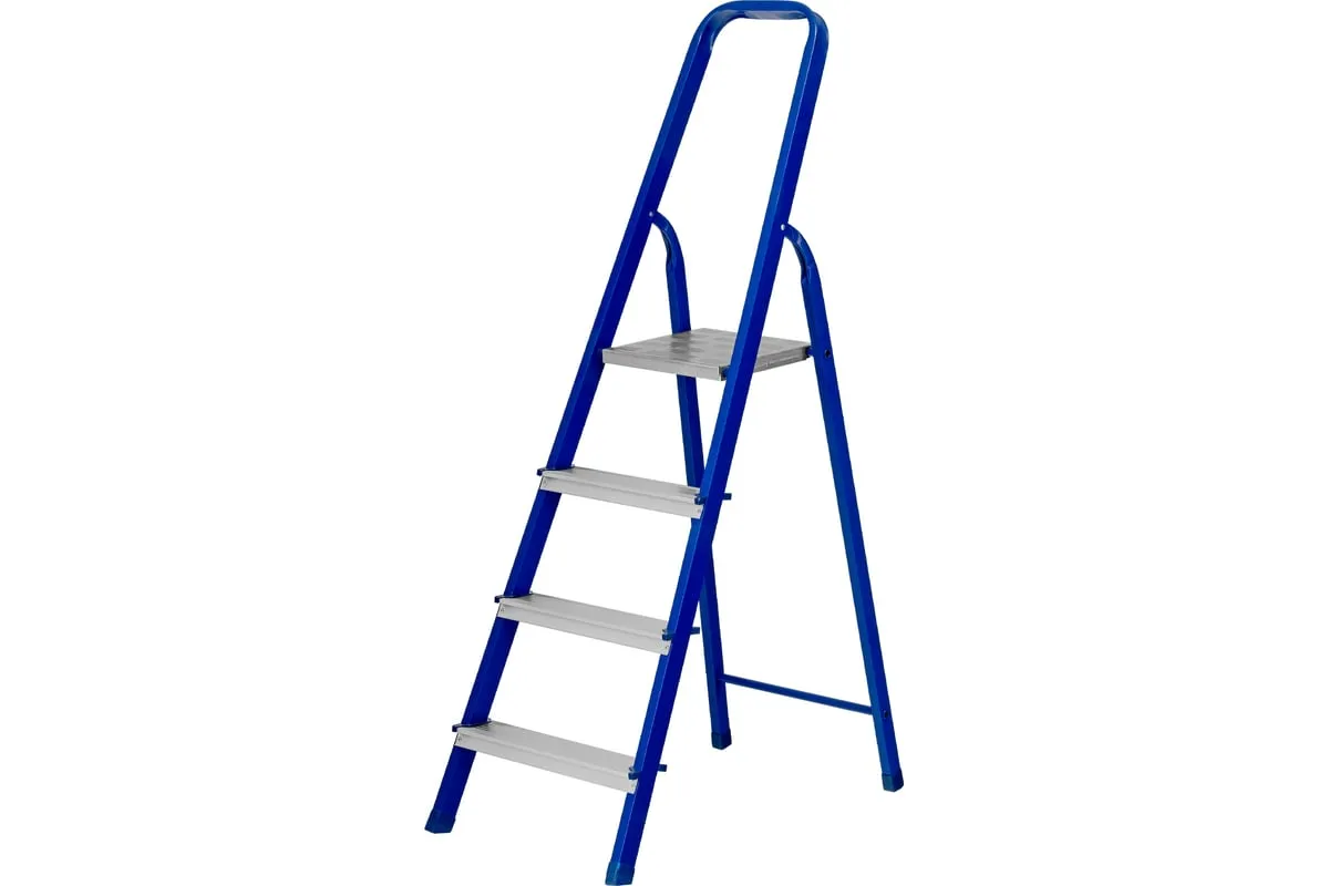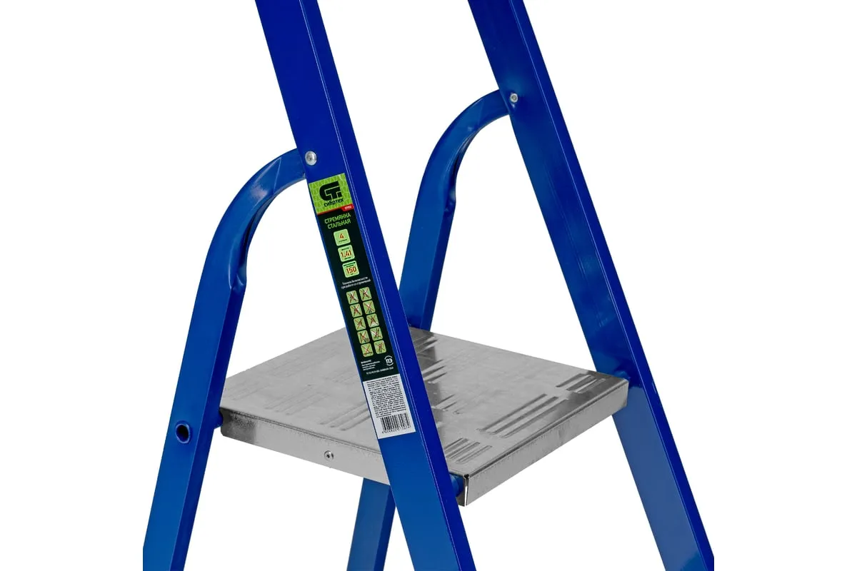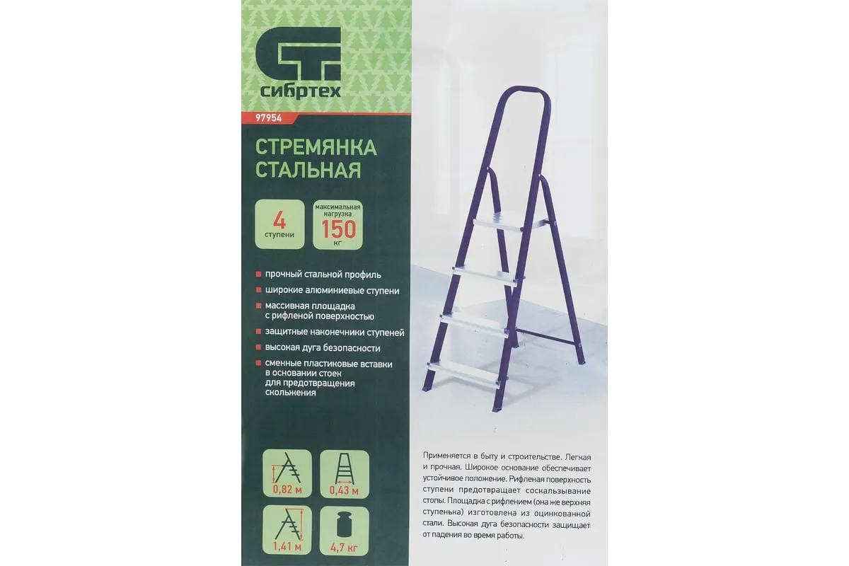 Стремянка Сибртех 97954 со стальным профилем и 4 алюминиевыми ступенями упрощает доступ к предметам, расположенным на антресолях, шкафах, высоких полках. Также будет полезна для проведения отделочных и монтажных работ. Лестница обладает высокой прочностью при весе 5,2 кг и выдерживает нагрузку до 150 кг. Площадка находится на высоте 79,4 см от опорной поверхности, рабочая высота стремянки составляет 279,4 см (при среднем росте пользователя 170 см). Стремянку следует устанавливать на ровную поверхность, работать на ней с электроинструментом нельзя.
