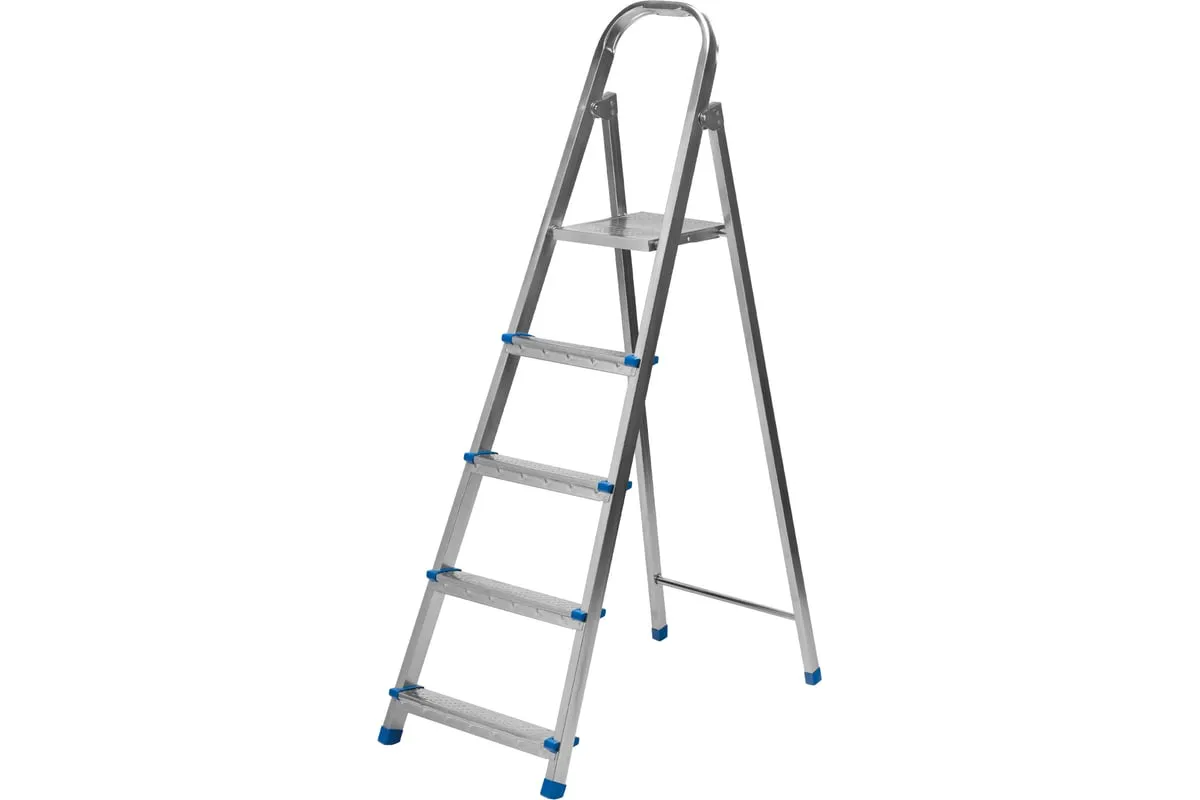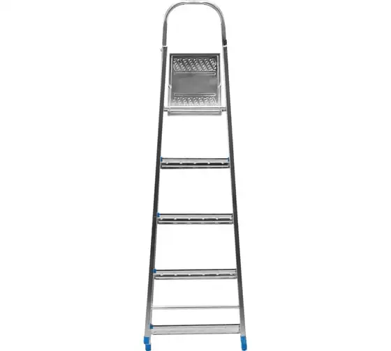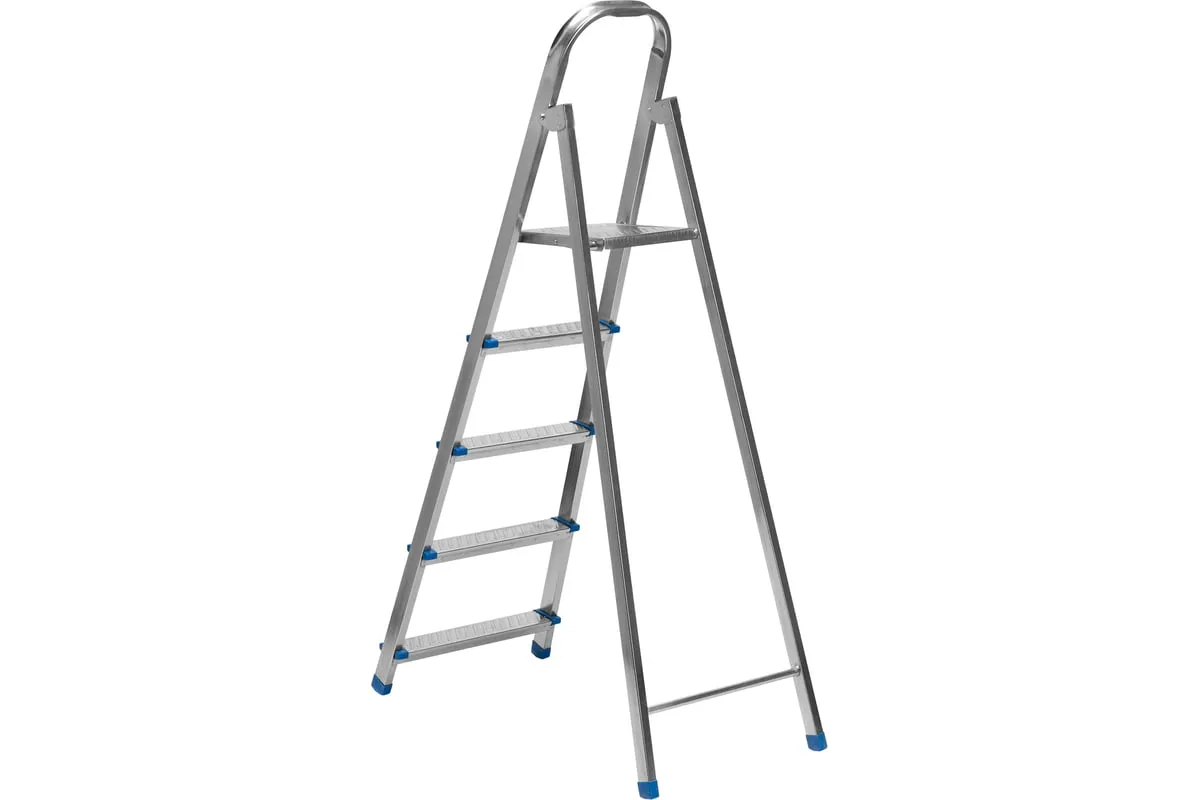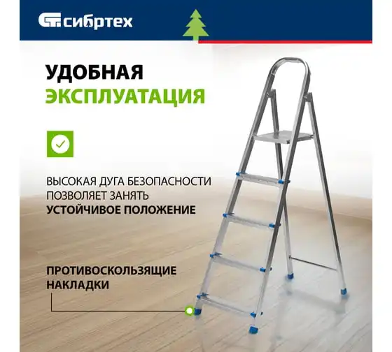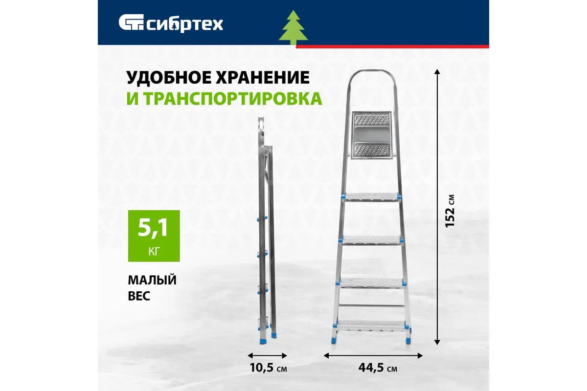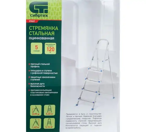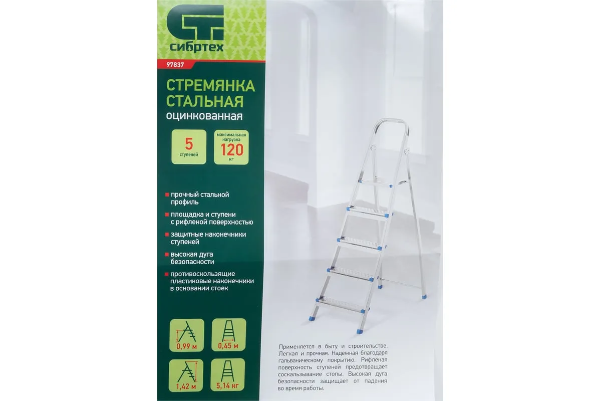 Стальная оцинкованная стремянка Сибртех 97837 с 5 ступенями позволяет повесить полку, картину или шкафчик, достать нужный предмет и решить другие задачи, для которых требуется доступ к предметам на высоте. Рама и ступени из стального профиля выдерживают вес до 120 кг. Расстояние от опорной поверхности до площадки составляет 99 см, при среднем росте пользователя 170 см рабочая высота лестницы — 299 см. Необходимо соблюдать технику безопасности: размещать стремянку только на ровной плоскости и не использовать ее для работы с дрелью, шуруповертом и другим электроинструментом.