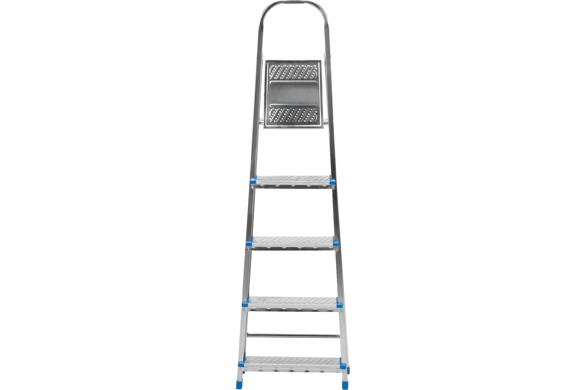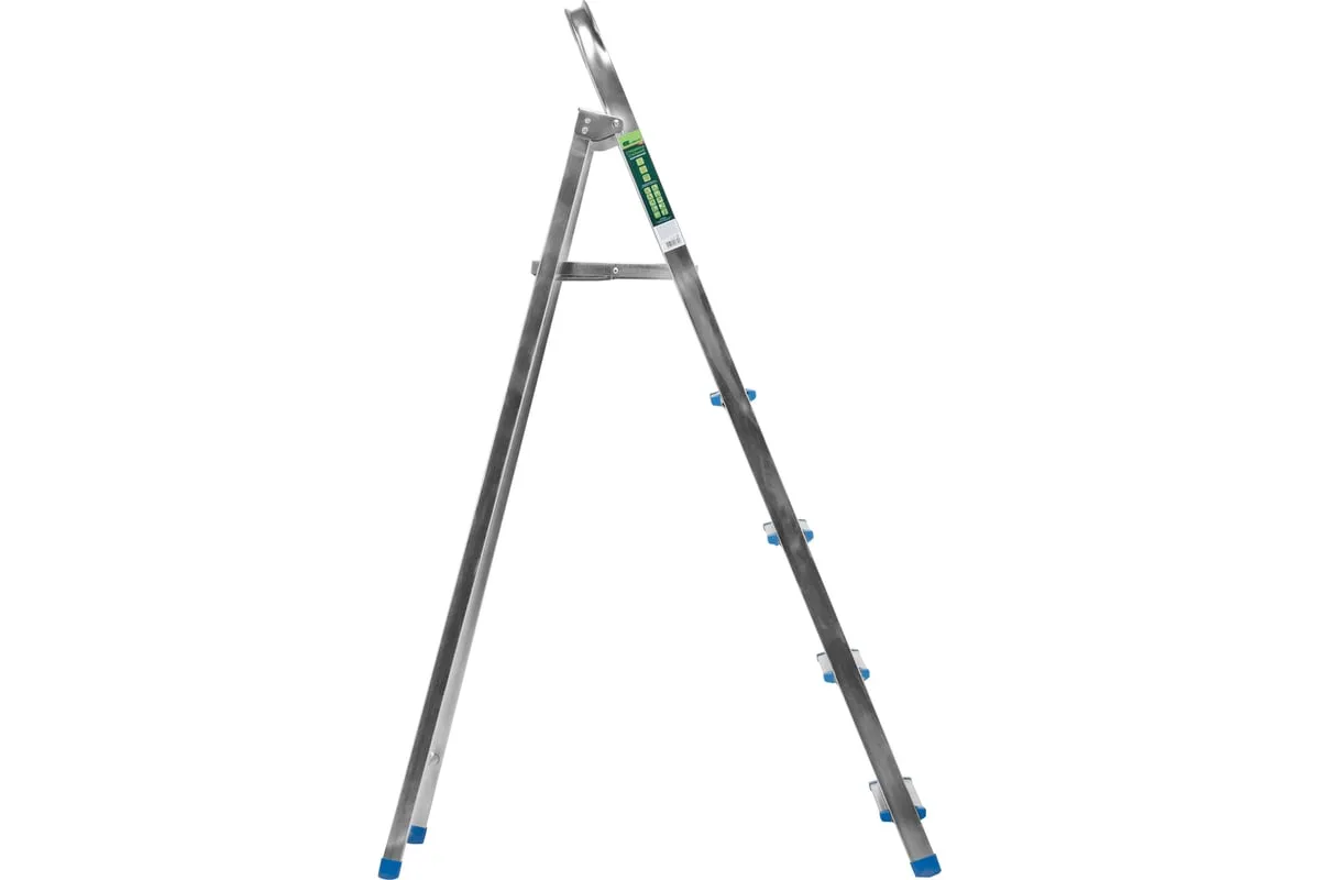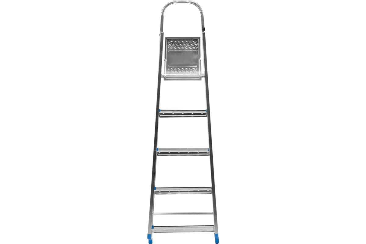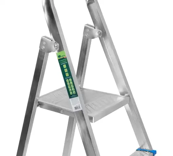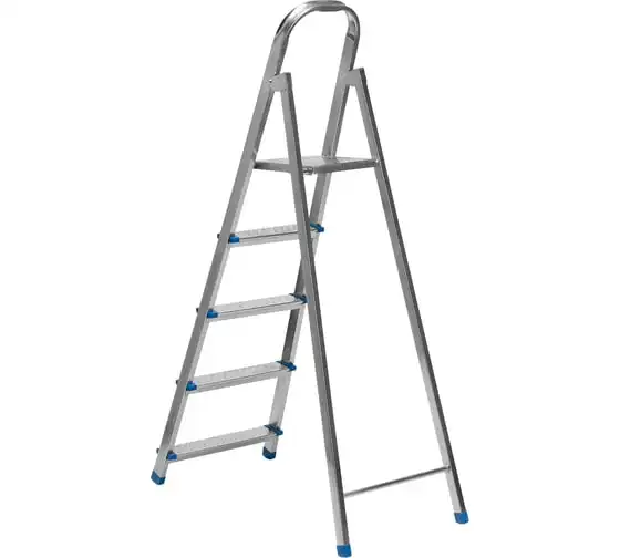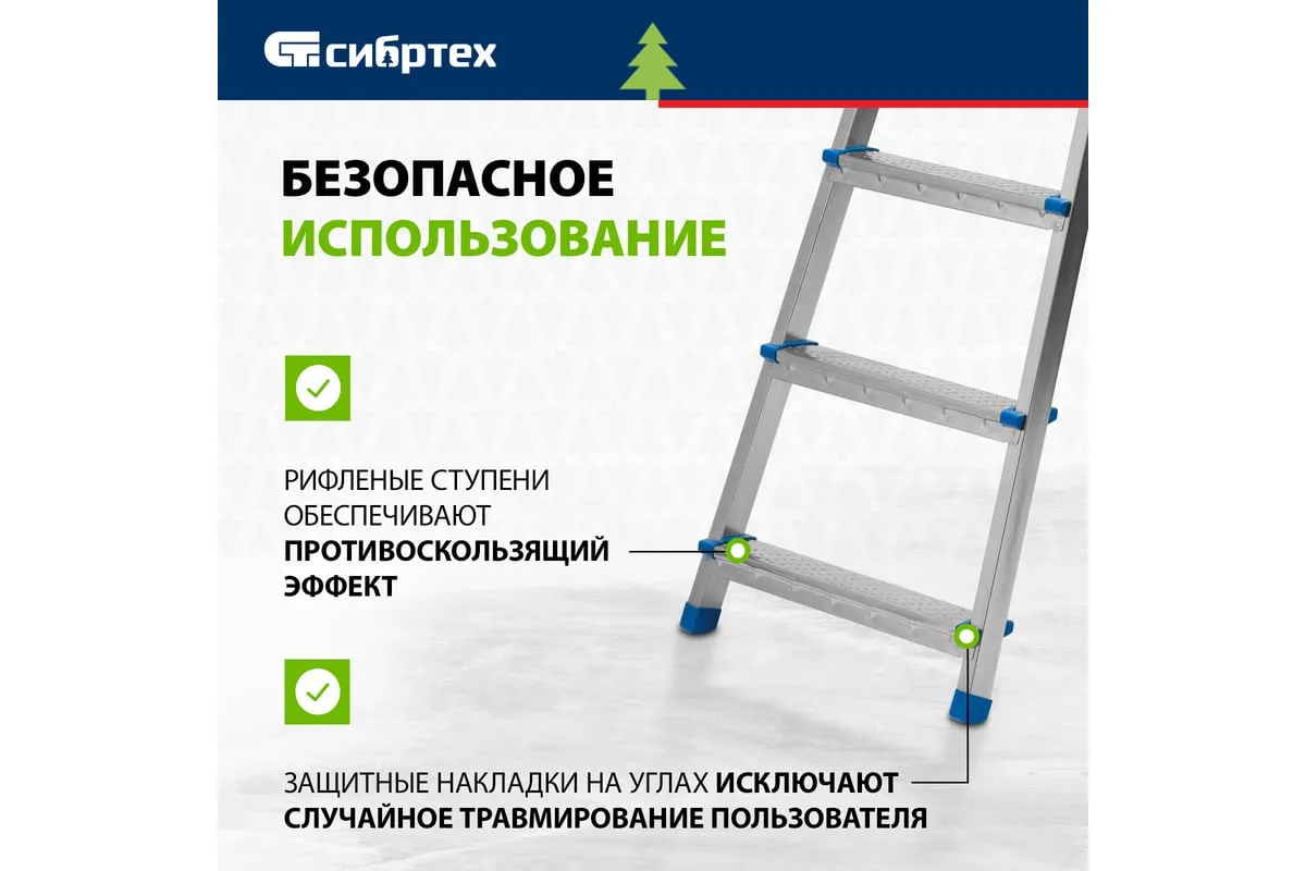 Стальная оцинкованная стремянка Сибртех 97837 с 5 ступенями позволяет повесить полку, картину или шкафчик, достать нужный предмет и решить другие задачи, для которых требуется доступ к предметам на высоте. Рама и ступени из стального профиля выдерживают вес до 120 кг. Расстояние от опорной поверхности до площадки составляет 99 см, при среднем росте пользователя 170 см рабочая высота лестницы — 299 см. Необходимо соблюдать технику безопасности: размещать стремянку только на ровной плоскости и не использовать ее для работы с дрелью, шуруповертом и другим электроинструментом.