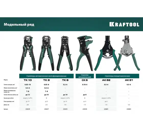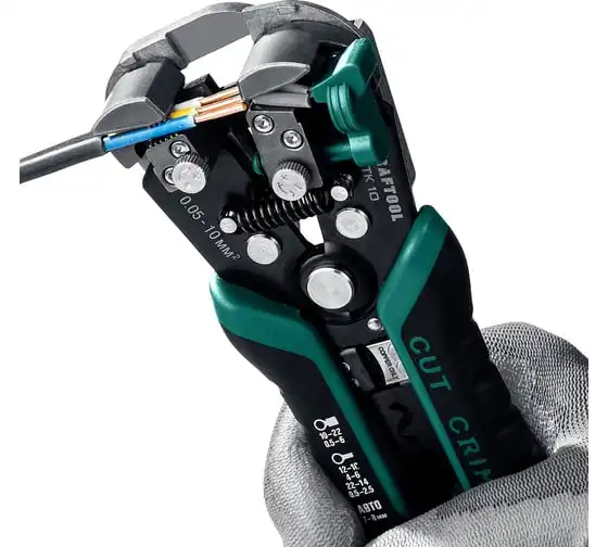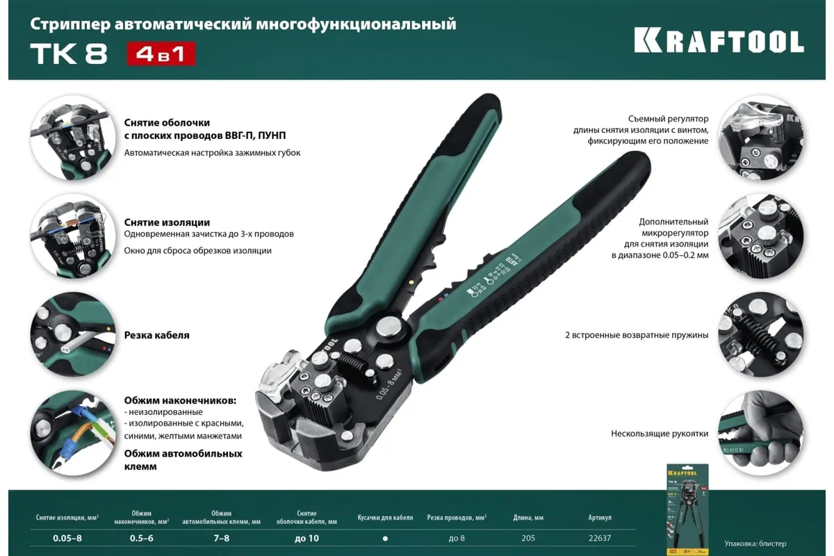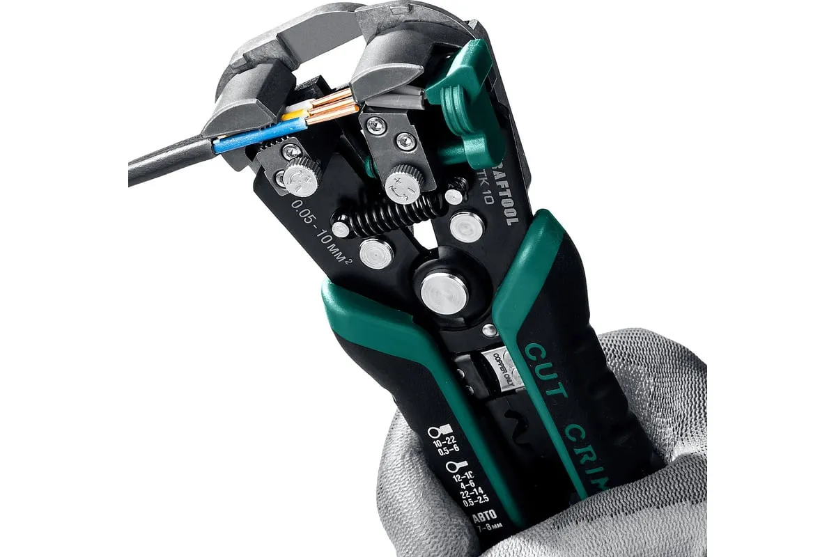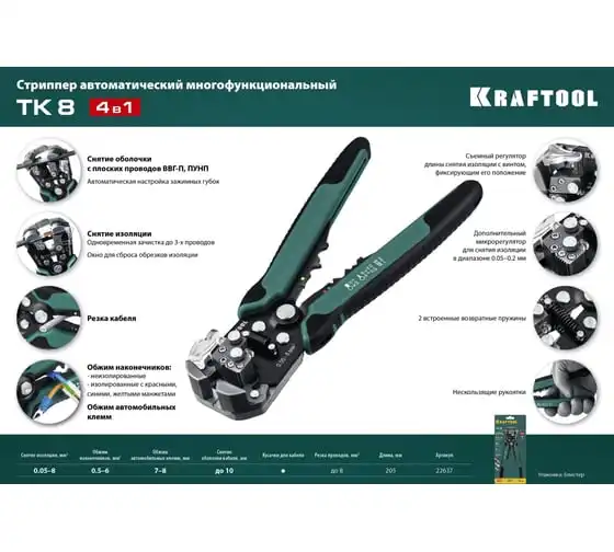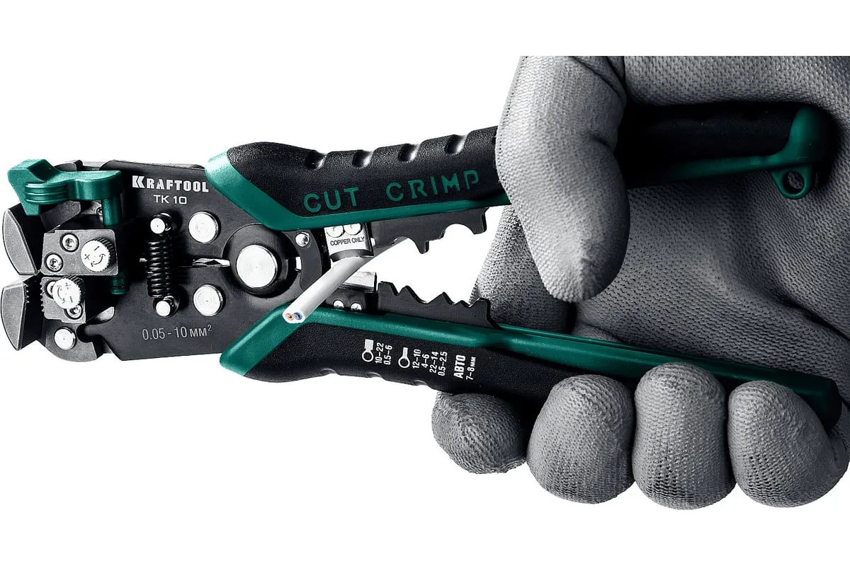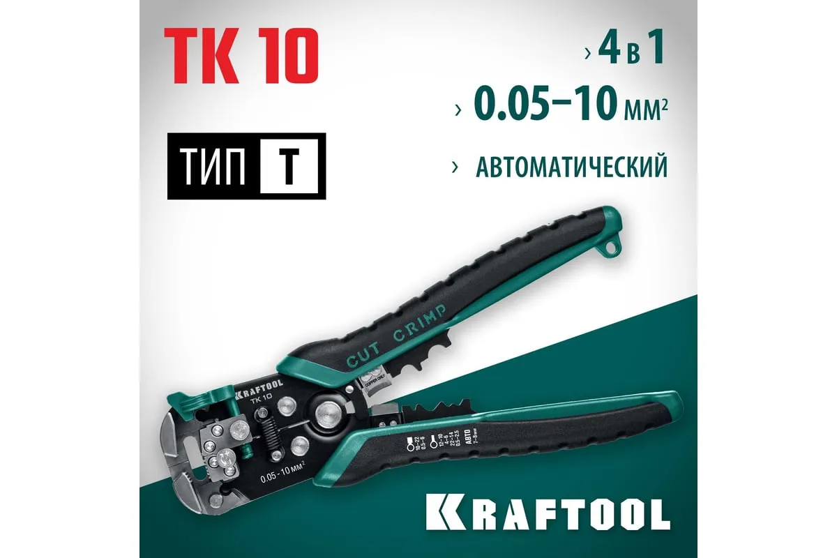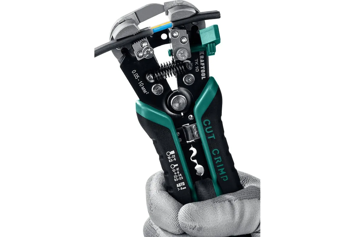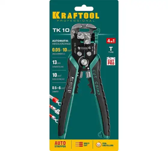 Стриппер KRAFTOOL TK-10 автоматический, многофункциональный, 0.05 - 10 мм2, 22639 предназначен для снятия изоляции без повреждения внутренних жил. Инструменты для снятия изоляции KRAFTOOL, изготовлены из высококачественной стали с закалкой рабочих поверхностей, предназначены для профессионального применения. Обладают повышенным ресурсом, обеспечивают наивысшее качество электромонтажных работ. Автоматическая настройка зажимных губок, одновременная зачистка до 3-х проводов, а также окно для сброса обрезков изоляции. Съемный регулятор длины снятия изоляции с винтом, фиксирующим его положение. Дополнительный микрорегулятор для снятия изоляции в диапазоне 0.05–0.2 мм.
