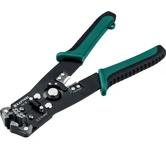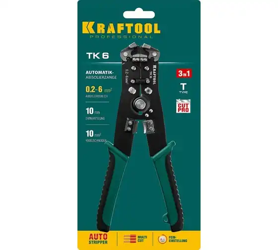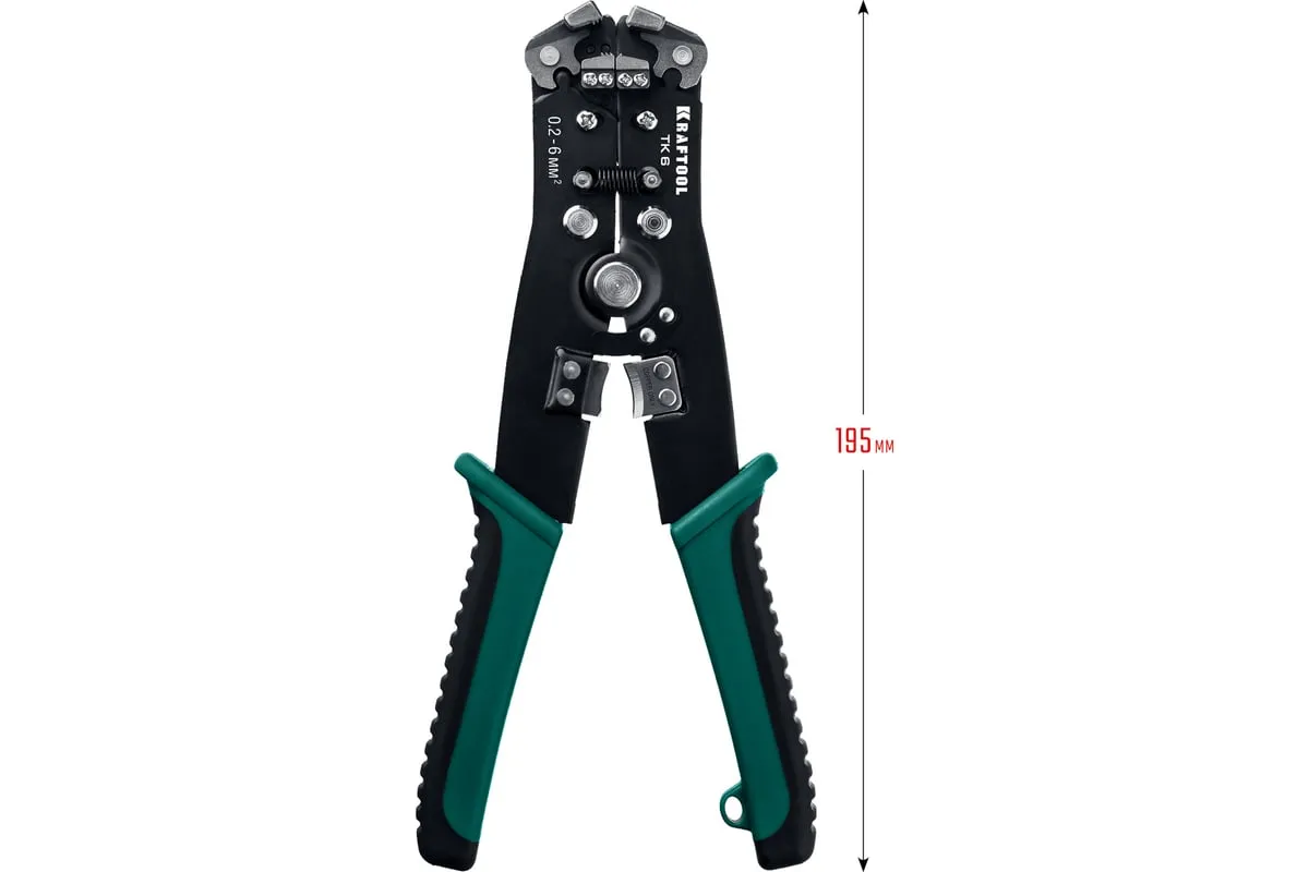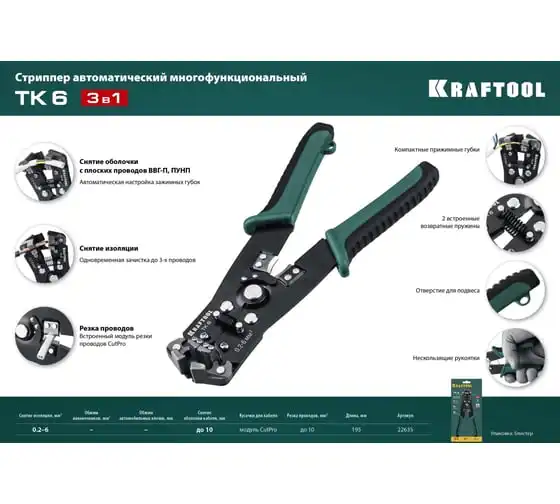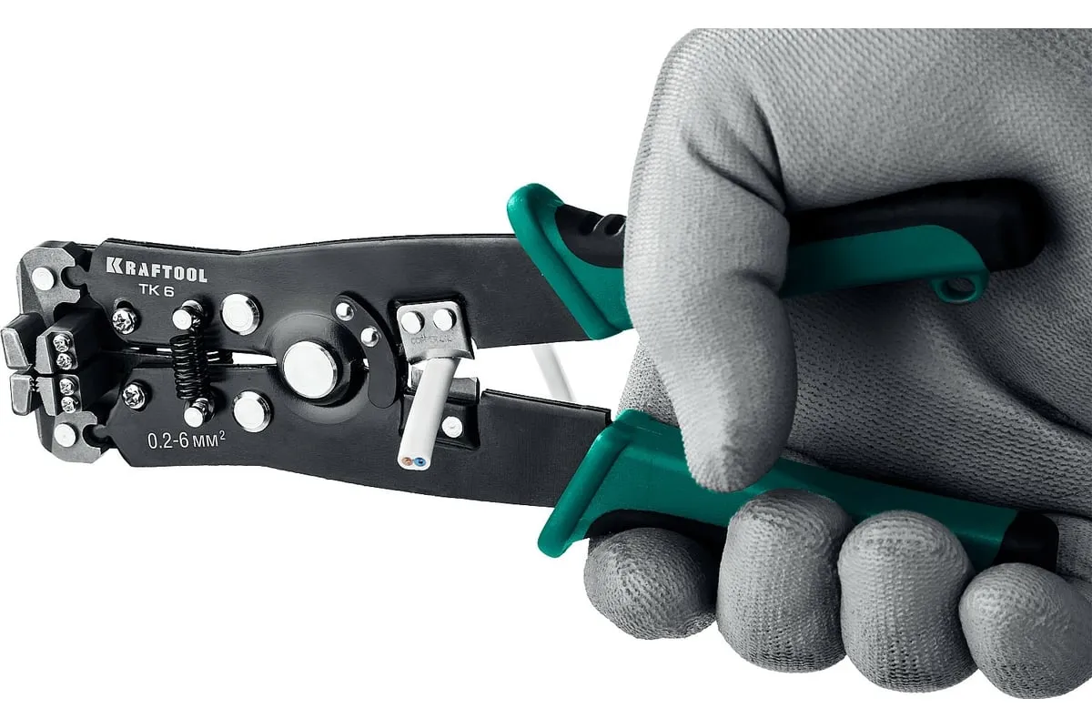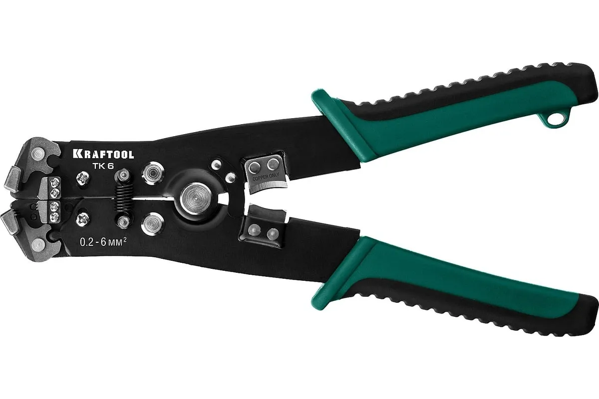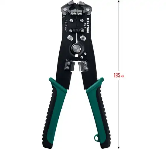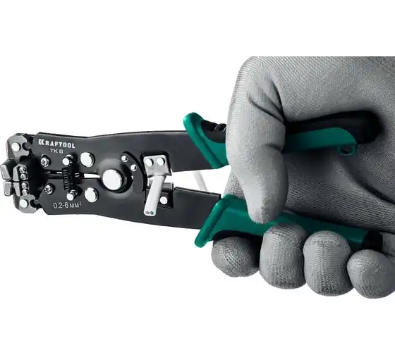 Стриппер автоматический многофункциональный, 0.2 - 6 мм2, KRAFTOOL TK-6 22635 предназначен для снятия изоляции при зачистке проводов и кабелей, опрессовки изолированных и неизолированных наконечников, резки кабелей, отрезания латунных болтов.