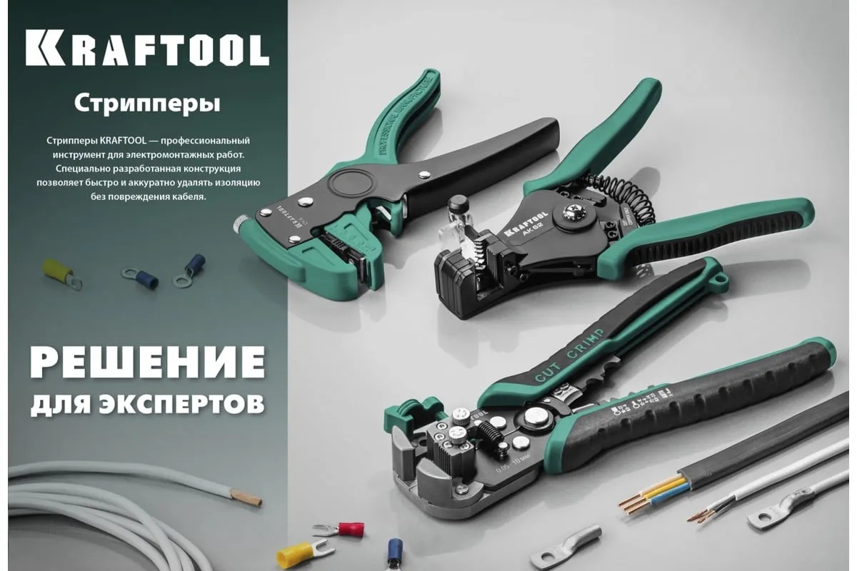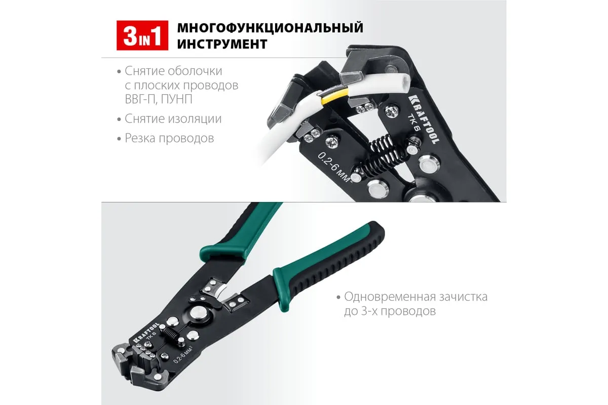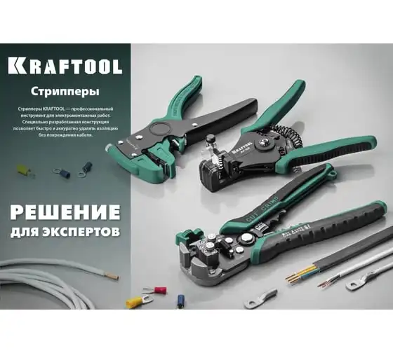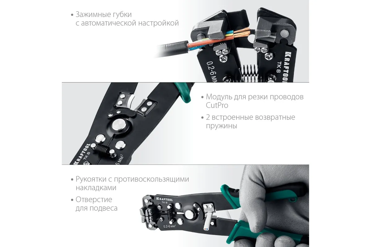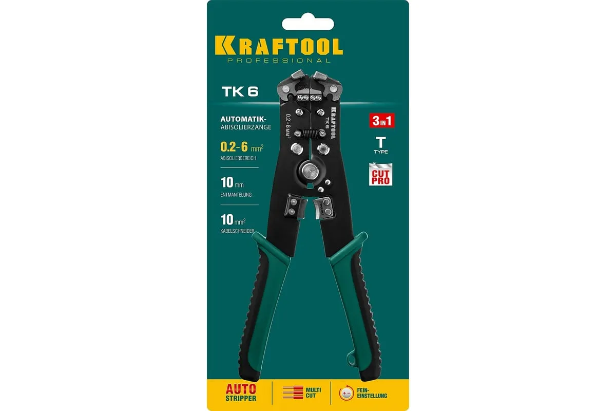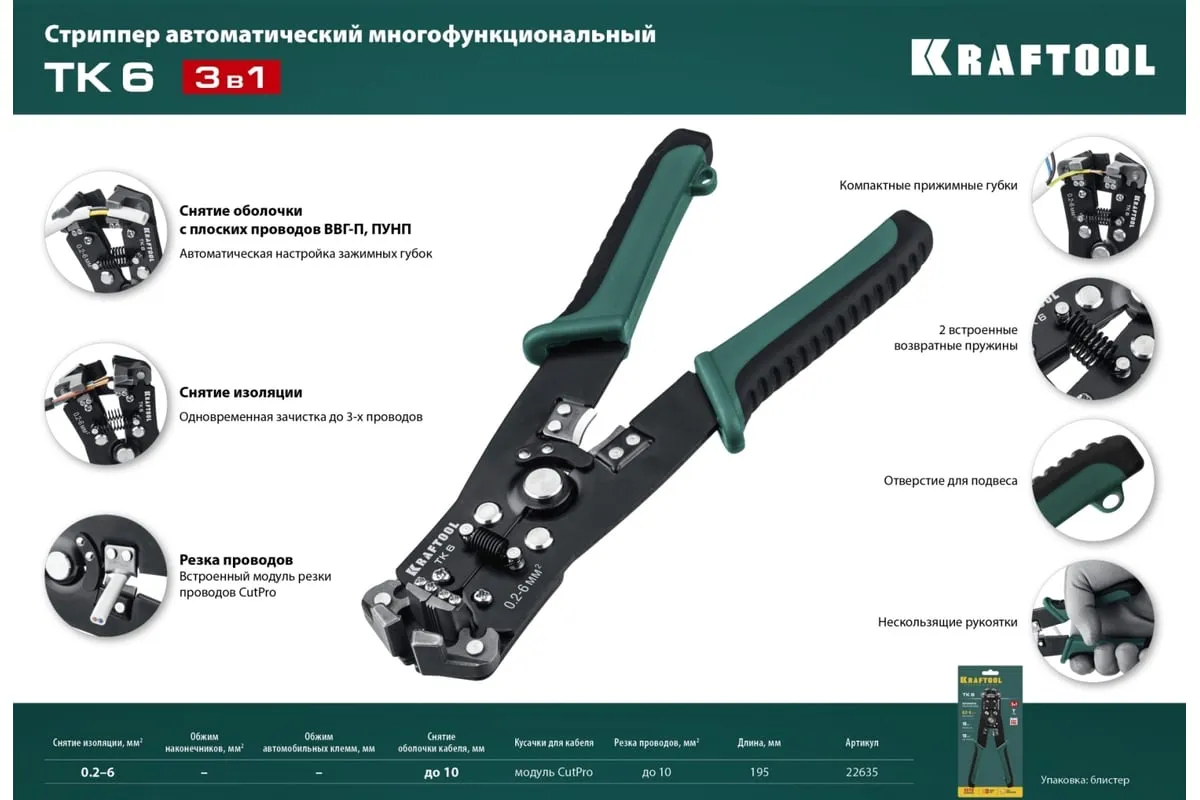 Стриппер автоматический многофункциональный, 0.2 - 6 мм2, KRAFTOOL TK-6 22635 предназначен для снятия изоляции при зачистке проводов и кабелей, опрессовки изолированных и неизолированных наконечников, резки кабелей, отрезания латунных болтов.