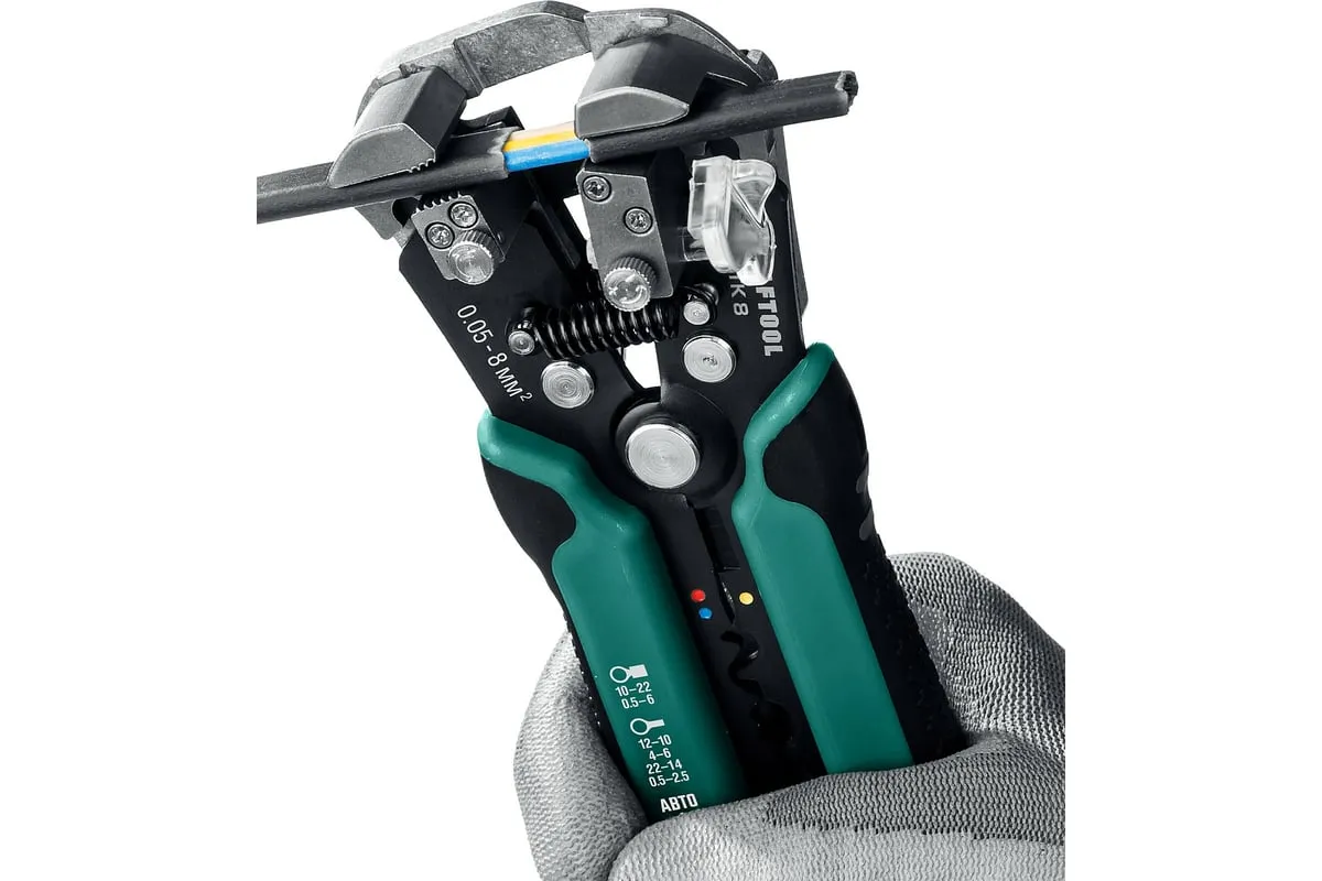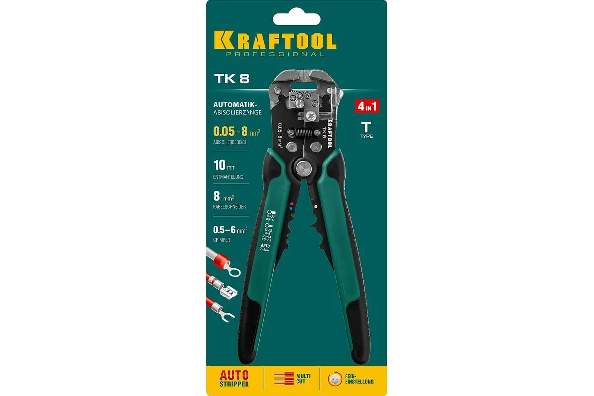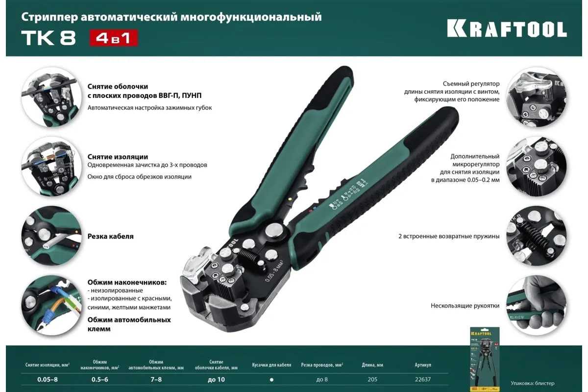 Стриппер KRAFTOOL TK-8 автоматический, многофункциональный, 0.05 - 8 мм2, 22637 предназначен для снятия изоляции без повреждения внутренних жил. Инструменты для снятия изоляции KRAFTOOL, изготовлены из высококачественной стали с закалкой рабочих поверхностей, предназначены для профессионального применения. Обладают повышенным ресурсом, обеспечивают наивысшее качество электромонтажных работ. Обжим изолированных наконечников: 0.5-6 мм2. Обжим неизолированных наконечников: 0.5- 2.5; 4.0-6.0 мм2. Снятие оболочки с плоских проводов ВВГ-П, ПУНП .Обжим автомобильных клемм 7-8 мм. Автоматическое снятие изоляции 0,13-6 мм² . Дополнительный микрорегулятор для снятия изоляции 0,05 мм² и 8 мм²