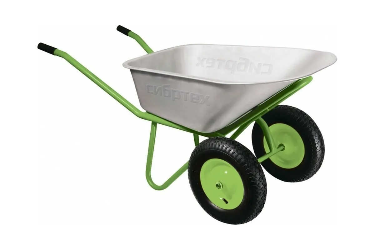 Строительная двухколесная облегченная тачка СИБРТЕХ 90л, 230кг 689643 предназначена для перемещения грузов во время работы на строительной площадке или в саду. В ней можно перевозить грунт, щебень или строительные смеси. У тачки 2 колеса, что обеспечивает ей грузоподъемность 230 кг, а также устойчивость во время движения по прямой и на поворотах. Вес груза распределяется равномерно, поэтому тачка не проваливается в рыхлый грунт. Колеса можно заменить, совместимые артикулы 68972, 68976, 689765, 68948, 689485, 68953, 68977, 689775.