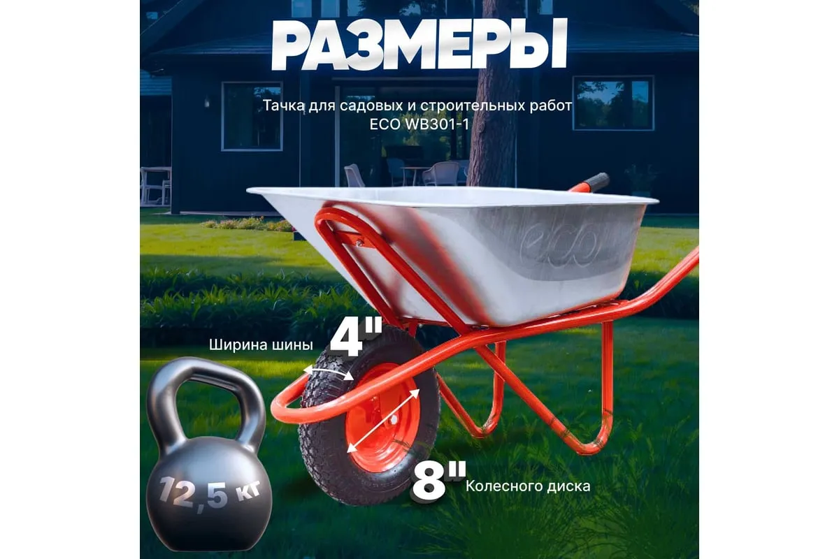 Строительная тачка ECO WB301-1 подходит для перевозки сыпучих материалов, земли и компоста.