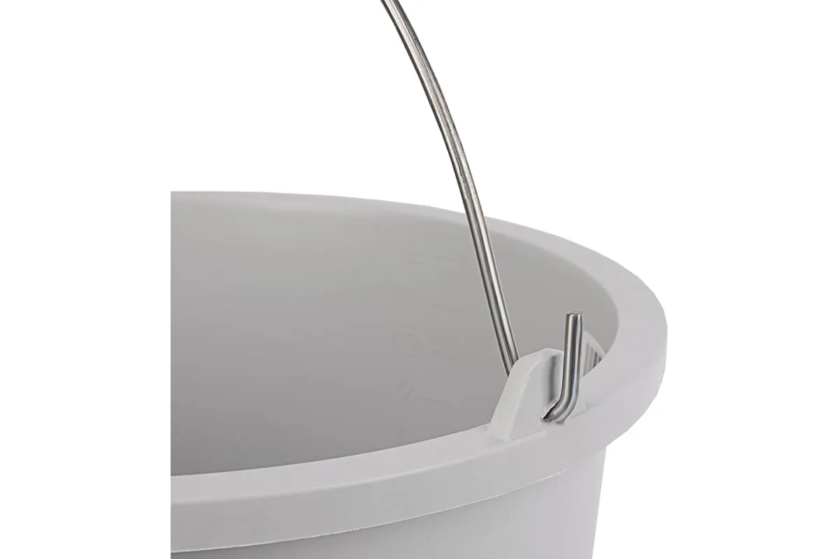 Ведро изготовлено из ударопрочного пластика, а ручка — из оцинкованной стали, устойчивой к коррозии, что обеспечивает надежность и долговечность изделия.