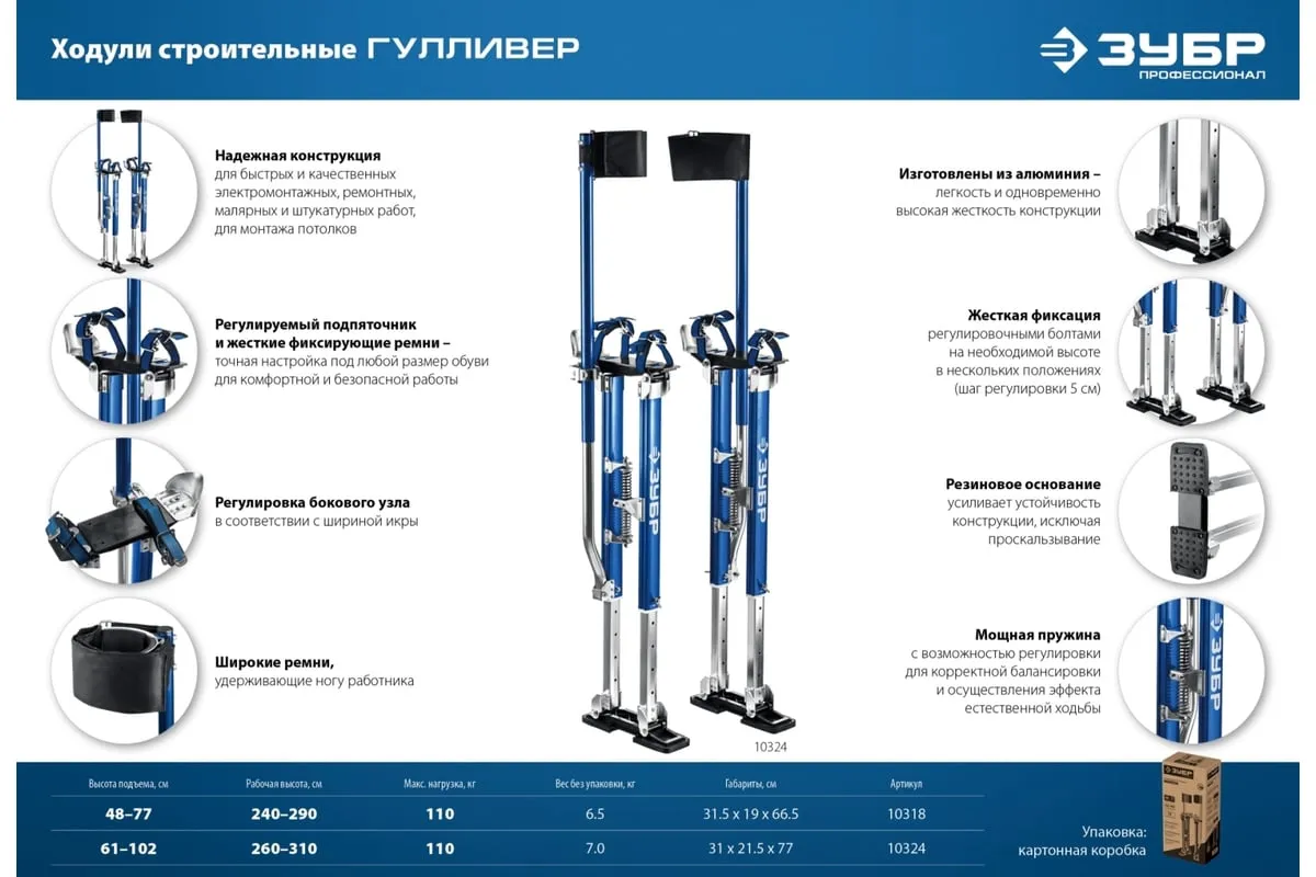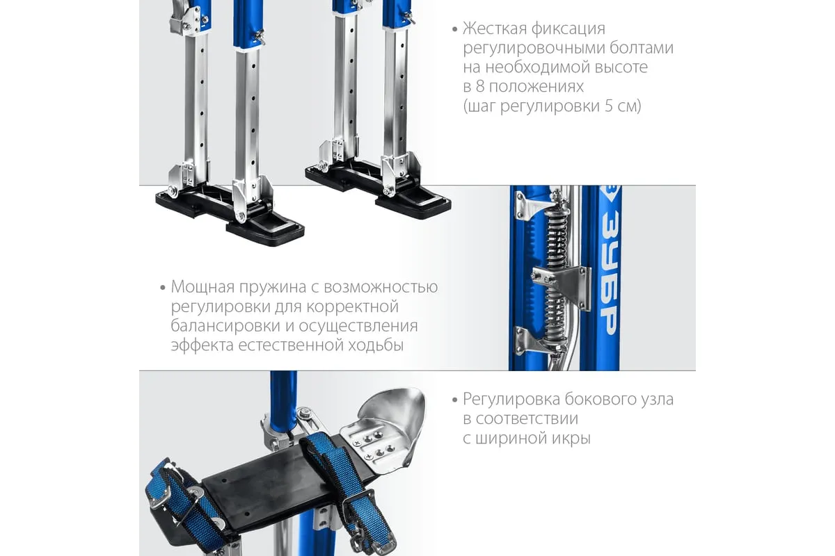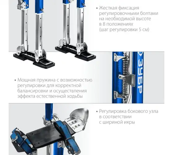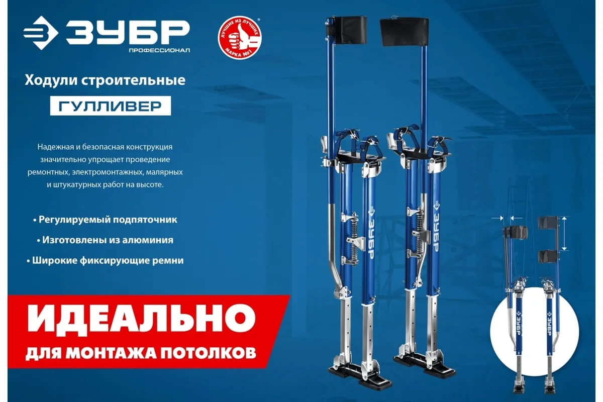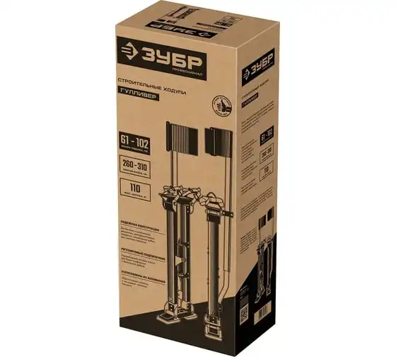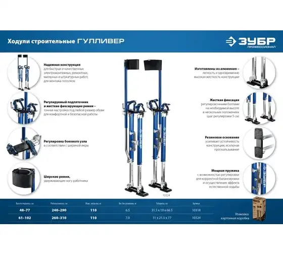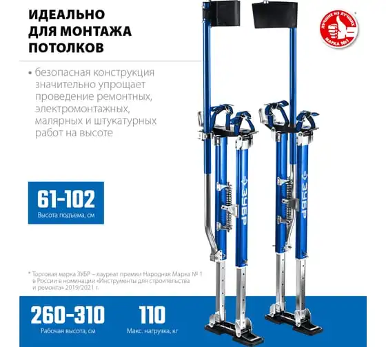 Строительные ходули ЗУБР 610-1020 мм 10324 - это мощная, надежная и безопасная конструкция для быстрых и качественных ремонтных, электромонтажных, малярных, штукатурных работ на высоте 2.6-3.1 метров. Идеальное решение для монтажа потолков.