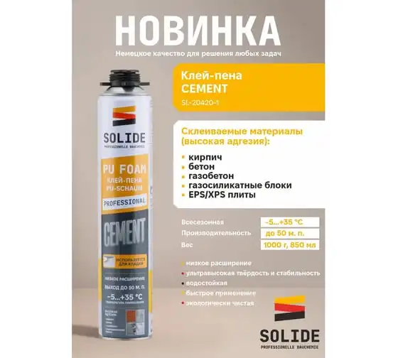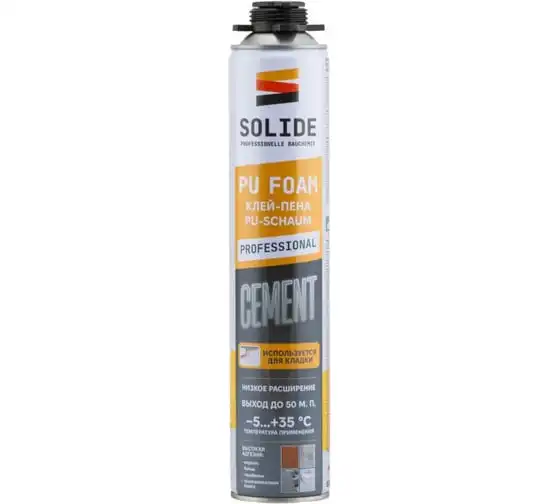 Клей-пена SOLIDE полиуретановая професс. Cement (850 мл) ЦЗ-2019427575