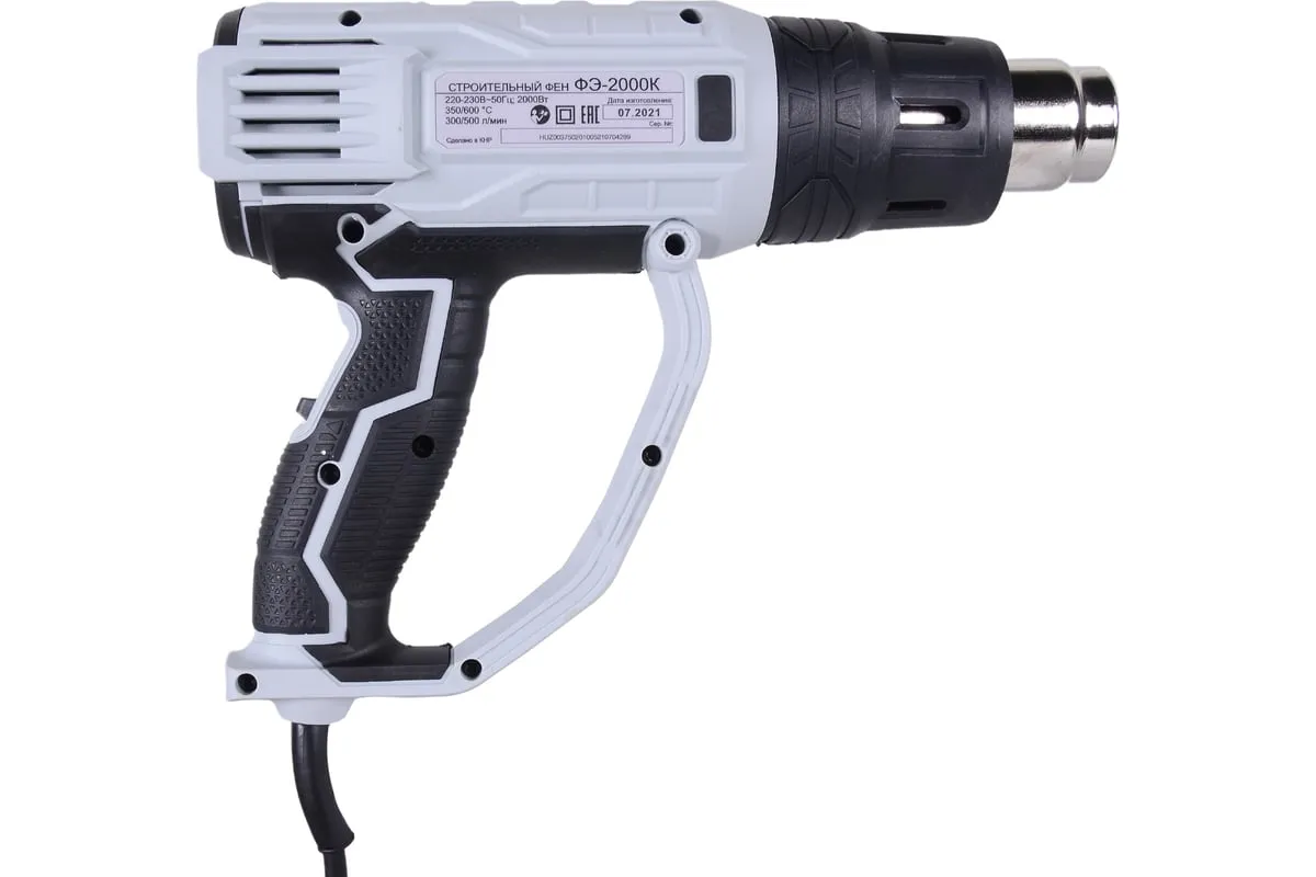 Фен промышленный РЕСАНТА ФЭ-2000К мощностью 2000 Вт применяется для ремонтных и строительных работ в быту и профессиональной деятельности. Инструмент имеет 2 режима работы. Они отличаются температурой 350/600 °С и воздушным потоком 300/500 л/мин. Это позволяет регулировать интенсивность рабочего процесса в зависимости от целей и используемого материала. Автоотключение в случае перегрева защищает электродвигатель от перегрузок.