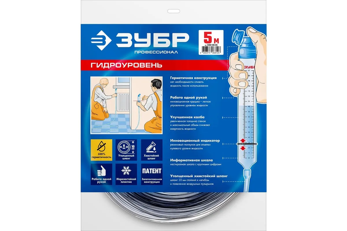 Строительный гидроуровень ЗУБР Профессионал 5 м 3482-08-05 - измерительный прибор, с помощью которого можно точно определить и выровнять расположение верхних элементов строительной конструкции, относительно горизонтальной плоскости. В основе работы - принцип сообщающихся сосудов. Прибор состоит из пары колб, соединенных длинным прозрачным шлангом диаметром - 8 мм. Дополнительные характеристики: